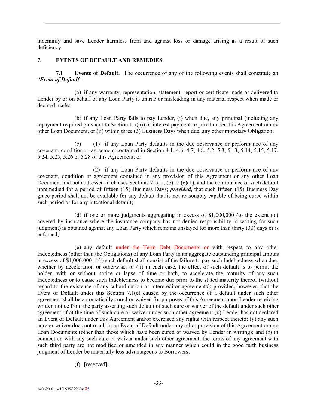 indemnify and save Lender harmless from and against loss or damage arising as a result of such deficiency. 7. EVENTS OF DEFAULT AND REMEDIES. 7.1 Events of Default. The occurrence of any of the following events shall constitute an “Event of Default”: (a) if any warranty, representation, statement, report or certificate made or delivered to Lender by or on behalf of any Loan Party is untrue or misleading in any material respect when made or deemed made; (b) if any Loan Party fails to pay Lender, (i) when due, any principal (including any repayment required pursuant to Section 1.7(a)) or interest payment required under this Agreement or any other Loan Document, or (ii) within three (3) Business Days when due, any other monetary Obligation; (c) (1) if any Loan Party defaults in the due observance or performance of any covenant, condition or agreement contained in Section 4.1, 4.6, 4.7, 4.8, 5.2, 5.3, 5.13, 5.14, 5.15, 5.17, 5.24, 5.25, 5.26 or 5.28 of this Agreement; or (2) if any Loan Party defaults in the due observance or performance of any covenant, condition or agreement contained in any provision of this Agreement or any other Loan Document and not addressed in clauses Sections 7.1(a), (b) or (c)(1), and the continuance of such default unremedied for a period of fifteen (15) Business Days; provided, that such fifteen (15) Business Day grace period shall not be available for any default that is not reasonably capable of being cured within such period or for any intentional default; (d) if one or more judgments aggregating in excess of $1,000,000 (to the extent not covered by insurance where the insurance company has not denied responsibility in writing for such judgment) is obtained against any Loan Party which remains unstayed for more than thirty (30) days or is enforced; (e) any default under the Term Debt Documents or with respect to any other Indebtedness (other than the Obligations) of any Loan Party in an aggregate outstanding principal amount in excess of $1,000,000 if (i) such default shall consist of the failure to pay such Indebtedness when due, whether by acceleration or otherwise, or (ii) in each case, the effect of such default is to permit the holder, with or without notice or lapse of time or both, to accelerate the maturity of any such Indebtedness or to cause such Indebtedness to become due prior to the stated maturity thereof (without regard to the existence of any subordination or intercreditor agreements); provided, however, that the Event of Default under this Section 7.1(e) caused by the occurrence of a default under such other agreement shall be automatically cured or waived for purposes of this Agreement upon Lender receiving written notice from the party asserting such default of such cure or waiver of the default under such other agreement, if at the time of such cure or waiver under such other agreement (x) Lender has not declared an Event of Default under this Agreement and/or exercised any rights with respect thereto; (y) any such cure or waiver does not result in an Event of Default under any other provision of this Agreement or any Loan Documents (other than those which have been cured or waived by Lender in writing); and (z) in connection with any such cure or waiver under such other agreement, the terms of any agreement with such third party are not modified or amended in any manner which could in the good faith business judgment of Lender be materially less advantageous to Borrowers; (f) [reserved]; -33- 140690.01141/153967960v.25
