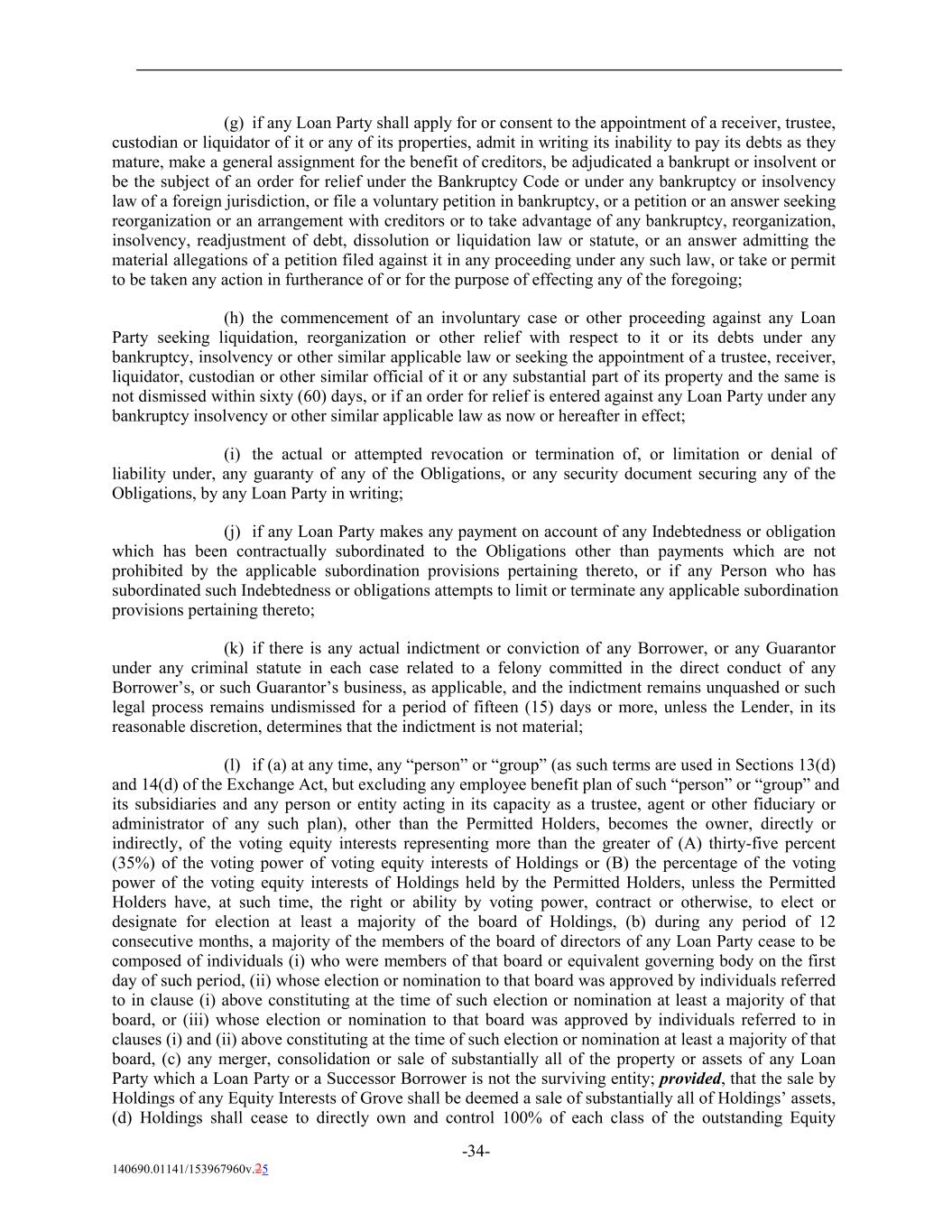 (g) if any Loan Party shall apply for or consent to the appointment of a receiver, trustee, custodian or liquidator of it or any of its properties, admit in writing its inability to pay its debts as they mature, make a general assignment for the benefit of creditors, be adjudicated a bankrupt or insolvent or be the subject of an order for relief under the Bankruptcy Code or under any bankruptcy or insolvency law of a foreign jurisdiction, or file a voluntary petition in bankruptcy, or a petition or an answer seeking reorganization or an arrangement with creditors or to take advantage of any bankruptcy, reorganization, insolvency, readjustment of debt, dissolution or liquidation law or statute, or an answer admitting the material allegations of a petition filed against it in any proceeding under any such law, or take or permit to be taken any action in furtherance of or for the purpose of effecting any of the foregoing; (h) the commencement of an involuntary case or other proceeding against any Loan Party seeking liquidation, reorganization or other relief with respect to it or its debts under any bankruptcy, insolvency or other similar applicable law or seeking the appointment of a trustee, receiver, liquidator, custodian or other similar official of it or any substantial part of its property and the same is not dismissed within sixty (60) days, or if an order for relief is entered against any Loan Party under any bankruptcy insolvency or other similar applicable law as now or hereafter in effect; (i) the actual or attempted revocation or termination of, or limitation or denial of liability under, any guaranty of any of the Obligations, or any security document securing any of the Obligations, by any Loan Party in writing; (j) if any Loan Party makes any payment on account of any Indebtedness or obligation which has been contractually subordinated to the Obligations other than payments which are not prohibited by the applicable subordination provisions pertaining thereto, or if any Person who has subordinated such Indebtedness or obligations attempts to limit or terminate any applicable subordination provisions pertaining thereto; (k) if there is any actual indictment or conviction of any Borrower, or any Guarantor under any criminal statute in each case related to a felony committed in the direct conduct of any Borrower’s, or such Guarantor’s business, as applicable, and the indictment remains unquashed or such legal process remains undismissed for a period of fifteen (15) days or more, unless the Lender, in its reasonable discretion, determines that the indictment is not material; (l) if (a) at any time, any “person” or “group” (as such terms are used in Sections 13(d) and 14(d) of the Exchange Act, but excluding any employee benefit plan of such “person” or “group” and its subsidiaries and any person or entity acting in its capacity as a trustee, agent or other fiduciary or administrator of any such plan), other than the Permitted Holders, becomes the owner, directly or indirectly, of the voting equity interests representing more than the greater of (A) thirty-five percent (35%) of the voting power of voting equity interests of Holdings or (B) the percentage of the voting power of the voting equity interests of Holdings held by the Permitted Holders, unless the Permitted Holders have, at such time, the right or ability by voting power, contract or otherwise, to elect or designate for election at least a majority of the board of Holdings, (b) during any period of 12 consecutive months, a majority of the members of the board of directors of any Loan Party cease to be composed of individuals (i) who were members of that board or equivalent governing body on the first day of such period, (ii) whose election or nomination to that board was approved by individuals referred to in clause (i) above constituting at the time of such election or nomination at least a majority of that board, or (iii) whose election or nomination to that board was approved by individuals referred to in clauses (i) and (ii) above constituting at the time of such election or nomination at least a majority of that board, (c) any merger, consolidation or sale of substantially all of the property or assets of any Loan Party which a Loan Party or a Successor Borrower is not the surviving entity; provided, that the sale by Holdings of any Equity Interests of Grove shall be deemed a sale of substantially all of Holdings’ assets, (d) Holdings shall cease to directly own and control 100% of each class of the outstanding Equity -34- 140690.01141/153967960v.25