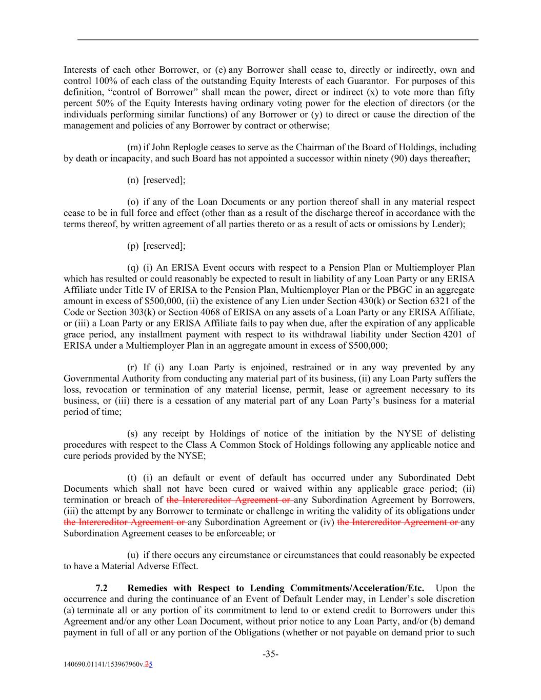Interests of each other Borrower, or (e) any Borrower shall cease to, directly or indirectly, own and control 100% of each class of the outstanding Equity Interests of each Guarantor. For purposes of this definition, “control of Borrower” shall mean the power, direct or indirect (x) to vote more than fifty percent 50% of the Equity Interests having ordinary voting power for the election of directors (or the individuals performing similar functions) of any Borrower or (y) to direct or cause the direction of the management and policies of any Borrower by contract or otherwise; (m) if John Replogle ceases to serve as the Chairman of the Board of Holdings, including by death or incapacity, and such Board has not appointed a successor within ninety (90) days thereafter; (n) [reserved]; (o) if any of the Loan Documents or any portion thereof shall in any material respect cease to be in full force and effect (other than as a result of the discharge thereof in accordance with the terms thereof, by written agreement of all parties thereto or as a result of acts or omissions by Lender); (p) [reserved]; (q) (i) An ERISA Event occurs with respect to a Pension Plan or Multiemployer Plan which has resulted or could reasonably be expected to result in liability of any Loan Party or any ERISA Affiliate under Title IV of ERISA to the Pension Plan, Multiemployer Plan or the PBGC in an aggregate amount in excess of $500,000, (ii) the existence of any Lien under Section 430(k) or Section 6321 of the Code or Section 303(k) or Section 4068 of ERISA on any assets of a Loan Party or any ERISA Affiliate, or (iii) a Loan Party or any ERISA Affiliate fails to pay when due, after the expiration of any applicable grace period, any installment payment with respect to its withdrawal liability under Section 4201 of ERISA under a Multiemployer Plan in an aggregate amount in excess of $500,000; (r) If (i) any Loan Party is enjoined, restrained or in any way prevented by any Governmental Authority from conducting any material part of its business, (ii) any Loan Party suffers the loss, revocation or termination of any material license, permit, lease or agreement necessary to its business, or (iii) there is a cessation of any material part of any Loan Party’s business for a material period of time; (s) any receipt by Holdings of notice of the initiation by the NYSE of delisting procedures with respect to the Class A Common Stock of Holdings following any applicable notice and cure periods provided by the NYSE; (t) (i) an default or event of default has occurred under any Subordinated Debt Documents which shall not have been cured or waived within any applicable grace period; (ii) termination or breach of the Intercreditor Agreement or any Subordination Agreement by Borrowers, (iii) the attempt by any Borrower to terminate or challenge in writing the validity of its obligations under the Intercreditor Agreement or any Subordination Agreement or (iv) the Intercreditor Agreement or any Subordination Agreement ceases to be enforceable; or (u) if there occurs any circumstance or circumstances that could reasonably be expected to have a Material Adverse Effect. 7.2 Remedies with Respect to Lending Commitments/Acceleration/Etc. Upon the occurrence and during the continuance of an Event of Default Lender may, in Lender’s sole discretion (a) terminate all or any portion of its commitment to lend to or extend credit to Borrowers under this Agreement and/or any other Loan Document, without prior notice to any Loan Party, and/or (b) demand payment in full of all or any portion of the Obligations (whether or not payable on demand prior to such -35- 140690.01141/153967960v.25