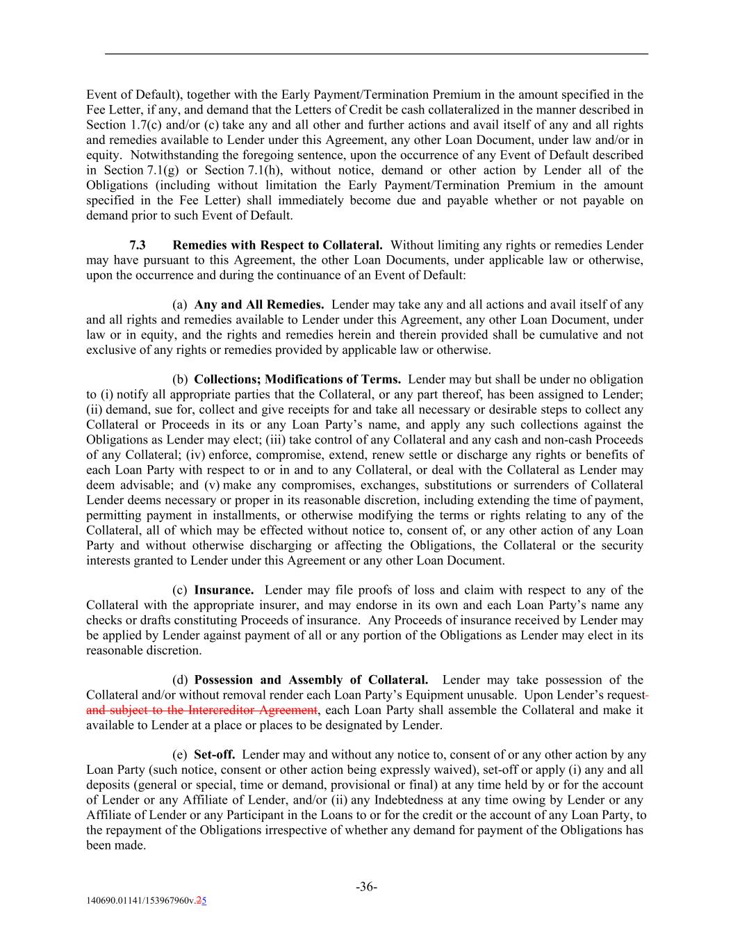 Event of Default), together with the Early Payment/Termination Premium in the amount specified in the Fee Letter, if any, and demand that the Letters of Credit be cash collateralized in the manner described in Section 1.7(c) and/or (c) take any and all other and further actions and avail itself of any and all rights and remedies available to Lender under this Agreement, any other Loan Document, under law and/or in equity. Notwithstanding the foregoing sentence, upon the occurrence of any Event of Default described in Section 7.1(g) or Section 7.1(h), without notice, demand or other action by Lender all of the Obligations (including without limitation the Early Payment/Termination Premium in the amount specified in the Fee Letter) shall immediately become due and payable whether or not payable on demand prior to such Event of Default. 7.3 Remedies with Respect to Collateral. Without limiting any rights or remedies Lender may have pursuant to this Agreement, the other Loan Documents, under applicable law or otherwise, upon the occurrence and during the continuance of an Event of Default: (a) Any and All Remedies. Lender may take any and all actions and avail itself of any and all rights and remedies available to Lender under this Agreement, any other Loan Document, under law or in equity, and the rights and remedies herein and therein provided shall be cumulative and not exclusive of any rights or remedies provided by applicable law or otherwise. (b) Collections; Modifications of Terms. Lender may but shall be under no obligation to (i) notify all appropriate parties that the Collateral, or any part thereof, has been assigned to Lender; (ii) demand, sue for, collect and give receipts for and take all necessary or desirable steps to collect any Collateral or Proceeds in its or any Loan Party’s name, and apply any such collections against the Obligations as Lender may elect; (iii) take control of any Collateral and any cash and non-cash Proceeds of any Collateral; (iv) enforce, compromise, extend, renew settle or discharge any rights or benefits of each Loan Party with respect to or in and to any Collateral, or deal with the Collateral as Lender may deem advisable; and (v) make any compromises, exchanges, substitutions or surrenders of Collateral Lender deems necessary or proper in its reasonable discretion, including extending the time of payment, permitting payment in installments, or otherwise modifying the terms or rights relating to any of the Collateral, all of which may be effected without notice to, consent of, or any other action of any Loan Party and without otherwise discharging or affecting the Obligations, the Collateral or the security interests granted to Lender under this Agreement or any other Loan Document. (c) Insurance. Lender may file proofs of loss and claim with respect to any of the Collateral with the appropriate insurer, and may endorse in its own and each Loan Party’s name any checks or drafts constituting Proceeds of insurance. Any Proceeds of insurance received by Lender may be applied by Lender against payment of all or any portion of the Obligations as Lender may elect in its reasonable discretion. (d) Possession and Assembly of Collateral. Lender may take possession of the Collateral and/or without removal render each Loan Party’s Equipment unusable. Upon Lender’s request and subject to the Intercreditor Agreement, each Loan Party shall assemble the Collateral and make it available to Lender at a place or places to be designated by Lender. (e) Set-off. Lender may and without any notice to, consent of or any other action by any Loan Party (such notice, consent or other action being expressly waived), set-off or apply (i) any and all deposits (general or special, time or demand, provisional or final) at any time held by or for the account of Lender or any Affiliate of Lender, and/or (ii) any Indebtedness at any time owing by Lender or any Affiliate of Lender or any Participant in the Loans to or for the credit or the account of any Loan Party, to the repayment of the Obligations irrespective of whether any demand for payment of the Obligations has been made. -36- 140690.01141/153967960v.25