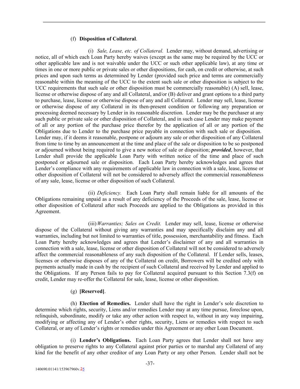 (f) Disposition of Collateral. (i) Sale, Lease, etc. of Collateral. Lender may, without demand, advertising or notice, all of which each Loan Party hereby waives (except as the same may be required by the UCC or other applicable law and is not waivable under the UCC or such other applicable law), at any time or times in one or more public or private sales or other dispositions, for cash, on credit or otherwise, at such prices and upon such terms as determined by Lender (provided such price and terms are commercially reasonable within the meaning of the UCC to the extent such sale or other disposition is subject to the UCC requirements that such sale or other disposition must be commercially reasonable) (A) sell, lease, license or otherwise dispose of any and all Collateral, and/or (B) deliver and grant options to a third party to purchase, lease, license or otherwise dispose of any and all Collateral. Lender may sell, lease, license or otherwise dispose of any Collateral in its then-present condition or following any preparation or processing deemed necessary by Lender in its reasonable discretion. Lender may be the purchaser at any such public or private sale or other disposition of Collateral, and in such case Lender may make payment of all or any portion of the purchase price therefor by the application of all or any portion of the Obligations due to Lender to the purchase price payable in connection with such sale or disposition. Lender may, if it deems it reasonable, postpone or adjourn any sale or other disposition of any Collateral from time to time by an announcement at the time and place of the sale or disposition to be so postponed or adjourned without being required to give a new notice of sale or disposition; provided, however, that Lender shall provide the applicable Loan Party with written notice of the time and place of such postponed or adjourned sale or disposition. Each Loan Party hereby acknowledges and agrees that Lender’s compliance with any requirements of applicable law in connection with a sale, lease, license or other disposition of Collateral will not be considered to adversely affect the commercial reasonableness of any sale, lease, license or other disposition of such Collateral. (ii) Deficiency. Each Loan Party shall remain liable for all amounts of the Obligations remaining unpaid as a result of any deficiency of the Proceeds of the sale, lease, license or other disposition of Collateral after such Proceeds are applied to the Obligations as provided in this Agreement. (iii)Warranties; Sales on Credit. Lender may sell, lease, license or otherwise dispose of the Collateral without giving any warranties and may specifically disclaim any and all warranties, including but not limited to warranties of title, possession, merchantability and fitness. Each Loan Party hereby acknowledges and agrees that Lender’s disclaimer of any and all warranties in connection with a sale, lease, license or other disposition of Collateral will not be considered to adversely affect the commercial reasonableness of any such disposition of the Collateral. If Lender sells, leases, licenses or otherwise disposes of any of the Collateral on credit, Borrowers will be credited only with payments actually made in cash by the recipient of such Collateral and received by Lender and applied to the Obligations. If any Person fails to pay for Collateral acquired pursuant to this Section 7.3(f) on credit, Lender may re-offer the Collateral for sale, lease, license or other disposition. (g) [Reserved]. (h) Election of Remedies. Lender shall have the right in Lender’s sole discretion to determine which rights, security, Liens and/or remedies Lender may at any time pursue, foreclose upon, relinquish, subordinate, modify or take any other action with respect to, without in any way impairing, modifying or affecting any of Lender’s other rights, security, Liens or remedies with respect to such Collateral, or any of Lender’s rights or remedies under this Agreement or any other Loan Document. (i) Lender’s Obligations. Each Loan Party agrees that Lender shall not have any obligation to preserve rights to any Collateral against prior parties or to marshal any Collateral of any kind for the benefit of any other creditor of any Loan Party or any other Person. Lender shall not be -37- 140690.01141/153967960v.25