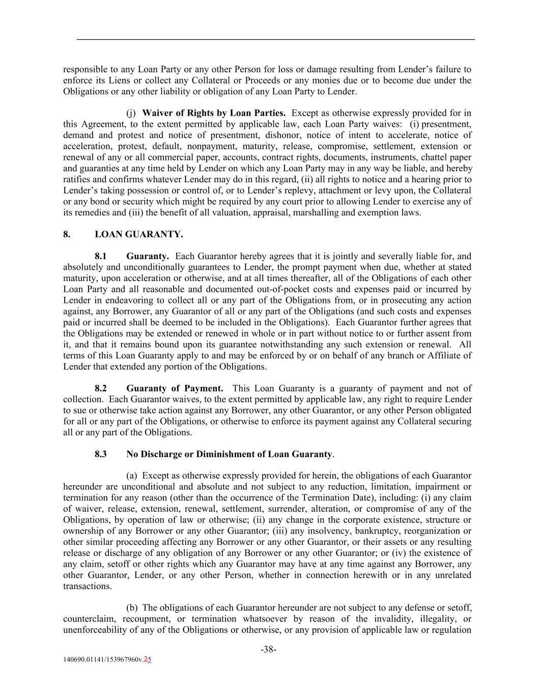 responsible to any Loan Party or any other Person for loss or damage resulting from Lender’s failure to enforce its Liens or collect any Collateral or Proceeds or any monies due or to become due under the Obligations or any other liability or obligation of any Loan Party to Lender. (j) Waiver of Rights by Loan Parties. Except as otherwise expressly provided for in this Agreement, to the extent permitted by applicable law, each Loan Party waives: (i) presentment, demand and protest and notice of presentment, dishonor, notice of intent to accelerate, notice of acceleration, protest, default, nonpayment, maturity, release, compromise, settlement, extension or renewal of any or all commercial paper, accounts, contract rights, documents, instruments, chattel paper and guaranties at any time held by Lender on which any Loan Party may in any way be liable, and hereby ratifies and confirms whatever Lender may do in this regard, (ii) all rights to notice and a hearing prior to Lender’s taking possession or control of, or to Lender’s replevy, attachment or levy upon, the Collateral or any bond or security which might be required by any court prior to allowing Lender to exercise any of its remedies and (iii) the benefit of all valuation, appraisal, marshalling and exemption laws. 8. LOAN GUARANTY. 8.1 Guaranty. Each Guarantor hereby agrees that it is jointly and severally liable for, and absolutely and unconditionally guarantees to Lender, the prompt payment when due, whether at stated maturity, upon acceleration or otherwise, and at all times thereafter, all of the Obligations of each other Loan Party and all reasonable and documented out-of-pocket costs and expenses paid or incurred by Lender in endeavoring to collect all or any part of the Obligations from, or in prosecuting any action against, any Borrower, any Guarantor of all or any part of the Obligations (and such costs and expenses paid or incurred shall be deemed to be included in the Obligations). Each Guarantor further agrees that the Obligations may be extended or renewed in whole or in part without notice to or further assent from it, and that it remains bound upon its guarantee notwithstanding any such extension or renewal. All terms of this Loan Guaranty apply to and may be enforced by or on behalf of any branch or Affiliate of Lender that extended any portion of the Obligations. 8.2 Guaranty of Payment. This Loan Guaranty is a guaranty of payment and not of collection. Each Guarantor waives, to the extent permitted by applicable law, any right to require Lender to sue or otherwise take action against any Borrower, any other Guarantor, or any other Person obligated for all or any part of the Obligations, or otherwise to enforce its payment against any Collateral securing all or any part of the Obligations. 8.3 No Discharge or Diminishment of Loan Guaranty. (a) Except as otherwise expressly provided for herein, the obligations of each Guarantor hereunder are unconditional and absolute and not subject to any reduction, limitation, impairment or termination for any reason (other than the occurrence of the Termination Date), including: (i) any claim of waiver, release, extension, renewal, settlement, surrender, alteration, or compromise of any of the Obligations, by operation of law or otherwise; (ii) any change in the corporate existence, structure or ownership of any Borrower or any other Guarantor; (iii) any insolvency, bankruptcy, reorganization or other similar proceeding affecting any Borrower or any other Guarantor, or their assets or any resulting release or discharge of any obligation of any Borrower or any other Guarantor; or (iv) the existence of any claim, setoff or other rights which any Guarantor may have at any time against any Borrower, any other Guarantor, Lender, or any other Person, whether in connection herewith or in any unrelated transactions. (b) The obligations of each Guarantor hereunder are not subject to any defense or setoff, counterclaim, recoupment, or termination whatsoever by reason of the invalidity, illegality, or unenforceability of any of the Obligations or otherwise, or any provision of applicable law or regulation -38- 140690.01141/153967960v.25