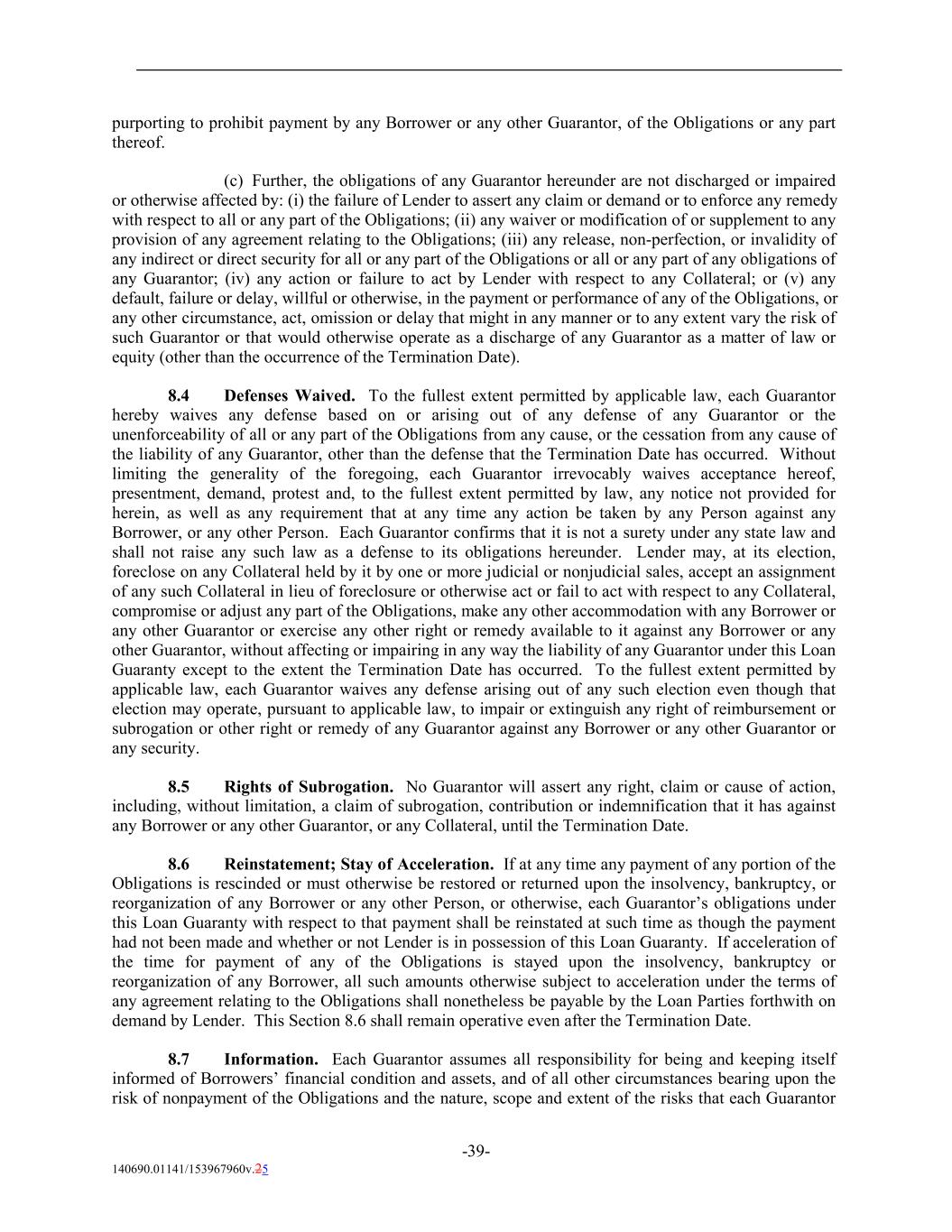 purporting to prohibit payment by any Borrower or any other Guarantor, of the Obligations or any part thereof. (c) Further, the obligations of any Guarantor hereunder are not discharged or impaired or otherwise affected by: (i) the failure of Lender to assert any claim or demand or to enforce any remedy with respect to all or any part of the Obligations; (ii) any waiver or modification of or supplement to any provision of any agreement relating to the Obligations; (iii) any release, non-perfection, or invalidity of any indirect or direct security for all or any part of the Obligations or all or any part of any obligations of any Guarantor; (iv) any action or failure to act by Lender with respect to any Collateral; or (v) any default, failure or delay, willful or otherwise, in the payment or performance of any of the Obligations, or any other circumstance, act, omission or delay that might in any manner or to any extent vary the risk of such Guarantor or that would otherwise operate as a discharge of any Guarantor as a matter of law or equity (other than the occurrence of the Termination Date). 8.4 Defenses Waived. To the fullest extent permitted by applicable law, each Guarantor hereby waives any defense based on or arising out of any defense of any Guarantor or the unenforceability of all or any part of the Obligations from any cause, or the cessation from any cause of the liability of any Guarantor, other than the defense that the Termination Date has occurred. Without limiting the generality of the foregoing, each Guarantor irrevocably waives acceptance hereof, presentment, demand, protest and, to the fullest extent permitted by law, any notice not provided for herein, as well as any requirement that at any time any action be taken by any Person against any Borrower, or any other Person. Each Guarantor confirms that it is not a surety under any state law and shall not raise any such law as a defense to its obligations hereunder. Lender may, at its election, foreclose on any Collateral held by it by one or more judicial or nonjudicial sales, accept an assignment of any such Collateral in lieu of foreclosure or otherwise act or fail to act with respect to any Collateral, compromise or adjust any part of the Obligations, make any other accommodation with any Borrower or any other Guarantor or exercise any other right or remedy available to it against any Borrower or any other Guarantor, without affecting or impairing in any way the liability of any Guarantor under this Loan Guaranty except to the extent the Termination Date has occurred. To the fullest extent permitted by applicable law, each Guarantor waives any defense arising out of any such election even though that election may operate, pursuant to applicable law, to impair or extinguish any right of reimbursement or subrogation or other right or remedy of any Guarantor against any Borrower or any other Guarantor or any security. 8.5 Rights of Subrogation. No Guarantor will assert any right, claim or cause of action, including, without limitation, a claim of subrogation, contribution or indemnification that it has against any Borrower or any other Guarantor, or any Collateral, until the Termination Date. 8.6 Reinstatement; Stay of Acceleration. If at any time any payment of any portion of the Obligations is rescinded or must otherwise be restored or returned upon the insolvency, bankruptcy, or reorganization of any Borrower or any other Person, or otherwise, each Guarantor’s obligations under this Loan Guaranty with respect to that payment shall be reinstated at such time as though the payment had not been made and whether or not Lender is in possession of this Loan Guaranty. If acceleration of the time for payment of any of the Obligations is stayed upon the insolvency, bankruptcy or reorganization of any Borrower, all such amounts otherwise subject to acceleration under the terms of any agreement relating to the Obligations shall nonetheless be payable by the Loan Parties forthwith on demand by Lender. This Section 8.6 shall remain operative even after the Termination Date. 8.7 Information. Each Guarantor assumes all responsibility for being and keeping itself informed of Borrowers’ financial condition and assets, and of all other circumstances bearing upon the risk of nonpayment of the Obligations and the nature, scope and extent of the risks that each Guarantor -39- 140690.01141/153967960v.25