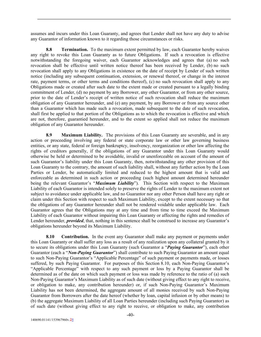 assumes and incurs under this Loan Guaranty, and agrees that Lender shall not have any duty to advise any Guarantor of information known to it regarding those circumstances or risks. 8.8 Termination. To the maximum extent permitted by law, each Guarantor hereby waives any right to revoke this Loan Guaranty as to future Obligations. If such a revocation is effective notwithstanding the foregoing waiver, each Guarantor acknowledges and agrees that (a) no such revocation shall be effective until written notice thereof has been received by Lender, (b) no such revocation shall apply to any Obligations in existence on the date of receipt by Lender of such written notice (including any subsequent continuation, extension, or renewal thereof, or change in the interest rate, payment terms, or other terms and conditions thereof), (c) no such revocation shall apply to any Obligations made or created after such date to the extent made or created pursuant to a legally binding commitment of Lender, (d) no payment by any Borrower, any other Guarantor, or from any other source, prior to the date of Lender’s receipt of written notice of such revocation shall reduce the maximum obligation of any Guarantor hereunder, and (e) any payment, by any Borrower or from any source other than a Guarantor which has made such a revocation, made subsequent to the date of such revocation, shall first be applied to that portion of the Obligations as to which the revocation is effective and which are not, therefore, guarantied hereunder, and to the extent so applied shall not reduce the maximum obligation of any Guarantor hereunder. 8.9 Maximum Liability. The provisions of this Loan Guaranty are severable, and in any action or proceeding involving any federal or state corporate law or other law governing business entities, or any state, federal or foreign bankruptcy, insolvency, reorganization or other law affecting the rights of creditors generally, if the obligations of any Guarantor under this Loan Guaranty would otherwise be held or determined to be avoidable, invalid or unenforceable on account of the amount of such Guarantor’s liability under this Loan Guaranty, then, notwithstanding any other provision of this Loan Guaranty to the contrary, the amount of such liability shall, without any further action by the Loan Parties or Lender, be automatically limited and reduced to the highest amount that is valid and enforceable as determined in such action or proceeding (such highest amount determined hereunder being the relevant Guarantor’s “Maximum Liability”). This Section with respect to the Maximum Liability of each Guarantor is intended solely to preserve the rights of Lender to the maximum extent not subject to avoidance under applicable law, and no Guarantor nor any other Person shall have any right or claim under this Section with respect to such Maximum Liability, except to the extent necessary so that the obligations of any Guarantor hereunder shall not be rendered voidable under applicable law. Each Guarantor agrees that the Obligations may at any time and from time to time exceed the Maximum Liability of each Guarantor without impairing this Loan Guaranty or affecting the rights and remedies of Lender hereunder, provided, that, nothing in this sentence shall be construed to increase any Guarantor’s obligations hereunder beyond its Maximum Liability. 8.10 Contribution. In the event any Guarantor shall make any payment or payments under this Loan Guaranty or shall suffer any loss as a result of any realization upon any collateral granted by it to secure its obligations under this Loan Guaranty (such Guarantor a “Paying Guarantor”), each other Guarantor (each a “Non-Paying Guarantor”) shall contribute to such Paying Guarantor an amount equal to such Non-Paying Guarantor’s “Applicable Percentage” of such payment or payments made, or losses suffered, by such Paying Guarantor. For purposes of this Section 8.10, each Non-Paying Guarantor’s “Applicable Percentage” with respect to any such payment or loss by a Paying Guarantor shall be determined as of the date on which such payment or loss was made by reference to the ratio of (a) such Non-Paying Guarantor’s Maximum Liability as of such date (without giving effect to any right to receive, or obligation to make, any contribution hereunder) or, if such Non-Paying Guarantor’s Maximum Liability has not been determined, the aggregate amount of all monies received by such Non-Paying Guarantor from Borrowers after the date hereof (whether by loan, capital infusion or by other means) to (b) the aggregate Maximum Liability of all Loan Parties hereunder (including such Paying Guarantor) as of such date (without giving effect to any right to receive, or obligation to make, any contribution -40- 140690.01141/153967960v.25