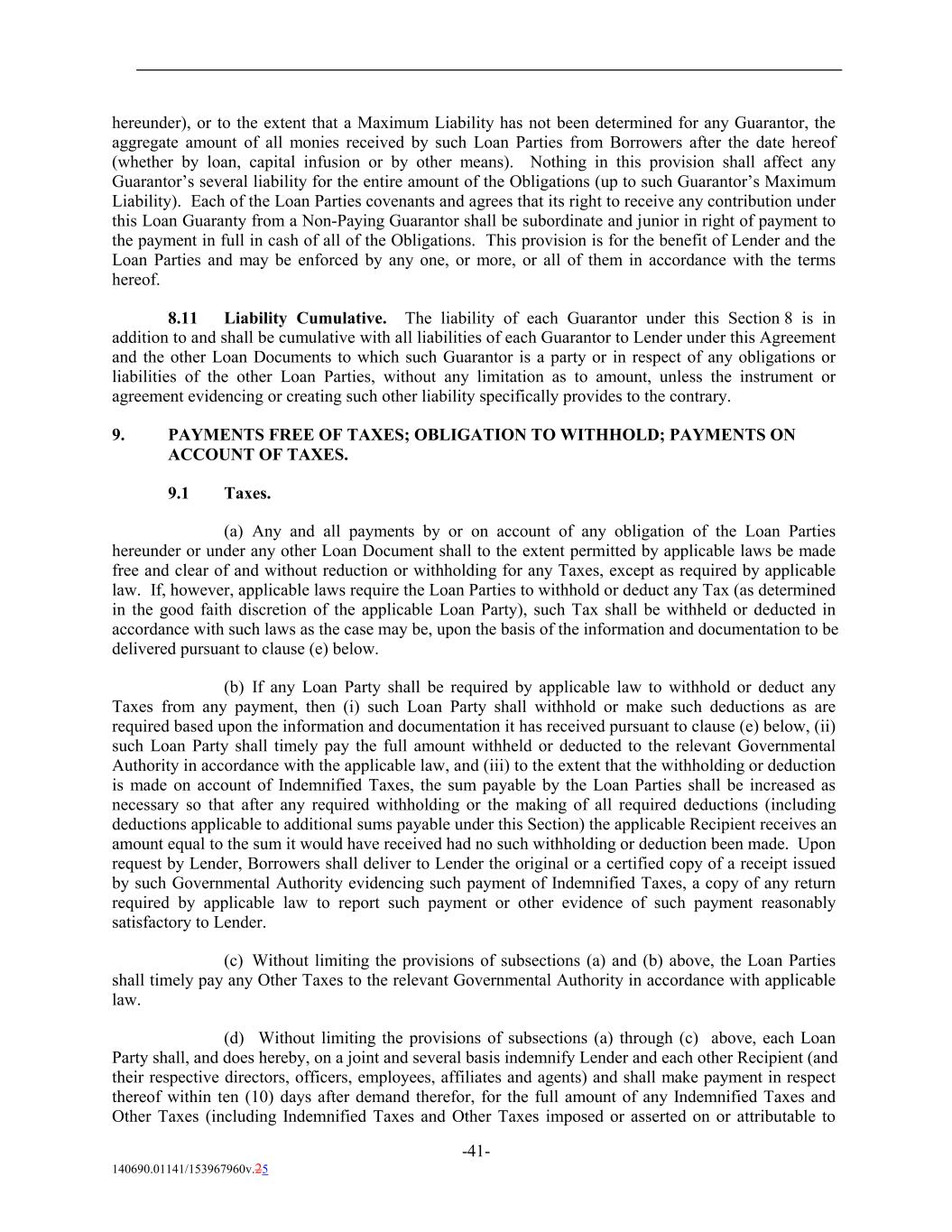hereunder), or to the extent that a Maximum Liability has not been determined for any Guarantor, the aggregate amount of all monies received by such Loan Parties from Borrowers after the date hereof (whether by loan, capital infusion or by other means). Nothing in this provision shall affect any Guarantor’s several liability for the entire amount of the Obligations (up to such Guarantor’s Maximum Liability). Each of the Loan Parties covenants and agrees that its right to receive any contribution under this Loan Guaranty from a Non-Paying Guarantor shall be subordinate and junior in right of payment to the payment in full in cash of all of the Obligations. This provision is for the benefit of Lender and the Loan Parties and may be enforced by any one, or more, or all of them in accordance with the terms hereof. 8.11 Liability Cumulative. The liability of each Guarantor under this Section 8 is in addition to and shall be cumulative with all liabilities of each Guarantor to Lender under this Agreement and the other Loan Documents to which such Guarantor is a party or in respect of any obligations or liabilities of the other Loan Parties, without any limitation as to amount, unless the instrument or agreement evidencing or creating such other liability specifically provides to the contrary. 9. PAYMENTS FREE OF TAXES; OBLIGATION TO WITHHOLD; PAYMENTS ON ACCOUNT OF TAXES. 9.1 Taxes. (a) Any and all payments by or on account of any obligation of the Loan Parties hereunder or under any other Loan Document shall to the extent permitted by applicable laws be made free and clear of and without reduction or withholding for any Taxes, except as required by applicable law. If, however, applicable laws require the Loan Parties to withhold or deduct any Tax (as determined in the good faith discretion of the applicable Loan Party), such Tax shall be withheld or deducted in accordance with such laws as the case may be, upon the basis of the information and documentation to be delivered pursuant to clause (e) below. (b) If any Loan Party shall be required by applicable law to withhold or deduct any Taxes from any payment, then (i) such Loan Party shall withhold or make such deductions as are required based upon the information and documentation it has received pursuant to clause (e) below, (ii) such Loan Party shall timely pay the full amount withheld or deducted to the relevant Governmental Authority in accordance with the applicable law, and (iii) to the extent that the withholding or deduction is made on account of Indemnified Taxes, the sum payable by the Loan Parties shall be increased as necessary so that after any required withholding or the making of all required deductions (including deductions applicable to additional sums payable under this Section) the applicable Recipient receives an amount equal to the sum it would have received had no such withholding or deduction been made. Upon request by Lender, Borrowers shall deliver to Lender the original or a certified copy of a receipt issued by such Governmental Authority evidencing such payment of Indemnified Taxes, a copy of any return required by applicable law to report such payment or other evidence of such payment reasonably satisfactory to Lender. (c) Without limiting the provisions of subsections (a) and (b) above, the Loan Parties shall timely pay any Other Taxes to the relevant Governmental Authority in accordance with applicable law. (d) Without limiting the provisions of subsections (a) through (c) above, each Loan Party shall, and does hereby, on a joint and several basis indemnify Lender and each other Recipient (and their respective directors, officers, employees, affiliates and agents) and shall make payment in respect thereof within ten (10) days after demand therefor, for the full amount of any Indemnified Taxes and Other Taxes (including Indemnified Taxes and Other Taxes imposed or asserted on or attributable to -41- 140690.01141/153967960v.25