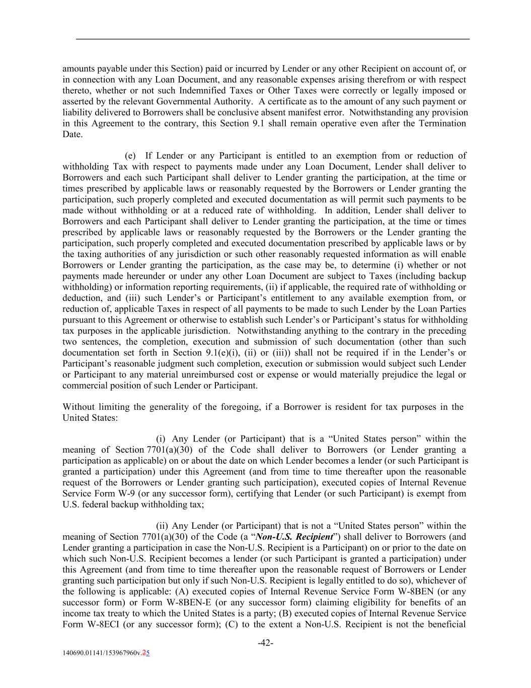 amounts payable under this Section) paid or incurred by Lender or any other Recipient on account of, or in connection with any Loan Document, and any reasonable expenses arising therefrom or with respect thereto, whether or not such Indemnified Taxes or Other Taxes were correctly or legally imposed or asserted by the relevant Governmental Authority. A certificate as to the amount of any such payment or liability delivered to Borrowers shall be conclusive absent manifest error. Notwithstanding any provision in this Agreement to the contrary, this Section 9.1 shall remain operative even after the Termination Date. (e) If Lender or any Participant is entitled to an exemption from or reduction of withholding Tax with respect to payments made under any Loan Document, Lender shall deliver to Borrowers and each such Participant shall deliver to Lender granting the participation, at the time or times prescribed by applicable laws or reasonably requested by the Borrowers or Lender granting the participation, such properly completed and executed documentation as will permit such payments to be made without withholding or at a reduced rate of withholding. In addition, Lender shall deliver to Borrowers and each Participant shall deliver to Lender granting the participation, at the time or times prescribed by applicable laws or reasonably requested by the Borrowers or the Lender granting the participation, such properly completed and executed documentation prescribed by applicable laws or by the taxing authorities of any jurisdiction or such other reasonably requested information as will enable Borrowers or Lender granting the participation, as the case may be, to determine (i) whether or not payments made hereunder or under any other Loan Document are subject to Taxes (including backup withholding) or information reporting requirements, (ii) if applicable, the required rate of withholding or deduction, and (iii) such Lender’s or Participant’s entitlement to any available exemption from, or reduction of, applicable Taxes in respect of all payments to be made to such Lender by the Loan Parties pursuant to this Agreement or otherwise to establish such Lender’s or Participant’s status for withholding tax purposes in the applicable jurisdiction. Notwithstanding anything to the contrary in the preceding two sentences, the completion, execution and submission of such documentation (other than such documentation set forth in Section 9.1(e)(i), (ii) or (iii)) shall not be required if in the Lender’s or Participant’s reasonable judgment such completion, execution or submission would subject such Lender or Participant to any material unreimbursed cost or expense or would materially prejudice the legal or commercial position of such Lender or Participant. Without limiting the generality of the foregoing, if a Borrower is resident for tax purposes in the United States: (i) Any Lender (or Participant) that is a “United States person” within the meaning of Section 7701(a)(30) of the Code shall deliver to Borrowers (or Lender granting a participation as applicable) on or about the date on which Lender becomes a lender (or such Participant is granted a participation) under this Agreement (and from time to time thereafter upon the reasonable request of the Borrowers or Lender granting such participation), executed copies of Internal Revenue Service Form W-9 (or any successor form), certifying that Lender (or such Participant) is exempt from U.S. federal backup withholding tax; (ii) Any Lender (or Participant) that is not a “United States person” within the meaning of Section 7701(a)(30) of the Code (a “Non-U.S. Recipient”) shall deliver to Borrowers (and Lender granting a participation in case the Non-U.S. Recipient is a Participant) on or prior to the date on which such Non-U.S. Recipient becomes a lender (or such Participant is granted a participation) under this Agreement (and from time to time thereafter upon the reasonable request of Borrowers or Lender granting such participation but only if such Non-U.S. Recipient is legally entitled to do so), whichever of the following is applicable: (A) executed copies of Internal Revenue Service Form W-8BEN (or any successor form) or Form W-8BEN-E (or any successor form) claiming eligibility for benefits of an income tax treaty to which the United States is a party; (B) executed copies of Internal Revenue Service Form W-8ECI (or any successor form); (C) to the extent a Non-U.S. Recipient is not the beneficial -42- 140690.01141/153967960v.25