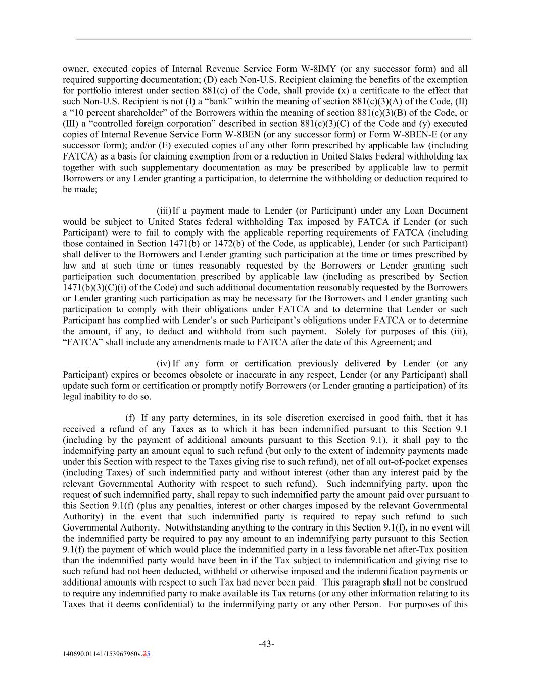 owner, executed copies of Internal Revenue Service Form W-8IMY (or any successor form) and all required supporting documentation; (D) each Non-U.S. Recipient claiming the benefits of the exemption for portfolio interest under section 881(c) of the Code, shall provide (x) a certificate to the effect that such Non-U.S. Recipient is not (I) a “bank” within the meaning of section 881(c)(3)(A) of the Code, (II) a “10 percent shareholder” of the Borrowers within the meaning of section 881(c)(3)(B) of the Code, or (III) a “controlled foreign corporation” described in section 881(c)(3)(C) of the Code and (y) executed copies of Internal Revenue Service Form W-8BEN (or any successor form) or Form W-8BEN-E (or any successor form); and/or (E) executed copies of any other form prescribed by applicable law (including FATCA) as a basis for claiming exemption from or a reduction in United States Federal withholding tax together with such supplementary documentation as may be prescribed by applicable law to permit Borrowers or any Lender granting a participation, to determine the withholding or deduction required to be made; (iii) If a payment made to Lender (or Participant) under any Loan Document would be subject to United States federal withholding Tax imposed by FATCA if Lender (or such Participant) were to fail to comply with the applicable reporting requirements of FATCA (including those contained in Section 1471(b) or 1472(b) of the Code, as applicable), Lender (or such Participant) shall deliver to the Borrowers and Lender granting such participation at the time or times prescribed by law and at such time or times reasonably requested by the Borrowers or Lender granting such participation such documentation prescribed by applicable law (including as prescribed by Section 1471(b)(3)(C)(i) of the Code) and such additional documentation reasonably requested by the Borrowers or Lender granting such participation as may be necessary for the Borrowers and Lender granting such participation to comply with their obligations under FATCA and to determine that Lender or such Participant has complied with Lender’s or such Participant’s obligations under FATCA or to determine the amount, if any, to deduct and withhold from such payment. Solely for purposes of this (iii), “FATCA” shall include any amendments made to FATCA after the date of this Agreement; and (iv) If any form or certification previously delivered by Lender (or any Participant) expires or becomes obsolete or inaccurate in any respect, Lender (or any Participant) shall update such form or certification or promptly notify Borrowers (or Lender granting a participation) of its legal inability to do so. (f) If any party determines, in its sole discretion exercised in good faith, that it has received a refund of any Taxes as to which it has been indemnified pursuant to this Section 9.1 (including by the payment of additional amounts pursuant to this Section 9.1), it shall pay to the indemnifying party an amount equal to such refund (but only to the extent of indemnity payments made under this Section with respect to the Taxes giving rise to such refund), net of all out-of-pocket expenses (including Taxes) of such indemnified party and without interest (other than any interest paid by the relevant Governmental Authority with respect to such refund). Such indemnifying party, upon the request of such indemnified party, shall repay to such indemnified party the amount paid over pursuant to this Section 9.1(f) (plus any penalties, interest or other charges imposed by the relevant Governmental Authority) in the event that such indemnified party is required to repay such refund to such Governmental Authority. Notwithstanding anything to the contrary in this Section 9.1(f), in no event will the indemnified party be required to pay any amount to an indemnifying party pursuant to this Section 9.1(f) the payment of which would place the indemnified party in a less favorable net after-Tax position than the indemnified party would have been in if the Tax subject to indemnification and giving rise to such refund had not been deducted, withheld or otherwise imposed and the indemnification payments or additional amounts with respect to such Tax had never been paid. This paragraph shall not be construed to require any indemnified party to make available its Tax returns (or any other information relating to its Taxes that it deems confidential) to the indemnifying party or any other Person. For purposes of this -43- 140690.01141/153967960v.25