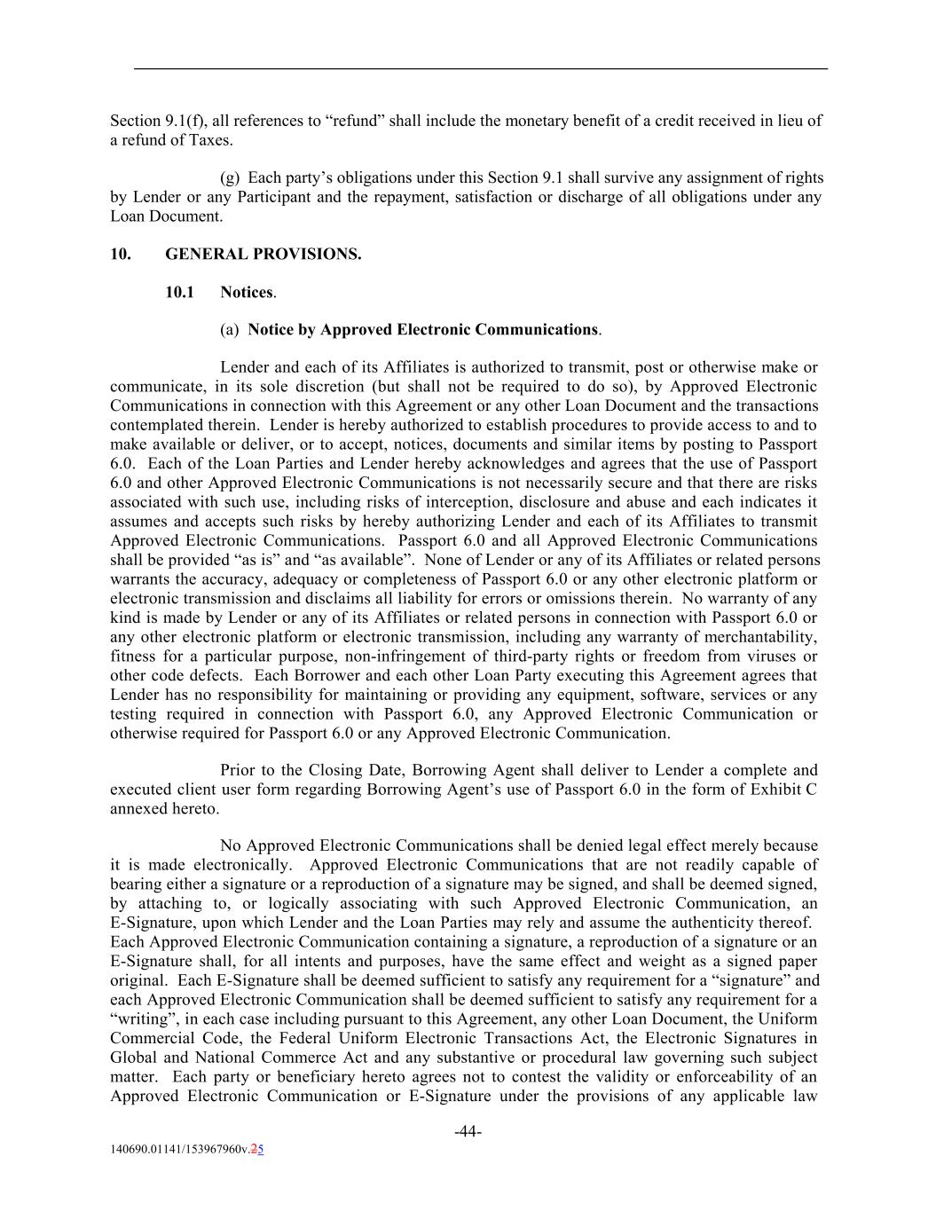 Section 9.1(f), all references to “refund” shall include the monetary benefit of a credit received in lieu of a refund of Taxes. (g) Each party’s obligations under this Section 9.1 shall survive any assignment of rights by Lender or any Participant and the repayment, satisfaction or discharge of all obligations under any Loan Document. 10. GENERAL PROVISIONS. 10.1 Notices. (a) Notice by Approved Electronic Communications. Lender and each of its Affiliates is authorized to transmit, post or otherwise make or communicate, in its sole discretion (but shall not be required to do so), by Approved Electronic Communications in connection with this Agreement or any other Loan Document and the transactions contemplated therein. Lender is hereby authorized to establish procedures to provide access to and to make available or deliver, or to accept, notices, documents and similar items by posting to Passport 6.0. Each of the Loan Parties and Lender hereby acknowledges and agrees that the use of Passport 6.0 and other Approved Electronic Communications is not necessarily secure and that there are risks associated with such use, including risks of interception, disclosure and abuse and each indicates it assumes and accepts such risks by hereby authorizing Lender and each of its Affiliates to transmit Approved Electronic Communications. Passport 6.0 and all Approved Electronic Communications shall be provided “as is” and “as available”. None of Lender or any of its Affiliates or related persons warrants the accuracy, adequacy or completeness of Passport 6.0 or any other electronic platform or electronic transmission and disclaims all liability for errors or omissions therein. No warranty of any kind is made by Lender or any of its Affiliates or related persons in connection with Passport 6.0 or any other electronic platform or electronic transmission, including any warranty of merchantability, fitness for a particular purpose, non-infringement of third-party rights or freedom from viruses or other code defects. Each Borrower and each other Loan Party executing this Agreement agrees that Lender has no responsibility for maintaining or providing any equipment, software, services or any testing required in connection with Passport 6.0, any Approved Electronic Communication or otherwise required for Passport 6.0 or any Approved Electronic Communication. Prior to the Closing Date, Borrowing Agent shall deliver to Lender a complete and executed client user form regarding Borrowing Agent’s use of Passport 6.0 in the form of Exhibit C annexed hereto. No Approved Electronic Communications shall be denied legal effect merely because it is made electronically. Approved Electronic Communications that are not readily capable of bearing either a signature or a reproduction of a signature may be signed, and shall be deemed signed, by attaching to, or logically associating with such Approved Electronic Communication, an E-Signature, upon which Lender and the Loan Parties may rely and assume the authenticity thereof. Each Approved Electronic Communication containing a signature, a reproduction of a signature or an E-Signature shall, for all intents and purposes, have the same effect and weight as a signed paper original. Each E-Signature shall be deemed sufficient to satisfy any requirement for a “signature” and each Approved Electronic Communication shall be deemed sufficient to satisfy any requirement for a “writing”, in each case including pursuant to this Agreement, any other Loan Document, the Uniform Commercial Code, the Federal Uniform Electronic Transactions Act, the Electronic Signatures in Global and National Commerce Act and any substantive or procedural law governing such subject matter. Each party or beneficiary hereto agrees not to contest the validity or enforceability of an Approved Electronic Communication or E-Signature under the provisions of any applicable law -44- 140690.01141/153967960v.25