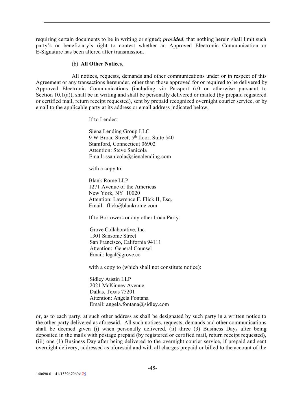 requiring certain documents to be in writing or signed; provided, that nothing herein shall limit such party’s or beneficiary’s right to contest whether an Approved Electronic Communication or E-Signature has been altered after transmission. (b) All Other Notices. All notices, requests, demands and other communications under or in respect of this Agreement or any transactions hereunder, other than those approved for or required to be delivered by Approved Electronic Communications (including via Passport 6.0 or otherwise pursuant to Section 10.1(a)), shall be in writing and shall be personally delivered or mailed (by prepaid registered or certified mail, return receipt requested), sent by prepaid recognized overnight courier service, or by email to the applicable party at its address or email address indicated below, If to Lender: Siena Lending Group LLC 9 W Broad Street, 5th floor, Suite 540 Stamford, Connecticut 06902 Attention: Steve Sanicola Email: ssanicola@sienalending.com with a copy to: Blank Rome LLP 1271 Avenue of the Americas New York, NY 10020 Attention: Lawrence F. Flick II, Esq. Email: flick@blankrome.com If to Borrowers or any other Loan Party: Grove Collaborative, Inc. 1301 Sansome Street San Francisco, California 94111 Attention: General Counsel Email: legal@grove.co with a copy to (which shall not constitute notice): Sidley Austin LLP 2021 McKinney Avenue Dallas, Texas 75201 Attention: Angela Fontana Email: angela.fontana@sidley.com or, as to each party, at such other address as shall be designated by such party in a written notice to the other party delivered as aforesaid. All such notices, requests, demands and other communications shall be deemed given (i) when personally delivered, (ii) three (3) Business Days after being deposited in the mails with postage prepaid (by registered or certified mail, return receipt requested), (iii) one (1) Business Day after being delivered to the overnight courier service, if prepaid and sent overnight delivery, addressed as aforesaid and with all charges prepaid or billed to the account of the -45- 140690.01141/153967960v.25