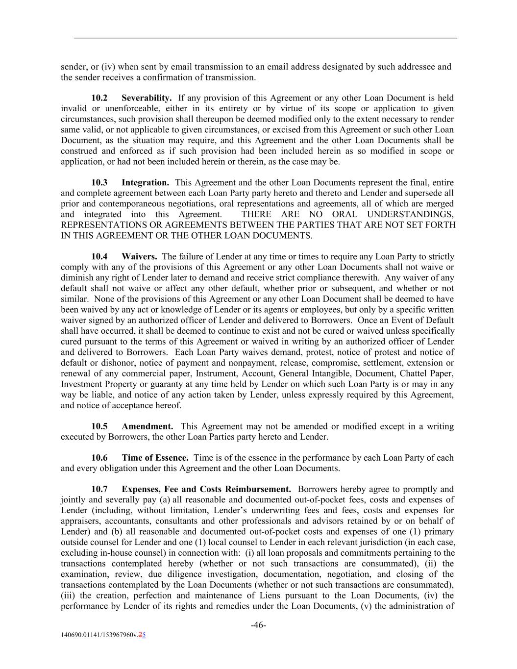 sender, or (iv) when sent by email transmission to an email address designated by such addressee and the sender receives a confirmation of transmission. 10.2 Severability. If any provision of this Agreement or any other Loan Document is held invalid or unenforceable, either in its entirety or by virtue of its scope or application to given circumstances, such provision shall thereupon be deemed modified only to the extent necessary to render same valid, or not applicable to given circumstances, or excised from this Agreement or such other Loan Document, as the situation may require, and this Agreement and the other Loan Documents shall be construed and enforced as if such provision had been included herein as so modified in scope or application, or had not been included herein or therein, as the case may be. 10.3 Integration. This Agreement and the other Loan Documents represent the final, entire and complete agreement between each Loan Party party hereto and thereto and Lender and supersede all prior and contemporaneous negotiations, oral representations and agreements, all of which are merged and integrated into this Agreement. THERE ARE NO ORAL UNDERSTANDINGS, REPRESENTATIONS OR AGREEMENTS BETWEEN THE PARTIES THAT ARE NOT SET FORTH IN THIS AGREEMENT OR THE OTHER LOAN DOCUMENTS. 10.4 Waivers. The failure of Lender at any time or times to require any Loan Party to strictly comply with any of the provisions of this Agreement or any other Loan Documents shall not waive or diminish any right of Lender later to demand and receive strict compliance therewith. Any waiver of any default shall not waive or affect any other default, whether prior or subsequent, and whether or not similar. None of the provisions of this Agreement or any other Loan Document shall be deemed to have been waived by any act or knowledge of Lender or its agents or employees, but only by a specific written waiver signed by an authorized officer of Lender and delivered to Borrowers. Once an Event of Default shall have occurred, it shall be deemed to continue to exist and not be cured or waived unless specifically cured pursuant to the terms of this Agreement or waived in writing by an authorized officer of Lender and delivered to Borrowers. Each Loan Party waives demand, protest, notice of protest and notice of default or dishonor, notice of payment and nonpayment, release, compromise, settlement, extension or renewal of any commercial paper, Instrument, Account, General Intangible, Document, Chattel Paper, Investment Property or guaranty at any time held by Lender on which such Loan Party is or may in any way be liable, and notice of any action taken by Lender, unless expressly required by this Agreement, and notice of acceptance hereof. 10.5 Amendment. This Agreement may not be amended or modified except in a writing executed by Borrowers, the other Loan Parties party hereto and Lender. 10.6 Time of Essence. Time is of the essence in the performance by each Loan Party of each and every obligation under this Agreement and the other Loan Documents. 10.7 Expenses, Fee and Costs Reimbursement. Borrowers hereby agree to promptly and jointly and severally pay (a) all reasonable and documented out-of-pocket fees, costs and expenses of Lender (including, without limitation, Lender’s underwriting fees and fees, costs and expenses for appraisers, accountants, consultants and other professionals and advisors retained by or on behalf of Lender) and (b) all reasonable and documented out-of-pocket costs and expenses of one (1) primary outside counsel for Lender and one (1) local counsel to Lender in each relevant jurisdiction (in each case, excluding in-house counsel) in connection with: (i) all loan proposals and commitments pertaining to the transactions contemplated hereby (whether or not such transactions are consummated), (ii) the examination, review, due diligence investigation, documentation, negotiation, and closing of the transactions contemplated by the Loan Documents (whether or not such transactions are consummated), (iii) the creation, perfection and maintenance of Liens pursuant to the Loan Documents, (iv) the performance by Lender of its rights and remedies under the Loan Documents, (v) the administration of -46- 140690.01141/153967960v.25
