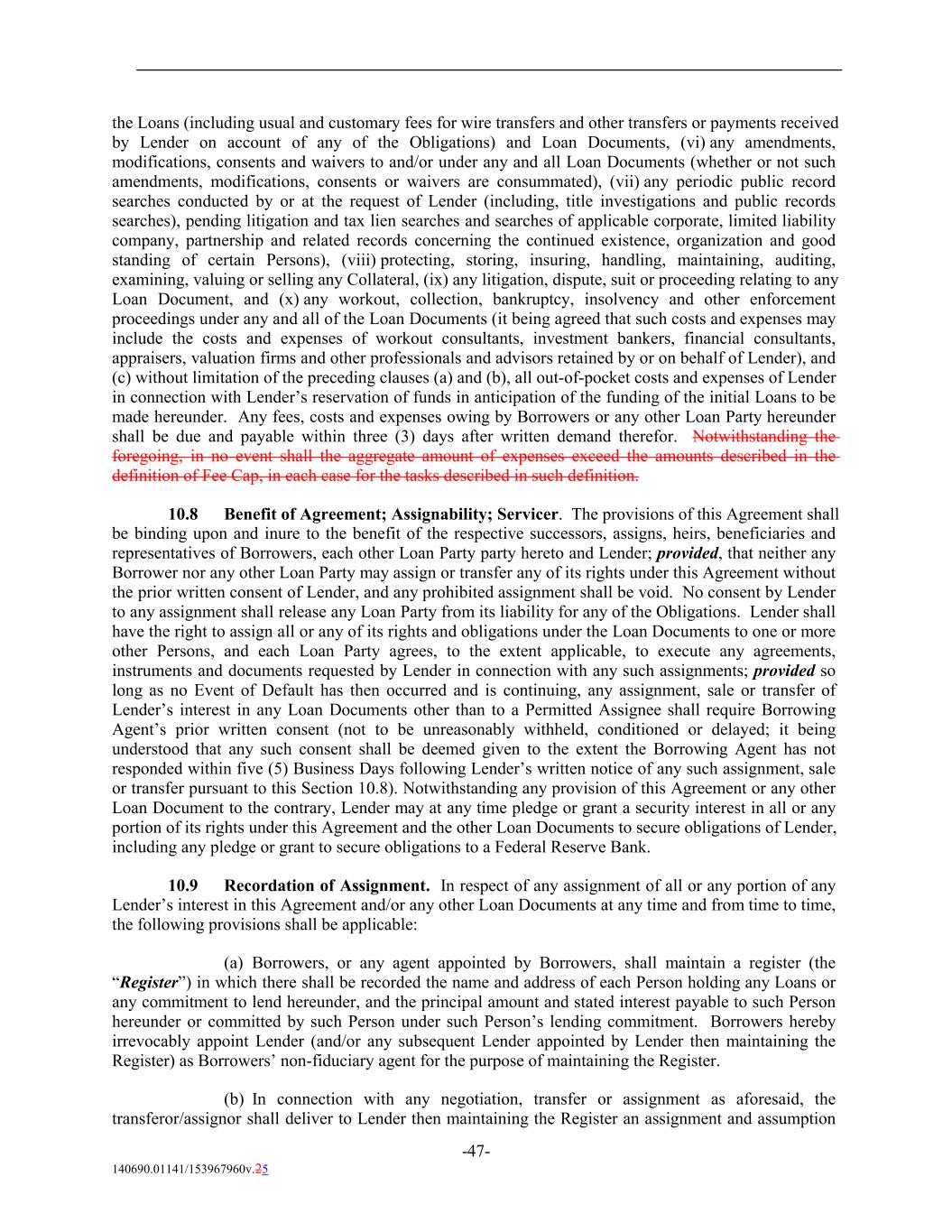 the Loans (including usual and customary fees for wire transfers and other transfers or payments received by Lender on account of any of the Obligations) and Loan Documents, (vi) any amendments, modifications, consents and waivers to and/or under any and all Loan Documents (whether or not such amendments, modifications, consents or waivers are consummated), (vii) any periodic public record searches conducted by or at the request of Lender (including, title investigations and public records searches), pending litigation and tax lien searches and searches of applicable corporate, limited liability company, partnership and related records concerning the continued existence, organization and good standing of certain Persons), (viii) protecting, storing, insuring, handling, maintaining, auditing, examining, valuing or selling any Collateral, (ix) any litigation, dispute, suit or proceeding relating to any Loan Document, and (x) any workout, collection, bankruptcy, insolvency and other enforcement proceedings under any and all of the Loan Documents (it being agreed that such costs and expenses may include the costs and expenses of workout consultants, investment bankers, financial consultants, appraisers, valuation firms and other professionals and advisors retained by or on behalf of Lender), and (c) without limitation of the preceding clauses (a) and (b), all out-of-pocket costs and expenses of Lender in connection with Lender’s reservation of funds in anticipation of the funding of the initial Loans to be made hereunder. Any fees, costs and expenses owing by Borrowers or any other Loan Party hereunder shall be due and payable within three (3) days after written demand therefor. Notwithstanding the foregoing, in no event shall the aggregate amount of expenses exceed the amounts described in the definition of Fee Cap, in each case for the tasks described in such definition. 10.8 Benefit of Agreement; Assignability; Servicer. The provisions of this Agreement shall be binding upon and inure to the benefit of the respective successors, assigns, heirs, beneficiaries and representatives of Borrowers, each other Loan Party party hereto and Lender; provided, that neither any Borrower nor any other Loan Party may assign or transfer any of its rights under this Agreement without the prior written consent of Lender, and any prohibited assignment shall be void. No consent by Lender to any assignment shall release any Loan Party from its liability for any of the Obligations. Lender shall have the right to assign all or any of its rights and obligations under the Loan Documents to one or more other Persons, and each Loan Party agrees, to the extent applicable, to execute any agreements, instruments and documents requested by Lender in connection with any such assignments; provided so long as no Event of Default has then occurred and is continuing, any assignment, sale or transfer of Lender’s interest in any Loan Documents other than to a Permitted Assignee shall require Borrowing Agent’s prior written consent (not to be unreasonably withheld, conditioned or delayed; it being understood that any such consent shall be deemed given to the extent the Borrowing Agent has not responded within five (5) Business Days following Lender’s written notice of any such assignment, sale or transfer pursuant to this Section 10.8). Notwithstanding any provision of this Agreement or any other Loan Document to the contrary, Lender may at any time pledge or grant a security interest in all or any portion of its rights under this Agreement and the other Loan Documents to secure obligations of Lender, including any pledge or grant to secure obligations to a Federal Reserve Bank. 10.9 Recordation of Assignment. In respect of any assignment of all or any portion of any Lender’s interest in this Agreement and/or any other Loan Documents at any time and from time to time, the following provisions shall be applicable: (a) Borrowers, or any agent appointed by Borrowers, shall maintain a register (the “Register”) in which there shall be recorded the name and address of each Person holding any Loans or any commitment to lend hereunder, and the principal amount and stated interest payable to such Person hereunder or committed by such Person under such Person’s lending commitment. Borrowers hereby irrevocably appoint Lender (and/or any subsequent Lender appointed by Lender then maintaining the Register) as Borrowers’ non-fiduciary agent for the purpose of maintaining the Register. (b) In connection with any negotiation, transfer or assignment as aforesaid, the transferor/assignor shall deliver to Lender then maintaining the Register an assignment and assumption -47- 140690.01141/153967960v.25