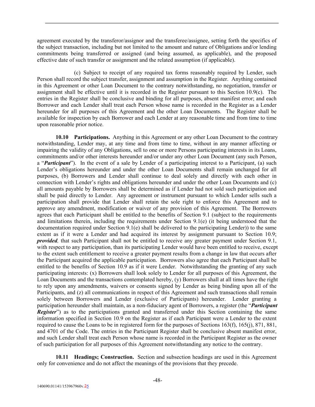 agreement executed by the transferor/assignor and the transferee/assignee, setting forth the specifics of the subject transaction, including but not limited to the amount and nature of Obligations and/or lending commitments being transferred or assigned (and being assumed, as applicable), and the proposed effective date of such transfer or assignment and the related assumption (if applicable). (c) Subject to receipt of any required tax forms reasonably required by Lender, such Person shall record the subject transfer, assignment and assumption in the Register. Anything contained in this Agreement or other Loan Document to the contrary notwithstanding, no negotiation, transfer or assignment shall be effective until it is recorded in the Register pursuant to this Section 10.9(c). The entries in the Register shall be conclusive and binding for all purposes, absent manifest error; and each Borrower and each Lender shall treat each Person whose name is recorded in the Register as a Lender hereunder for all purposes of this Agreement and the other Loan Documents. The Register shall be available for inspection by each Borrower and each Lender at any reasonable time and from time to time upon reasonable prior notice. 10.10 Participations. Anything in this Agreement or any other Loan Document to the contrary notwithstanding, Lender may, at any time and from time to time, without in any manner affecting or impairing the validity of any Obligations, sell to one or more Persons participating interests in its Loans, commitments and/or other interests hereunder and/or under any other Loan Document (any such Person, a “Participant”). In the event of a sale by Lender of a participating interest to a Participant, (a) such Lender’s obligations hereunder and under the other Loan Documents shall remain unchanged for all purposes, (b) Borrowers and Lender shall continue to deal solely and directly with each other in connection with Lender’s rights and obligations hereunder and under the other Loan Documents and (c) all amounts payable by Borrowers shall be determined as if Lender had not sold such participation and shall be paid directly to Lender. Any agreement or instrument pursuant to which Lender sells such a participation shall provide that Lender shall retain the sole right to enforce this Agreement and to approve any amendment, modification or waiver of any provision of this Agreement. The Borrowers agrees that each Participant shall be entitled to the benefits of Section 9.1 (subject to the requirements and limitations therein, including the requirements under Section 9.1(e) (it being understood that the documentation required under Section 9.1(e) shall be delivered to the participating Lender)) to the same extent as if it were a Lender and had acquired its interest by assignment pursuant to Section 10.9; provided, that such Participant shall not be entitled to receive any greater payment under Section 9.1, with respect to any participation, than its participating Lender would have been entitled to receive, except to the extent such entitlement to receive a greater payment results from a change in law that occurs after the Participant acquired the applicable participation. Borrowers also agree that each Participant shall be entitled to the benefits of Section 10.9 as if it were Lender. Notwithstanding the granting of any such participating interests: (x) Borrowers shall look solely to Lender for all purposes of this Agreement, the Loan Documents and the transactions contemplated hereby, (y) Borrowers shall at all times have the right to rely upon any amendments, waivers or consents signed by Lender as being binding upon all of the Participants, and (z) all communications in respect of this Agreement and such transactions shall remain solely between Borrowers and Lender (exclusive of Participants) hereunder. Lender granting a participation hereunder shall maintain, as a non-fiduciary agent of Borrowers, a register (the “Participant Register”) as to the participations granted and transferred under this Section containing the same information specified in Section 10.9 on the Register as if each Participant were a Lender to the extent required to cause the Loans to be in registered form for the purposes of Sections 163(f), 165(j), 871, 881, and 4701 of the Code. The entries in the Participant Register shall be conclusive absent manifest error, and such Lender shall treat each Person whose name is recorded in the Participant Register as the owner of such participation for all purposes of this Agreement notwithstanding any notice to the contrary. 10.11 Headings; Construction. Section and subsection headings are used in this Agreement only for convenience and do not affect the meanings of the provisions that they precede. -48- 140690.01141/153967960v.25