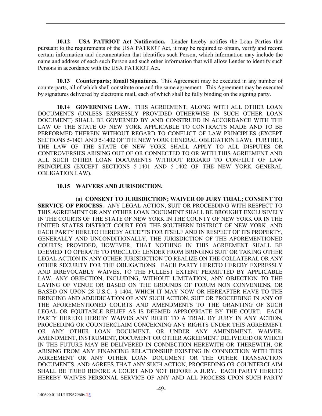 10.12 USA PATRIOT Act Notification. Lender hereby notifies the Loan Parties that pursuant to the requirements of the USA PATRIOT Act, it may be required to obtain, verify and record certain information and documentation that identifies such Person, which information may include the name and address of each such Person and such other information that will allow Lender to identify such Persons in accordance with the USA PATRIOT Act. 10.13 Counterparts; Email Signatures. This Agreement may be executed in any number of counterparts, all of which shall constitute one and the same agreement. This Agreement may be executed by signatures delivered by electronic mail, each of which shall be fully binding on the signing party. 10.14 GOVERNING LAW. THIS AGREEMENT, ALONG WITH ALL OTHER LOAN DOCUMENTS (UNLESS EXPRESSLY PROVIDED OTHERWISE IN SUCH OTHER LOAN DOCUMENT) SHALL BE GOVERNED BY AND CONSTRUED IN ACCORDANCE WITH THE LAW OF THE STATE OF NEW YORK APPLICABLE TO CONTRACTS MADE AND TO BE PERFORMED THEREIN WITHOUT REGARD TO CONFLICT OF LAW PRINCIPLES (EXCEPT SECTIONS 5-1401 AND 5-1402 OF THE NEW YORK GENERAL OBLIGATION LAW). FURTHER, THE LAW OF THE STATE OF NEW YORK SHALL APPLY TO ALL DISPUTES OR CONTROVERSIES ARISING OUT OF OR CONNECTED TO OR WITH THIS AGREEMENT AND ALL SUCH OTHER LOAN DOCUMENTS WITHOUT REGARD TO CONFLICT OF LAW PRINCIPLES (EXCEPT SECTIONS 5-1401 AND 5-1402 OF THE NEW YORK GENERAL OBLIGATION LAW). 10.15 WAIVERS AND JURISDICTION. (a) CONSENT TO JURISDICTION; WAIVER OF JURY TRIAL; CONSENT TO SERVICE OF PROCESS. ANY LEGAL ACTION, SUIT OR PROCEEDING WITH RESPECT TO THIS AGREEMENT OR ANY OTHER LOAN DOCUMENT SHALL BE BROUGHT EXCLUSIVELY IN THE COURTS OF THE STATE OF NEW YORK IN THE COUNTY OF NEW YORK OR IN THE UNITED STATES DISTRICT COURT FOR THE SOUTHERN DISTRICT OF NEW YORK, AND EACH PARTY HERETO HEREBY ACCEPTS FOR ITSELF AND IN RESPECT OF ITS PROPERTY, GENERALLY AND UNCONDITIONALLY, THE JURISDICTION OF THE AFOREMENTIONED COURTS; PROVIDED, HOWEVER, THAT NOTHING IN THIS AGREEMENT SHALL BE DEEMED TO OPERATE TO PRECLUDE LENDER FROM BRINGING SUIT OR TAKING OTHER LEGAL ACTION IN ANY OTHER JURISDICTION TO REALIZE ON THE COLLATERAL OR ANY OTHER SECURITY FOR THE OBLIGATIONS. EACH PARTY HERETO HEREBY EXPRESSLY AND IRREVOCABLY WAIVES, TO THE FULLEST EXTENT PERMITTED BY APPLICABLE LAW, ANY OBJECTION, INCLUDING, WITHOUT LIMITATION, ANY OBJECTION TO THE LAYING OF VENUE OR BASED ON THE GROUNDS OF FORUM NON CONVENIENS, OR BASED ON UPON 28 U.S.C. § 1404, WHICH IT MAY NOW OR HEREAFTER HAVE TO THE BRINGING AND ADJUDICATION OF ANY SUCH ACTION, SUIT OR PROCEEDING IN ANY OF THE AFOREMENTIONED COURTS AND AMENDMENTS TO THE GRANTING OF SUCH LEGAL OR EQUITABLE RELIEF AS IS DEEMED APPROPRIATE BY THE COURT. EACH PARTY HERETO HEREBY WAIVES ANY RIGHT TO A TRIAL BY JURY IN ANY ACTION, PROCEEDING OR COUNTERCLAIM CONCERNING ANY RIGHTS UNDER THIS AGREEMENT OR ANY OTHER LOAN DOCUMENT, OR UNDER ANY AMENDMENT, WAIVER, AMENDMENT, INSTRUMENT, DOCUMENT OR OTHER AGREEMENT DELIVERED OR WHICH IN THE FUTURE MAY BE DELIVERED IN CONNECTION HEREWITH OR THEREWITH, OR ARISING FROM ANY FINANCING RELATIONSHIP EXISTING IN CONNECTION WITH THIS AGREEMENT OR ANY OTHER LOAN DOCUMENT OR THE OTHER TRANSACTION DOCUMENTS, AND AGREES THAT ANY SUCH ACTION, PROCEEDING OR COUNTERCLAIM SHALL BE TRIED BEFORE A COURT AND NOT BEFORE A JURY. EACH PARTY HERETO HEREBY WAIVES PERSONAL SERVICE OF ANY AND ALL PROCESS UPON SUCH PARTY -49- 140690.01141/153967960v.25