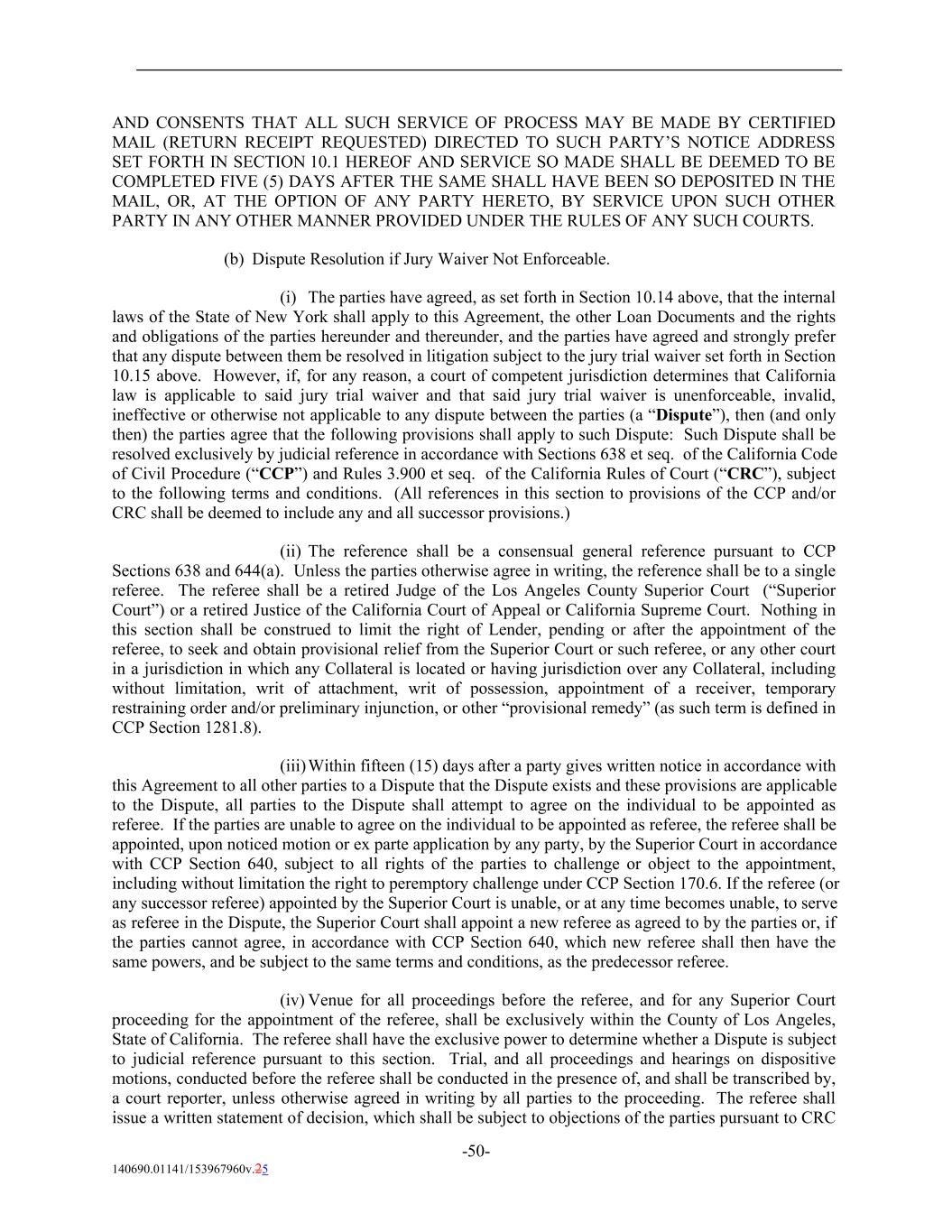 AND CONSENTS THAT ALL SUCH SERVICE OF PROCESS MAY BE MADE BY CERTIFIED MAIL (RETURN RECEIPT REQUESTED) DIRECTED TO SUCH PARTY’S NOTICE ADDRESS SET FORTH IN SECTION 10.1 HEREOF AND SERVICE SO MADE SHALL BE DEEMED TO BE COMPLETED FIVE (5) DAYS AFTER THE SAME SHALL HAVE BEEN SO DEPOSITED IN THE MAIL, OR, AT THE OPTION OF ANY PARTY HERETO, BY SERVICE UPON SUCH OTHER PARTY IN ANY OTHER MANNER PROVIDED UNDER THE RULES OF ANY SUCH COURTS. (b) Dispute Resolution if Jury Waiver Not Enforceable. (i) The parties have agreed, as set forth in Section 10.14 above, that the internal laws of the State of New York shall apply to this Agreement, the other Loan Documents and the rights and obligations of the parties hereunder and thereunder, and the parties have agreed and strongly prefer that any dispute between them be resolved in litigation subject to the jury trial waiver set forth in Section 10.15 above. However, if, for any reason, a court of competent jurisdiction determines that California law is applicable to said jury trial waiver and that said jury trial waiver is unenforceable, invalid, ineffective or otherwise not applicable to any dispute between the parties (a “Dispute”), then (and only then) the parties agree that the following provisions shall apply to such Dispute: Such Dispute shall be resolved exclusively by judicial reference in accordance with Sections 638 et seq. of the California Code of Civil Procedure (“CCP”) and Rules 3.900 et seq. of the California Rules of Court (“CRC”), subject to the following terms and conditions. (All references in this section to provisions of the CCP and/or CRC shall be deemed to include any and all successor provisions.) (ii) The reference shall be a consensual general reference pursuant to CCP Sections 638 and 644(a). Unless the parties otherwise agree in writing, the reference shall be to a single referee. The referee shall be a retired Judge of the Los Angeles County Superior Court (“Superior Court”) or a retired Justice of the California Court of Appeal or California Supreme Court. Nothing in this section shall be construed to limit the right of Lender, pending or after the appointment of the referee, to seek and obtain provisional relief from the Superior Court or such referee, or any other court in a jurisdiction in which any Collateral is located or having jurisdiction over any Collateral, including without limitation, writ of attachment, writ of possession, appointment of a receiver, temporary restraining order and/or preliminary injunction, or other “provisional remedy” (as such term is defined in CCP Section 1281.8). (iii)Within fifteen (15) days after a party gives written notice in accordance with this Agreement to all other parties to a Dispute that the Dispute exists and these provisions are applicable to the Dispute, all parties to the Dispute shall attempt to agree on the individual to be appointed as referee. If the parties are unable to agree on the individual to be appointed as referee, the referee shall be appointed, upon noticed motion or ex parte application by any party, by the Superior Court in accordance with CCP Section 640, subject to all rights of the parties to challenge or object to the appointment, including without limitation the right to peremptory challenge under CCP Section 170.6. If the referee (or any successor referee) appointed by the Superior Court is unable, or at any time becomes unable, to serve as referee in the Dispute, the Superior Court shall appoint a new referee as agreed to by the parties or, if the parties cannot agree, in accordance with CCP Section 640, which new referee shall then have the same powers, and be subject to the same terms and conditions, as the predecessor referee. (iv) Venue for all proceedings before the referee, and for any Superior Court proceeding for the appointment of the referee, shall be exclusively within the County of Los Angeles, State of California. The referee shall have the exclusive power to determine whether a Dispute is subject to judicial reference pursuant to this section. Trial, and all proceedings and hearings on dispositive motions, conducted before the referee shall be conducted in the presence of, and shall be transcribed by, a court reporter, unless otherwise agreed in writing by all parties to the proceeding. The referee shall issue a written statement of decision, which shall be subject to objections of the parties pursuant to CRC -50- 140690.01141/153967960v.25