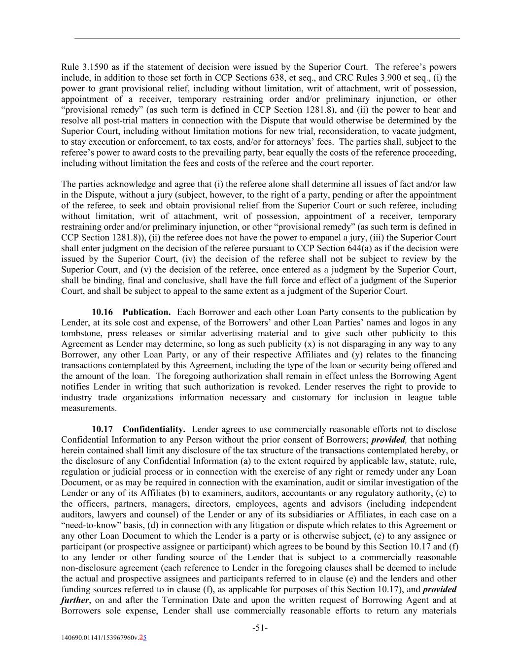 Rule 3.1590 as if the statement of decision were issued by the Superior Court. The referee’s powers include, in addition to those set forth in CCP Sections 638, et seq., and CRC Rules 3.900 et seq., (i) the power to grant provisional relief, including without limitation, writ of attachment, writ of possession, appointment of a receiver, temporary restraining order and/or preliminary injunction, or other “provisional remedy” (as such term is defined in CCP Section 1281.8), and (ii) the power to hear and resolve all post-trial matters in connection with the Dispute that would otherwise be determined by the Superior Court, including without limitation motions for new trial, reconsideration, to vacate judgment, to stay execution or enforcement, to tax costs, and/or for attorneys’ fees. The parties shall, subject to the referee’s power to award costs to the prevailing party, bear equally the costs of the reference proceeding, including without limitation the fees and costs of the referee and the court reporter. The parties acknowledge and agree that (i) the referee alone shall determine all issues of fact and/or law in the Dispute, without a jury (subject, however, to the right of a party, pending or after the appointment of the referee, to seek and obtain provisional relief from the Superior Court or such referee, including without limitation, writ of attachment, writ of possession, appointment of a receiver, temporary restraining order and/or preliminary injunction, or other “provisional remedy” (as such term is defined in CCP Section 1281.8)), (ii) the referee does not have the power to empanel a jury, (iii) the Superior Court shall enter judgment on the decision of the referee pursuant to CCP Section 644(a) as if the decision were issued by the Superior Court, (iv) the decision of the referee shall not be subject to review by the Superior Court, and (v) the decision of the referee, once entered as a judgment by the Superior Court, shall be binding, final and conclusive, shall have the full force and effect of a judgment of the Superior Court, and shall be subject to appeal to the same extent as a judgment of the Superior Court. 10.16 Publication. Each Borrower and each other Loan Party consents to the publication by Lender, at its sole cost and expense, of the Borrowers’ and other Loan Parties’ names and logos in any tombstone, press releases or similar advertising material and to give such other publicity to this Agreement as Lender may determine, so long as such publicity (x) is not disparaging in any way to any Borrower, any other Loan Party, or any of their respective Affiliates and (y) relates to the financing transactions contemplated by this Agreement, including the type of the loan or security being offered and the amount of the loan. The foregoing authorization shall remain in effect unless the Borrowing Agent notifies Lender in writing that such authorization is revoked. Lender reserves the right to provide to industry trade organizations information necessary and customary for inclusion in league table measurements. 10.17 Confidentiality. Lender agrees to use commercially reasonable efforts not to disclose Confidential Information to any Person without the prior consent of Borrowers; provided, that nothing herein contained shall limit any disclosure of the tax structure of the transactions contemplated hereby, or the disclosure of any Confidential Information (a) to the extent required by applicable law, statute, rule, regulation or judicial process or in connection with the exercise of any right or remedy under any Loan Document, or as may be required in connection with the examination, audit or similar investigation of the Lender or any of its Affiliates (b) to examiners, auditors, accountants or any regulatory authority, (c) to the officers, partners, managers, directors, employees, agents and advisors (including independent auditors, lawyers and counsel) of the Lender or any of its subsidiaries or Affiliates, in each case on a “need-to-know” basis, (d) in connection with any litigation or dispute which relates to this Agreement or any other Loan Document to which the Lender is a party or is otherwise subject, (e) to any assignee or participant (or prospective assignee or participant) which agrees to be bound by this Section 10.17 and (f) to any lender or other funding source of the Lender that is subject to a commercially reasonable non-disclosure agreement (each reference to Lender in the foregoing clauses shall be deemed to include the actual and prospective assignees and participants referred to in clause (e) and the lenders and other funding sources referred to in clause (f), as applicable for purposes of this Section 10.17), and provided further, on and after the Termination Date and upon the written request of Borrowing Agent and at Borrowers sole expense, Lender shall use commercially reasonable efforts to return any materials -51- 140690.01141/153967960v.25