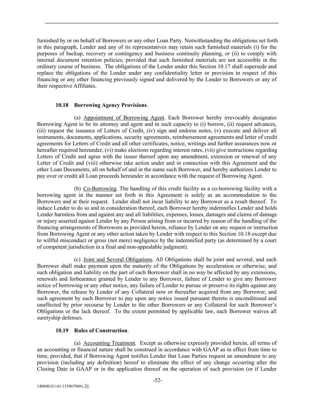 furnished by or on behalf of Borrowers or any other Loan Party. Notwithstanding the obligations set forth in this paragraph, Lender and any of its representatives may retain such furnished materials (i) for the purposes of backup, recovery or contingency and business continuity planning, or (ii) to comply with internal document retention policies; provided that such furnished materials are not accessible in the ordinary course of business. The obligations of the Lender under this Section 10.17 shall supersede and replace the obligations of the Lender under any confidentiality letter or provision in respect of this financing or any other financing previously signed and delivered by the Lender to Borrowers or any of their respective Affiliates. 10.18 Borrowing Agency Provisions. (a) Appointment of Borrowing Agent. Each Borrower hereby irrevocably designates Borrowing Agent to be its attorney and agent and in such capacity to (i) borrow, (ii) request advances, (iii) request the issuance of Letters of Credit, (iv) sign and endorse notes, (v) execute and deliver all instruments, documents, applications, security agreements, reimbursement agreements and letter of credit agreements for Letters of Credit and all other certificates, notice, writings and further assurances now or hereafter required hereunder, (vi) make elections regarding interest rates, (vii) give instructions regarding Letters of Credit and agree with the issuer thereof upon any amendment, extension or renewal of any Letter of Credit and (viii) otherwise take action under and in connection with this Agreement and the other Loan Documents, all on behalf of and in the name such Borrower, and hereby authorizes Lender to pay over or credit all Loan proceeds hereunder in accordance with the request of Borrowing Agent. (b) Co-Borrowing. The handling of this credit facility as a co-borrowing facility with a borrowing agent in the manner set forth in this Agreement is solely as an accommodation to the Borrowers and at their request. Lender shall not incur liability to any Borrower as a result thereof. To induce Lender to do so and in consideration thereof, each Borrower hereby indemnifies Lender and holds Lender harmless from and against any and all liabilities, expenses, losses, damages and claims of damage or injury asserted against Lender by any Person arising from or incurred by reason of the handling of the financing arrangements of Borrowers as provided herein, reliance by Lender on any request or instruction from Borrowing Agent or any other action taken by Lender with respect to this Section 10.18 except due to willful misconduct or gross (not mere) negligence by the indemnified party (as determined by a court of competent jurisdiction in a final and non-appealable judgment). (c) Joint and Several Obligations. All Obligations shall be joint and several, and each Borrower shall make payment upon the maturity of the Obligations by acceleration or otherwise, and such obligation and liability on the part of each Borrower shall in no way be affected by any extensions, renewals and forbearance granted by Lender to any Borrower, failure of Lender to give any Borrower notice of borrowing or any other notice, any failure of Lender to pursue or preserve its rights against any Borrower, the release by Lender of any Collateral now or thereafter acquired from any Borrower, and such agreement by each Borrower to pay upon any notice issued pursuant thereto is unconditional and unaffected by prior recourse by Lender to the other Borrowers or any Collateral for such Borrower’s Obligations or the lack thereof. To the extent permitted by applicable law, each Borrower waives all suretyship defenses. 10.19 Rules of Construction. (a) Accounting Treatment. Except as otherwise expressly provided herein, all terms of an accounting or financial nature shall be construed in accordance with GAAP as in effect from time to time, provided, that if Borrowing Agent notifies Lender that Loan Parties request an amendment to any provision (including any definition) hereof to eliminate the effect of any change occurring after the Closing Date in GAAP or in the application thereof on the operation of such provision (or if Lender -52- 140690.01141/153967960v.25