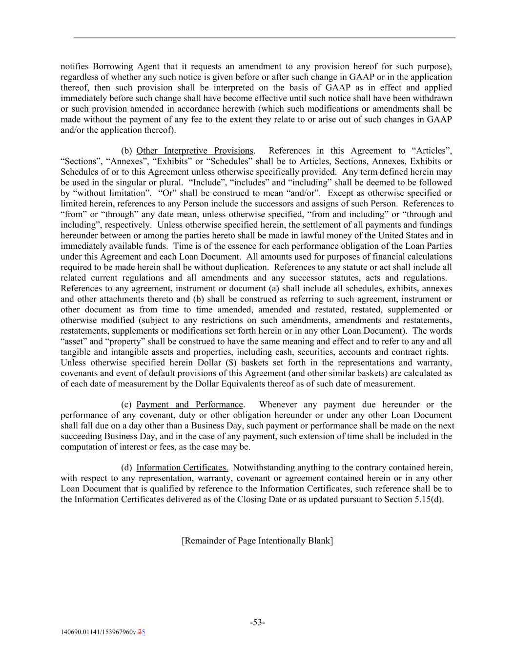 notifies Borrowing Agent that it requests an amendment to any provision hereof for such purpose), regardless of whether any such notice is given before or after such change in GAAP or in the application thereof, then such provision shall be interpreted on the basis of GAAP as in effect and applied immediately before such change shall have become effective until such notice shall have been withdrawn or such provision amended in accordance herewith (which such modifications or amendments shall be made without the payment of any fee to the extent they relate to or arise out of such changes in GAAP and/or the application thereof). (b) Other Interpretive Provisions. References in this Agreement to “Articles”, “Sections”, “Annexes”, “Exhibits” or “Schedules” shall be to Articles, Sections, Annexes, Exhibits or Schedules of or to this Agreement unless otherwise specifically provided. Any term defined herein may be used in the singular or plural. “Include”, “includes” and “including” shall be deemed to be followed by “without limitation”. “Or” shall be construed to mean “and/or”. Except as otherwise specified or limited herein, references to any Person include the successors and assigns of such Person. References to “from” or “through” any date mean, unless otherwise specified, “from and including” or “through and including”, respectively. Unless otherwise specified herein, the settlement of all payments and fundings hereunder between or among the parties hereto shall be made in lawful money of the United States and in immediately available funds. Time is of the essence for each performance obligation of the Loan Parties under this Agreement and each Loan Document. All amounts used for purposes of financial calculations required to be made herein shall be without duplication. References to any statute or act shall include all related current regulations and all amendments and any successor statutes, acts and regulations. References to any agreement, instrument or document (a) shall include all schedules, exhibits, annexes and other attachments thereto and (b) shall be construed as referring to such agreement, instrument or other document as from time to time amended, amended and restated, restated, supplemented or otherwise modified (subject to any restrictions on such amendments, amendments and restatements, restatements, supplements or modifications set forth herein or in any other Loan Document). The words “asset” and “property” shall be construed to have the same meaning and effect and to refer to any and all tangible and intangible assets and properties, including cash, securities, accounts and contract rights. Unless otherwise specified herein Dollar ($) baskets set forth in the representations and warranty, covenants and event of default provisions of this Agreement (and other similar baskets) are calculated as of each date of measurement by the Dollar Equivalents thereof as of such date of measurement. (c) Payment and Performance. Whenever any payment due hereunder or the performance of any covenant, duty or other obligation hereunder or under any other Loan Document shall fall due on a day other than a Business Day, such payment or performance shall be made on the next succeeding Business Day, and in the case of any payment, such extension of time shall be included in the computation of interest or fees, as the case may be. (d) Information Certificates. Notwithstanding anything to the contrary contained herein, with respect to any representation, warranty, covenant or agreement contained herein or in any other Loan Document that is qualified by reference to the Information Certificates, such reference shall be to the Information Certificates delivered as of the Closing Date or as updated pursuant to Section 5.15(d). [Remainder of Page Intentionally Blank] -53- 140690.01141/153967960v.25