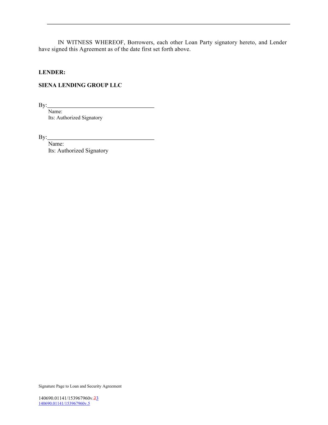 IN WITNESS WHEREOF, Borrowers, each other Loan Party signatory hereto, and Lender have signed this Agreement as of the date first set forth above. LENDER: SIENA LENDING GROUP LLC By: Name: Its: Authorized Signatory By: Name: Its: Authorized Signatory Signature Page to Loan and Security Agreement 140690.01141/153967960v.23 140690.01141/153967960v.5
