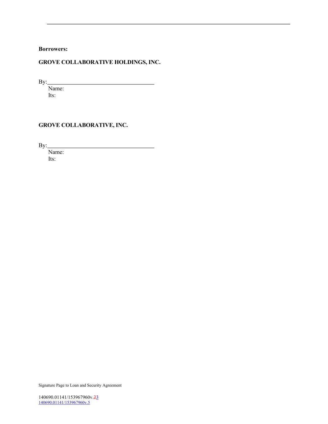 Borrowers: GROVE COLLABORATIVE HOLDINGS, INC. By: Name: Its: GROVE COLLABORATIVE, INC. By: Name: Its: Signature Page to Loan and Security Agreement 140690.01141/153967960v.23 140690.01141/153967960v.5