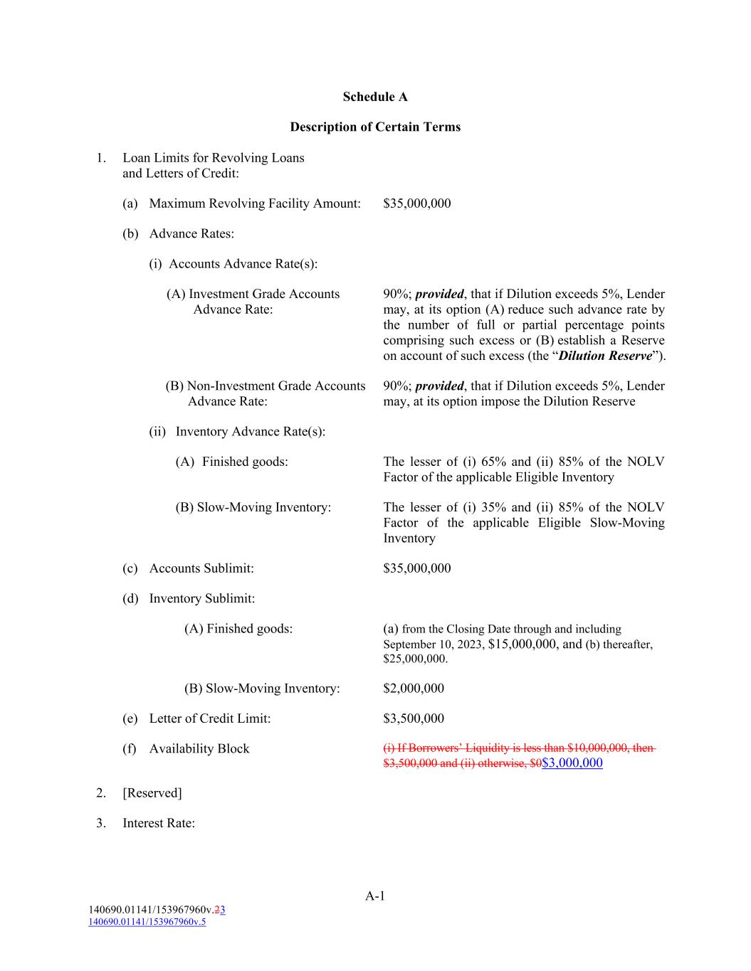 A-1 140690.01141/153967960v.23 140690.01141/153967960v.5 (B) Slow-Moving Inventory: The lesser of (i) 35% and (ii) 85% of the NOLV Factor of the applicable Eligible Slow-Moving Inventory (a) Maximum Revolving Facility Amount: (c) Accounts Sublimit: $35,000,000 (A) Investment Grade Accounts Advance Rate: $35,000,000 (d) Inventory Sublimit: 90%; provided, that if Dilution exceeds 5%, Lender may, at its option (A) reduce such advance rate by the number of full or partial percentage points comprising such excess or (B) establish a Reserve on account of such excess (the “Dilution Reserve”). 1. Loan Limits for Revolving Loans and Letters of Credit: (A) Finished goods: (a) from the Closing Date through and including September 10, 2023, $15,000,000, and (b) thereafter, $25,000,000. (B) Non-Investment Grade Accounts Advance Rate: (B) Slow-Moving Inventory: 90%; provided, that if Dilution exceeds 5%, Lender may, at its option impose the Dilution Reserve $2,000,000 (b) Advance Rates: (e) Letter of Credit Limit: $3,500,000 (ii) Inventory Advance Rate(s): (f) Availability Block (i) If Borrowers’ Liquidity is less than $10,000,000, then $3,500,000 and (ii) otherwise, $0$3,000,000 Schedule A Description of Certain Terms 2. [Reserved] (A) Finished goods: 3. Interest Rate: The lesser of (i) 65% and (ii) 85% of the NOLV Factor of the applicable Eligible Inventory (i) Accounts Advance Rate(s):
