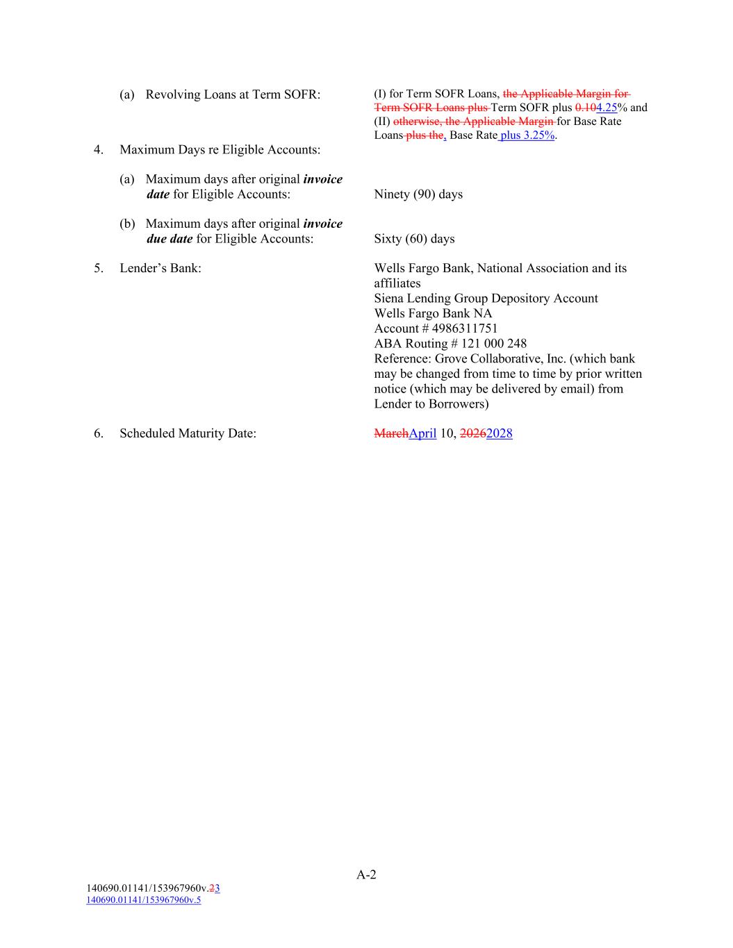 A-2 140690.01141/153967960v.23 140690.01141/153967960v.5 (b) Maximum days after original invoice due date for Eligible Accounts: 4. Maximum Days re Eligible Accounts: Sixty (60) days (a) Revolving Loans at Term SOFR: 5. Lender’s Bank: Wells Fargo Bank, National Association and its affiliates Siena Lending Group Depository Account Wells Fargo Bank NA Account # 4986311751 ABA Routing # 121 000 248 Reference: Grove Collaborative, Inc. (which bank may be changed from time to time by prior written notice (which may be delivered by email) from Lender to Borrowers) (I) for Term SOFR Loans, the Applicable Margin for Term SOFR Loans plus Term SOFR plus 0.104.25% and (II) otherwise, the Applicable Margin for Base Rate Loans plus the, Base Rate plus 3.25%. 6. Scheduled Maturity Date: (a) Maximum days after original invoice date for Eligible Accounts: MarchApril 10, 20262028 Ninety (90) days