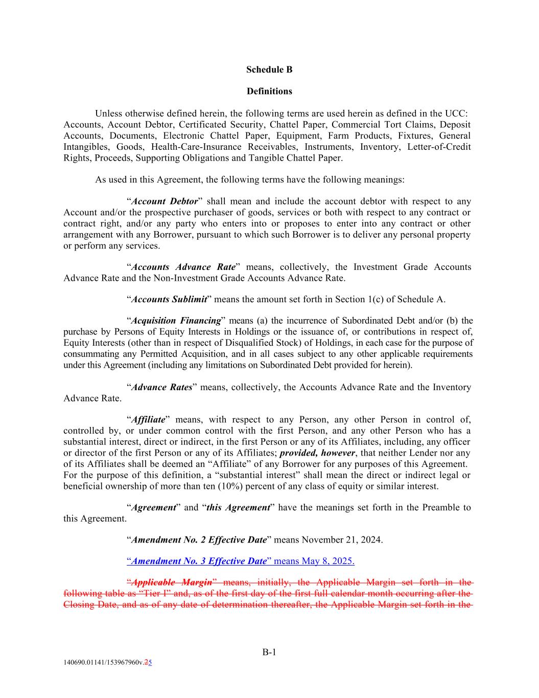 Schedule B Definitions Unless otherwise defined herein, the following terms are used herein as defined in the UCC: Accounts, Account Debtor, Certificated Security, Chattel Paper, Commercial Tort Claims, Deposit Accounts, Documents, Electronic Chattel Paper, Equipment, Farm Products, Fixtures, General Intangibles, Goods, Health-Care-Insurance Receivables, Instruments, Inventory, Letter-of-Credit Rights, Proceeds, Supporting Obligations and Tangible Chattel Paper. As used in this Agreement, the following terms have the following meanings: “Account Debtor” shall mean and include the account debtor with respect to any Account and/or the prospective purchaser of goods, services or both with respect to any contract or contract right, and/or any party who enters into or proposes to enter into any contract or other arrangement with any Borrower, pursuant to which such Borrower is to deliver any personal property or perform any services. “Accounts Advance Rate” means, collectively, the Investment Grade Accounts Advance Rate and the Non-Investment Grade Accounts Advance Rate. “Accounts Sublimit” means the amount set forth in Section 1(c) of Schedule A. “Acquisition Financing” means (a) the incurrence of Subordinated Debt and/or (b) the purchase by Persons of Equity Interests in Holdings or the issuance of, or contributions in respect of, Equity Interests (other than in respect of Disqualified Stock) of Holdings, in each case for the purpose of consummating any Permitted Acquisition, and in all cases subject to any other applicable requirements under this Agreement (including any limitations on Subordinated Debt provided for herein). “Advance Rates” means, collectively, the Accounts Advance Rate and the Inventory Advance Rate. “Affiliate” means, with respect to any Person, any other Person in control of, controlled by, or under common control with the first Person, and any other Person who has a substantial interest, direct or indirect, in the first Person or any of its Affiliates, including, any officer or director of the first Person or any of its Affiliates; provided, however, that neither Lender nor any of its Affiliates shall be deemed an “Affiliate” of any Borrower for any purposes of this Agreement. For the purpose of this definition, a “substantial interest” shall mean the direct or indirect legal or beneficial ownership of more than ten (10%) percent of any class of equity or similar interest. “Agreement” and “this Agreement” have the meanings set forth in the Preamble to this Agreement. “Amendment No. 2 Effective Date” means November 21, 2024. “Amendment No. 3 Effective Date” means May 8, 2025. “Applicable Margin” means, initially, the Applicable Margin set forth in the following table as “Tier I” and, as of the first day of the first full calendar month occurring after the Closing Date, and as of any date of determination thereafter, the Applicable Margin set forth in the B-1 140690.01141/153967960v.25