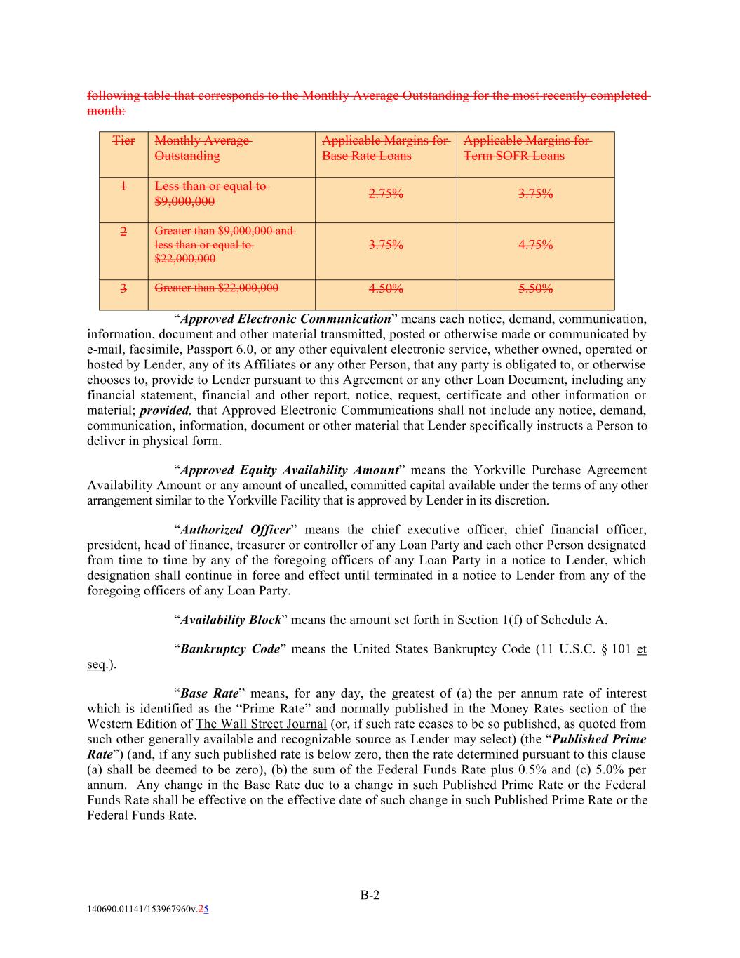 B-2 140690.01141/153967960v.25 3.75% Applicable Margins for Base Rate Loans 2 Applicable Margins for Term SOFR Loans Greater than $9,000,000 and less than or equal to $22,000,000 3.75% 4.75% Tier 1 3 Greater than $22,000,000 Less than or equal to $9,000,000 4.50% Monthly Average Outstanding 5.50% 2.75% “Approved Electronic Communication” means each notice, demand, communication, information, document and other material transmitted, posted or otherwise made or communicated by e-mail, facsimile, Passport 6.0, or any other equivalent electronic service, whether owned, operated or hosted by Lender, any of its Affiliates or any other Person, that any party is obligated to, or otherwise chooses to, provide to Lender pursuant to this Agreement or any other Loan Document, including any financial statement, financial and other report, notice, request, certificate and other information or material; provided, that Approved Electronic Communications shall not include any notice, demand, communication, information, document or other material that Lender specifically instructs a Person to deliver in physical form. “Approved Equity Availability Amount” means the Yorkville Purchase Agreement Availability Amount or any amount of uncalled, committed capital available under the terms of any other arrangement similar to the Yorkville Facility that is approved by Lender in its discretion. “Authorized Officer” means the chief executive officer, chief financial officer, president, head of finance, treasurer or controller of any Loan Party and each other Person designated from time to time by any of the foregoing officers of any Loan Party in a notice to Lender, which designation shall continue in force and effect until terminated in a notice to Lender from any of the foregoing officers of any Loan Party. “Availability Block” means the amount set forth in Section 1(f) of Schedule A. “Bankruptcy Code” means the United States Bankruptcy Code (11 U.S.C. § 101 et seq.). “Base Rate” means, for any day, the greatest of (a) the per annum rate of interest which is identified as the “Prime Rate” and normally published in the Money Rates section of the Western Edition of The Wall Street Journal (or, if such rate ceases to be so published, as quoted from such other generally available and recognizable source as Lender may select) (the “Published Prime Rate”) (and, if any such published rate is below zero, then the rate determined pursuant to this clause (a) shall be deemed to be zero), (b) the sum of the Federal Funds Rate plus 0.5% and (c) 5.0% per annum. Any change in the Base Rate due to a change in such Published Prime Rate or the Federal Funds Rate shall be effective on the effective date of such change in such Published Prime Rate or the Federal Funds Rate. following table that corresponds to the Monthly Average Outstanding for the most recently completed month: