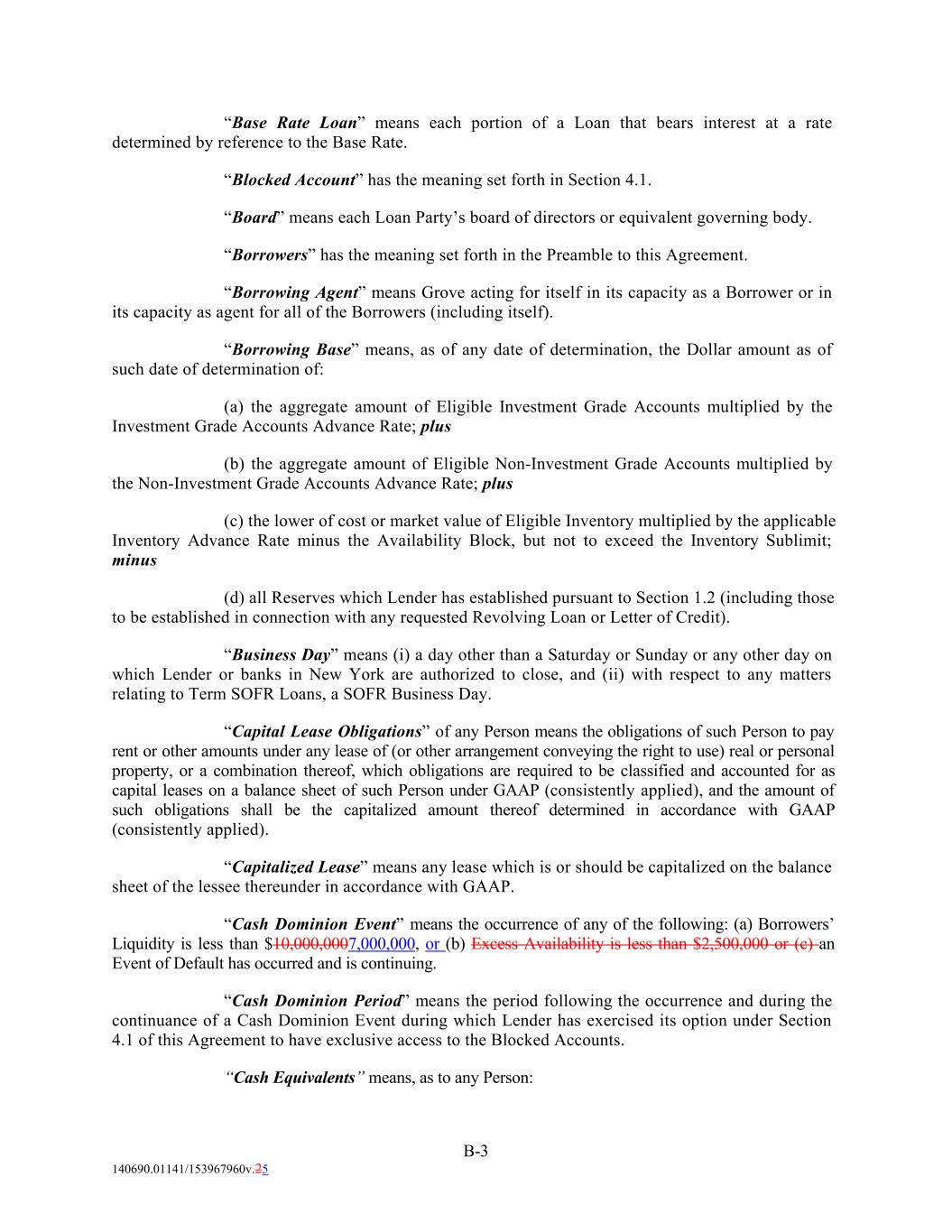 “Base Rate Loan” means each portion of a Loan that bears interest at a rate determined by reference to the Base Rate. “Blocked Account” has the meaning set forth in Section 4.1. “Board” means each Loan Party’s board of directors or equivalent governing body. “Borrowers” has the meaning set forth in the Preamble to this Agreement. “Borrowing Agent” means Grove acting for itself in its capacity as a Borrower or in its capacity as agent for all of the Borrowers (including itself). “Borrowing Base” means, as of any date of determination, the Dollar amount as of such date of determination of: (a) the aggregate amount of Eligible Investment Grade Accounts multiplied by the Investment Grade Accounts Advance Rate; plus (b) the aggregate amount of Eligible Non-Investment Grade Accounts multiplied by the Non-Investment Grade Accounts Advance Rate; plus (c) the lower of cost or market value of Eligible Inventory multiplied by the applicable Inventory Advance Rate minus the Availability Block, but not to exceed the Inventory Sublimit; minus (d) all Reserves which Lender has established pursuant to Section 1.2 (including those to be established in connection with any requested Revolving Loan or Letter of Credit). “Business Day” means (i) a day other than a Saturday or Sunday or any other day on which Lender or banks in New York are authorized to close, and (ii) with respect to any matters relating to Term SOFR Loans, a SOFR Business Day. “Capital Lease Obligations” of any Person means the obligations of such Person to pay rent or other amounts under any lease of (or other arrangement conveying the right to use) real or personal property, or a combination thereof, which obligations are required to be classified and accounted for as capital leases on a balance sheet of such Person under GAAP (consistently applied), and the amount of such obligations shall be the capitalized amount thereof determined in accordance with GAAP (consistently applied). “Capitalized Lease” means any lease which is or should be capitalized on the balance sheet of the lessee thereunder in accordance with GAAP. “Cash Dominion Event” means the occurrence of any of the following: (a) Borrowers’ Liquidity is less than $10,000,0007,000,000, or (b) Excess Availability is less than $2,500,000 or (c) an Event of Default has occurred and is continuing. “Cash Dominion Period” means the period following the occurrence and during the continuance of a Cash Dominion Event during which Lender has exercised its option under Section 4.1 of this Agreement to have exclusive access to the Blocked Accounts. “Cash Equivalents” means, as to any Person: B-3 140690.01141/153967960v.25