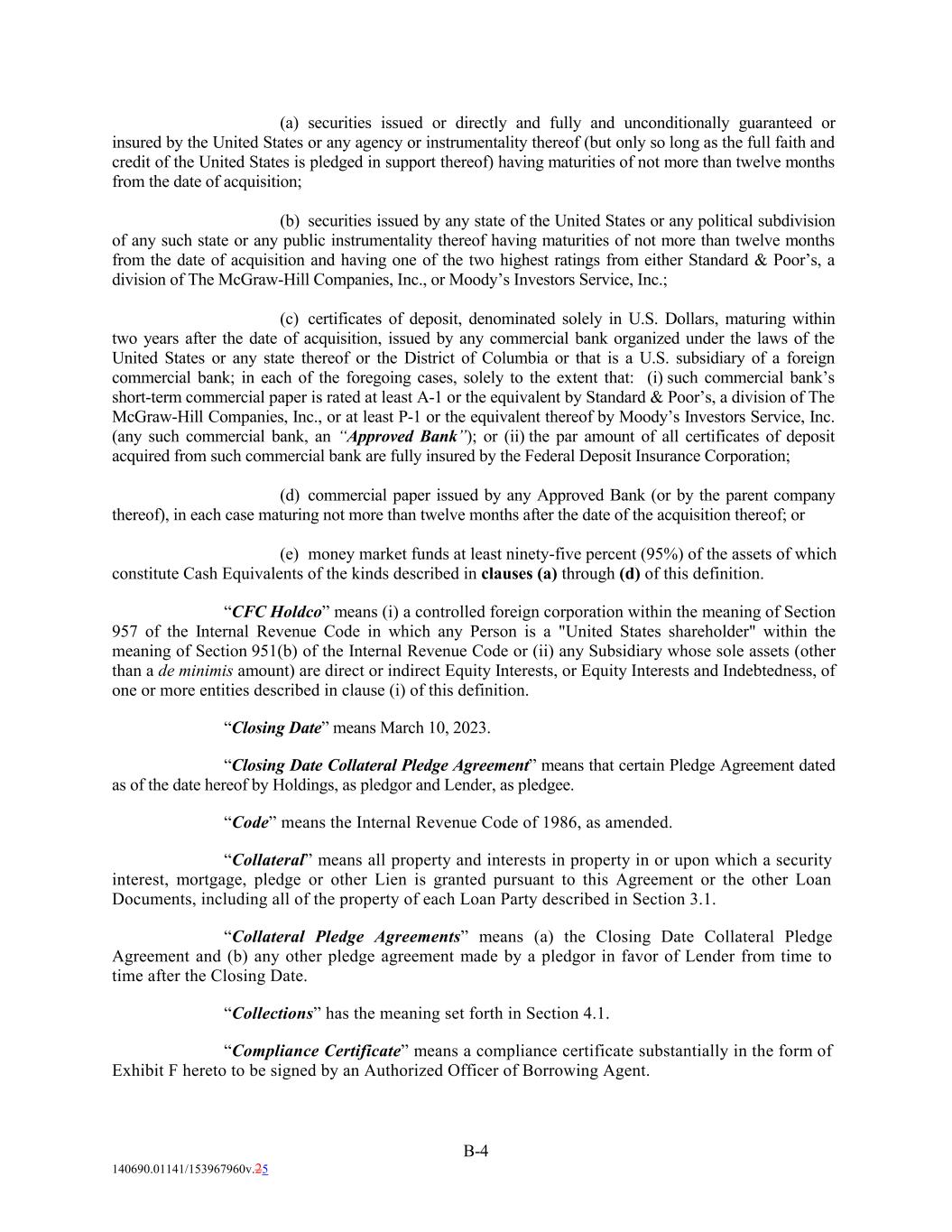 (a) securities issued or directly and fully and unconditionally guaranteed or insured by the United States or any agency or instrumentality thereof (but only so long as the full faith and credit of the United States is pledged in support thereof) having maturities of not more than twelve months from the date of acquisition; (b) securities issued by any state of the United States or any political subdivision of any such state or any public instrumentality thereof having maturities of not more than twelve months from the date of acquisition and having one of the two highest ratings from either Standard & Poor’s, a division of The McGraw-Hill Companies, Inc., or Moody’s Investors Service, Inc.; (c) certificates of deposit, denominated solely in U.S. Dollars, maturing within two years after the date of acquisition, issued by any commercial bank organized under the laws of the United States or any state thereof or the District of Columbia or that is a U.S. subsidiary of a foreign commercial bank; in each of the foregoing cases, solely to the extent that: (i) such commercial bank’s short-term commercial paper is rated at least A-1 or the equivalent by Standard & Poor’s, a division of The McGraw-Hill Companies, Inc., or at least P-1 or the equivalent thereof by Moody’s Investors Service, Inc. (any such commercial bank, an “Approved Bank”); or (ii) the par amount of all certificates of deposit acquired from such commercial bank are fully insured by the Federal Deposit Insurance Corporation; (d) commercial paper issued by any Approved Bank (or by the parent company thereof), in each case maturing not more than twelve months after the date of the acquisition thereof; or (e) money market funds at least ninety-five percent (95%) of the assets of which constitute Cash Equivalents of the kinds described in clauses (a) through (d) of this definition. “CFC Holdco” means (i) a controlled foreign corporation within the meaning of Section 957 of the Internal Revenue Code in which any Person is a "United States shareholder" within the meaning of Section 951(b) of the Internal Revenue Code or (ii) any Subsidiary whose sole assets (other than a de minimis amount) are direct or indirect Equity Interests, or Equity Interests and Indebtedness, of one or more entities described in clause (i) of this definition. “Closing Date” means March 10, 2023. “Closing Date Collateral Pledge Agreement” means that certain Pledge Agreement dated as of the date hereof by Holdings, as pledgor and Lender, as pledgee. “Code” means the Internal Revenue Code of 1986, as amended. “Collateral” means all property and interests in property in or upon which a security interest, mortgage, pledge or other Lien is granted pursuant to this Agreement or the other Loan Documents, including all of the property of each Loan Party described in Section 3.1. “Collateral Pledge Agreements” means (a) the Closing Date Collateral Pledge Agreement and (b) any other pledge agreement made by a pledgor in favor of Lender from time to time after the Closing Date. “Collections” has the meaning set forth in Section 4.1. “Compliance Certificate” means a compliance certificate substantially in the form of Exhibit F hereto to be signed by an Authorized Officer of Borrowing Agent. B-4 140690.01141/153967960v.25