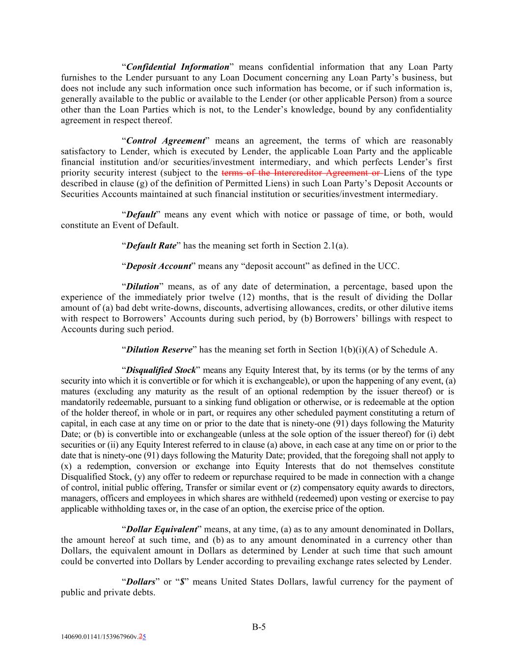 “Confidential Information” means confidential information that any Loan Party furnishes to the Lender pursuant to any Loan Document concerning any Loan Party’s business, but does not include any such information once such information has become, or if such information is, generally available to the public or available to the Lender (or other applicable Person) from a source other than the Loan Parties which is not, to the Lender’s knowledge, bound by any confidentiality agreement in respect thereof. “Control Agreement” means an agreement, the terms of which are reasonably satisfactory to Lender, which is executed by Lender, the applicable Loan Party and the applicable financial institution and/or securities/investment intermediary, and which perfects Lender’s first priority security interest (subject to the terms of the Intercreditor Agreement or Liens of the type described in clause (g) of the definition of Permitted Liens) in such Loan Party’s Deposit Accounts or Securities Accounts maintained at such financial institution or securities/investment intermediary. “Default” means any event which with notice or passage of time, or both, would constitute an Event of Default. “Default Rate” has the meaning set forth in Section 2.1(a). “Deposit Account” means any “deposit account” as defined in the UCC. “Dilution” means, as of any date of determination, a percentage, based upon the experience of the immediately prior twelve (12) months, that is the result of dividing the Dollar amount of (a) bad debt write-downs, discounts, advertising allowances, credits, or other dilutive items with respect to Borrowers’ Accounts during such period, by (b) Borrowers’ billings with respect to Accounts during such period. “Dilution Reserve” has the meaning set forth in Section 1(b)(i)(A) of Schedule A. “Disqualified Stock” means any Equity Interest that, by its terms (or by the terms of any security into which it is convertible or for which it is exchangeable), or upon the happening of any event, (a) matures (excluding any maturity as the result of an optional redemption by the issuer thereof) or is mandatorily redeemable, pursuant to a sinking fund obligation or otherwise, or is redeemable at the option of the holder thereof, in whole or in part, or requires any other scheduled payment constituting a return of capital, in each case at any time on or prior to the date that is ninety-one (91) days following the Maturity Date; or (b) is convertible into or exchangeable (unless at the sole option of the issuer thereof) for (i) debt securities or (ii) any Equity Interest referred to in clause (a) above, in each case at any time on or prior to the date that is ninety-one (91) days following the Maturity Date; provided, that the foregoing shall not apply to (x) a redemption, conversion or exchange into Equity Interests that do not themselves constitute Disqualified Stock, (y) any offer to redeem or repurchase required to be made in connection with a change of control, initial public offering, Transfer or similar event or (z) compensatory equity awards to directors, managers, officers and employees in which shares are withheld (redeemed) upon vesting or exercise to pay applicable withholding taxes or, in the case of an option, the exercise price of the option. “Dollar Equivalent” means, at any time, (a) as to any amount denominated in Dollars, the amount hereof at such time, and (b) as to any amount denominated in a currency other than Dollars, the equivalent amount in Dollars as determined by Lender at such time that such amount could be converted into Dollars by Lender according to prevailing exchange rates selected by Lender. “Dollars” or “$” means United States Dollars, lawful currency for the payment of public and private debts. B-5 140690.01141/153967960v.25