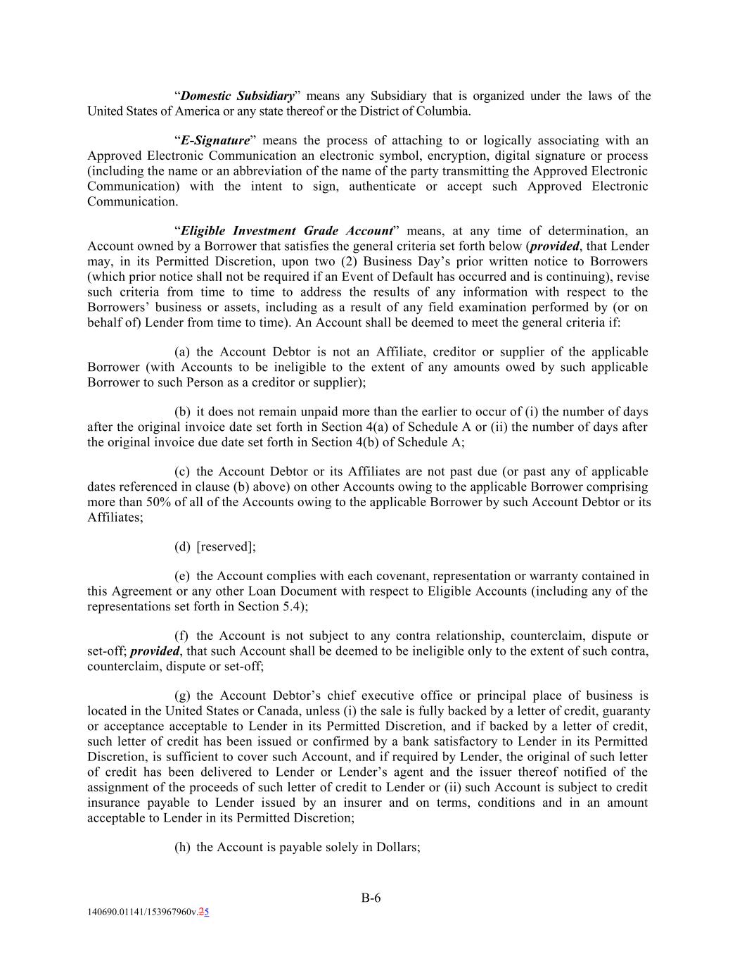 “Domestic Subsidiary” means any Subsidiary that is organized under the laws of the United States of America or any state thereof or the District of Columbia. “E-Signature” means the process of attaching to or logically associating with an Approved Electronic Communication an electronic symbol, encryption, digital signature or process (including the name or an abbreviation of the name of the party transmitting the Approved Electronic Communication) with the intent to sign, authenticate or accept such Approved Electronic Communication. “Eligible Investment Grade Account” means, at any time of determination, an Account owned by a Borrower that satisfies the general criteria set forth below (provided, that Lender may, in its Permitted Discretion, upon two (2) Business Day’s prior written notice to Borrowers (which prior notice shall not be required if an Event of Default has occurred and is continuing), revise such criteria from time to time to address the results of any information with respect to the Borrowers’ business or assets, including as a result of any field examination performed by (or on behalf of) Lender from time to time). An Account shall be deemed to meet the general criteria if: (a) the Account Debtor is not an Affiliate, creditor or supplier of the applicable Borrower (with Accounts to be ineligible to the extent of any amounts owed by such applicable Borrower to such Person as a creditor or supplier); (b) it does not remain unpaid more than the earlier to occur of (i) the number of days after the original invoice date set forth in Section 4(a) of Schedule A or (ii) the number of days after the original invoice due date set forth in Section 4(b) of Schedule A; (c) the Account Debtor or its Affiliates are not past due (or past any of applicable dates referenced in clause (b) above) on other Accounts owing to the applicable Borrower comprising more than 50% of all of the Accounts owing to the applicable Borrower by such Account Debtor or its Affiliates; (d) [reserved]; (e) the Account complies with each covenant, representation or warranty contained in this Agreement or any other Loan Document with respect to Eligible Accounts (including any of the representations set forth in Section 5.4); (f) the Account is not subject to any contra relationship, counterclaim, dispute or set-off; provided, that such Account shall be deemed to be ineligible only to the extent of such contra, counterclaim, dispute or set-off; (g) the Account Debtor’s chief executive office or principal place of business is located in the United States or Canada, unless (i) the sale is fully backed by a letter of credit, guaranty or acceptance acceptable to Lender in its Permitted Discretion, and if backed by a letter of credit, such letter of credit has been issued or confirmed by a bank satisfactory to Lender in its Permitted Discretion, is sufficient to cover such Account, and if required by Lender, the original of such letter of credit has been delivered to Lender or Lender’s agent and the issuer thereof notified of the assignment of the proceeds of such letter of credit to Lender or (ii) such Account is subject to credit insurance payable to Lender issued by an insurer and on terms, conditions and in an amount acceptable to Lender in its Permitted Discretion; (h) the Account is payable solely in Dollars; B-6 140690.01141/153967960v.25