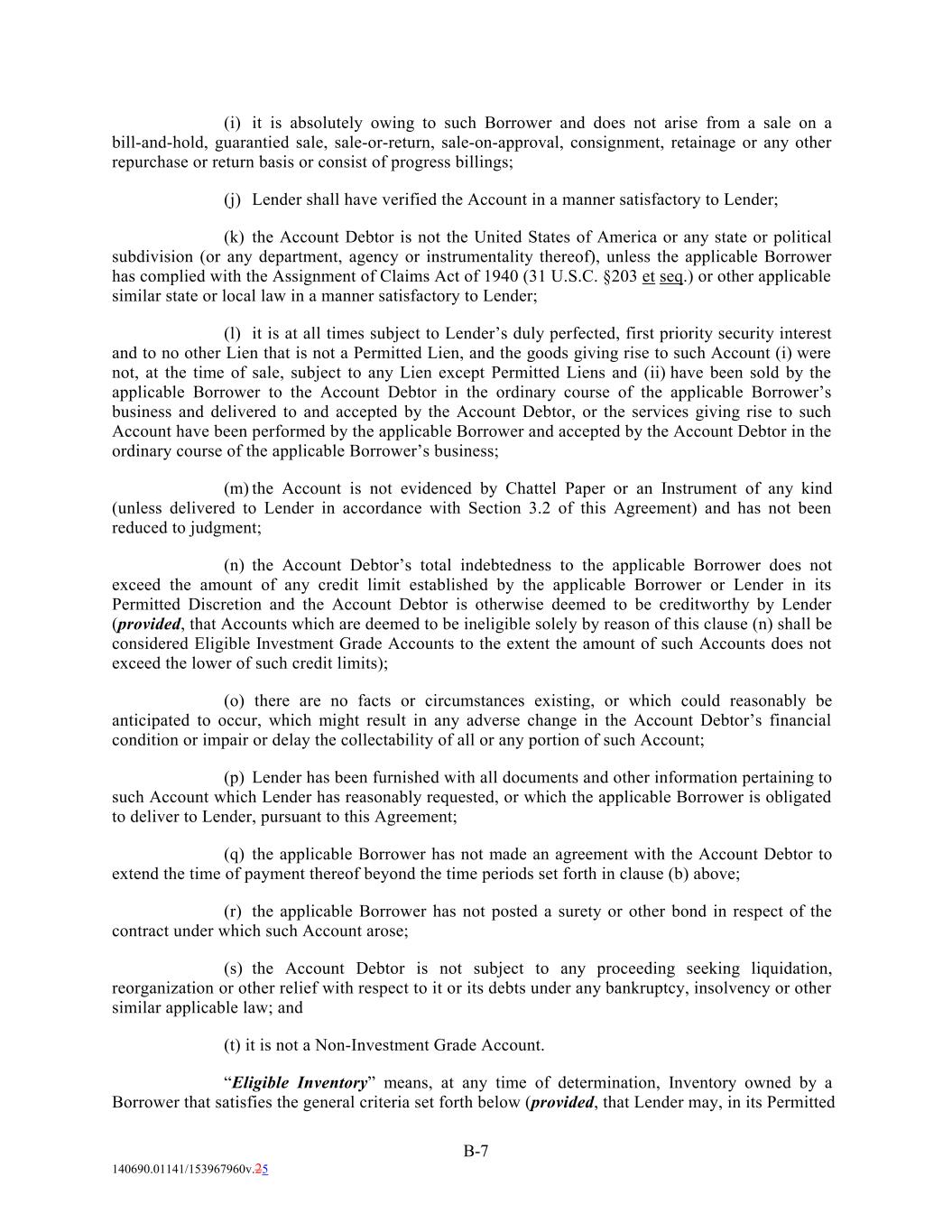(i) it is absolutely owing to such Borrower and does not arise from a sale on a bill-and-hold, guarantied sale, sale-or-return, sale-on-approval, consignment, retainage or any other repurchase or return basis or consist of progress billings; (j) Lender shall have verified the Account in a manner satisfactory to Lender; (k) the Account Debtor is not the United States of America or any state or political subdivision (or any department, agency or instrumentality thereof), unless the applicable Borrower has complied with the Assignment of Claims Act of 1940 (31 U.S.C. §203 et seq.) or other applicable similar state or local law in a manner satisfactory to Lender; (l) it is at all times subject to Lender’s duly perfected, first priority security interest and to no other Lien that is not a Permitted Lien, and the goods giving rise to such Account (i) were not, at the time of sale, subject to any Lien except Permitted Liens and (ii) have been sold by the applicable Borrower to the Account Debtor in the ordinary course of the applicable Borrower’s business and delivered to and accepted by the Account Debtor, or the services giving rise to such Account have been performed by the applicable Borrower and accepted by the Account Debtor in the ordinary course of the applicable Borrower’s business; (m) the Account is not evidenced by Chattel Paper or an Instrument of any kind (unless delivered to Lender in accordance with Section 3.2 of this Agreement) and has not been reduced to judgment; (n) the Account Debtor’s total indebtedness to the applicable Borrower does not exceed the amount of any credit limit established by the applicable Borrower or Lender in its Permitted Discretion and the Account Debtor is otherwise deemed to be creditworthy by Lender (provided, that Accounts which are deemed to be ineligible solely by reason of this clause (n) shall be considered Eligible Investment Grade Accounts to the extent the amount of such Accounts does not exceed the lower of such credit limits); (o) there are no facts or circumstances existing, or which could reasonably be anticipated to occur, which might result in any adverse change in the Account Debtor’s financial condition or impair or delay the collectability of all or any portion of such Account; (p) Lender has been furnished with all documents and other information pertaining to such Account which Lender has reasonably requested, or which the applicable Borrower is obligated to deliver to Lender, pursuant to this Agreement; (q) the applicable Borrower has not made an agreement with the Account Debtor to extend the time of payment thereof beyond the time periods set forth in clause (b) above; (r) the applicable Borrower has not posted a surety or other bond in respect of the contract under which such Account arose; (s) the Account Debtor is not subject to any proceeding seeking liquidation, reorganization or other relief with respect to it or its debts under any bankruptcy, insolvency or other similar applicable law; and (t) it is not a Non-Investment Grade Account. “Eligible Inventory” means, at any time of determination, Inventory owned by a Borrower that satisfies the general criteria set forth below (provided, that Lender may, in its Permitted B-7 140690.01141/153967960v.25