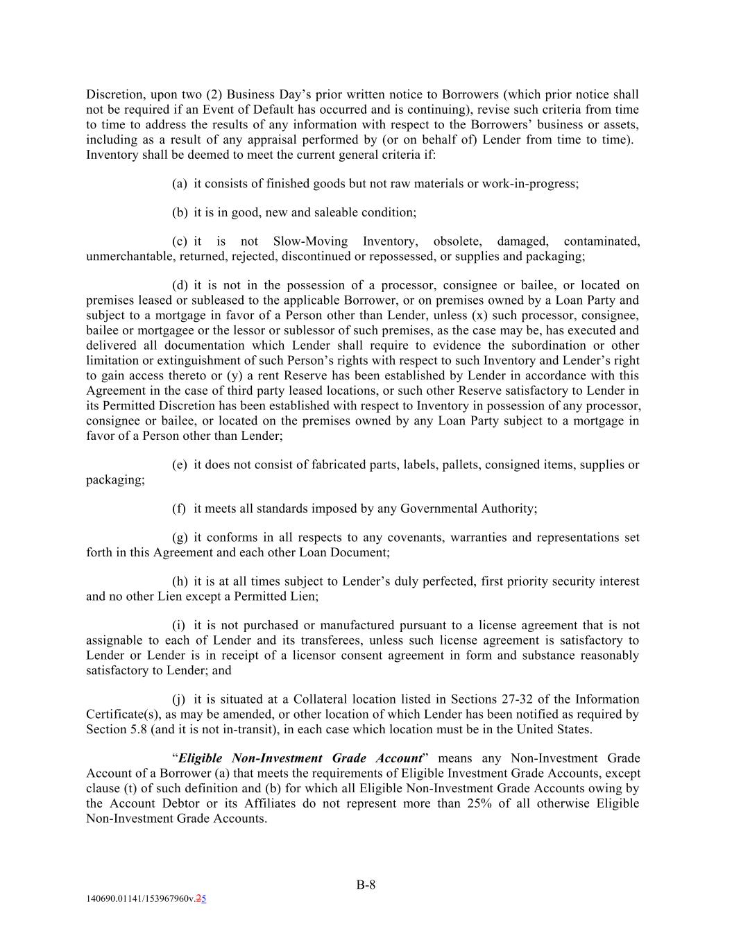 Discretion, upon two (2) Business Day’s prior written notice to Borrowers (which prior notice shall not be required if an Event of Default has occurred and is continuing), revise such criteria from time to time to address the results of any information with respect to the Borrowers’ business or assets, including as a result of any appraisal performed by (or on behalf of) Lender from time to time). Inventory shall be deemed to meet the current general criteria if: (a) it consists of finished goods but not raw materials or work-in-progress; (b) it is in good, new and saleable condition; (c) it is not Slow-Moving Inventory, obsolete, damaged, contaminated, unmerchantable, returned, rejected, discontinued or repossessed, or supplies and packaging; (d) it is not in the possession of a processor, consignee or bailee, or located on premises leased or subleased to the applicable Borrower, or on premises owned by a Loan Party and subject to a mortgage in favor of a Person other than Lender, unless (x) such processor, consignee, bailee or mortgagee or the lessor or sublessor of such premises, as the case may be, has executed and delivered all documentation which Lender shall require to evidence the subordination or other limitation or extinguishment of such Person’s rights with respect to such Inventory and Lender’s right to gain access thereto or (y) a rent Reserve has been established by Lender in accordance with this Agreement in the case of third party leased locations, or such other Reserve satisfactory to Lender in its Permitted Discretion has been established with respect to Inventory in possession of any processor, consignee or bailee, or located on the premises owned by any Loan Party subject to a mortgage in favor of a Person other than Lender; (e) it does not consist of fabricated parts, labels, pallets, consigned items, supplies or packaging; (f) it meets all standards imposed by any Governmental Authority; (g) it conforms in all respects to any covenants, warranties and representations set forth in this Agreement and each other Loan Document; (h) it is at all times subject to Lender’s duly perfected, first priority security interest and no other Lien except a Permitted Lien; (i) it is not purchased or manufactured pursuant to a license agreement that is not assignable to each of Lender and its transferees, unless such license agreement is satisfactory to Lender or Lender is in receipt of a licensor consent agreement in form and substance reasonably satisfactory to Lender; and (j) it is situated at a Collateral location listed in Sections 27-32 of the Information Certificate(s), as may be amended, or other location of which Lender has been notified as required by Section 5.8 (and it is not in-transit), in each case which location must be in the United States. “Eligible Non-Investment Grade Account” means any Non-Investment Grade Account of a Borrower (a) that meets the requirements of Eligible Investment Grade Accounts, except clause (t) of such definition and (b) for which all Eligible Non-Investment Grade Accounts owing by the Account Debtor or its Affiliates do not represent more than 25% of all otherwise Eligible Non-Investment Grade Accounts. B-8 140690.01141/153967960v.25