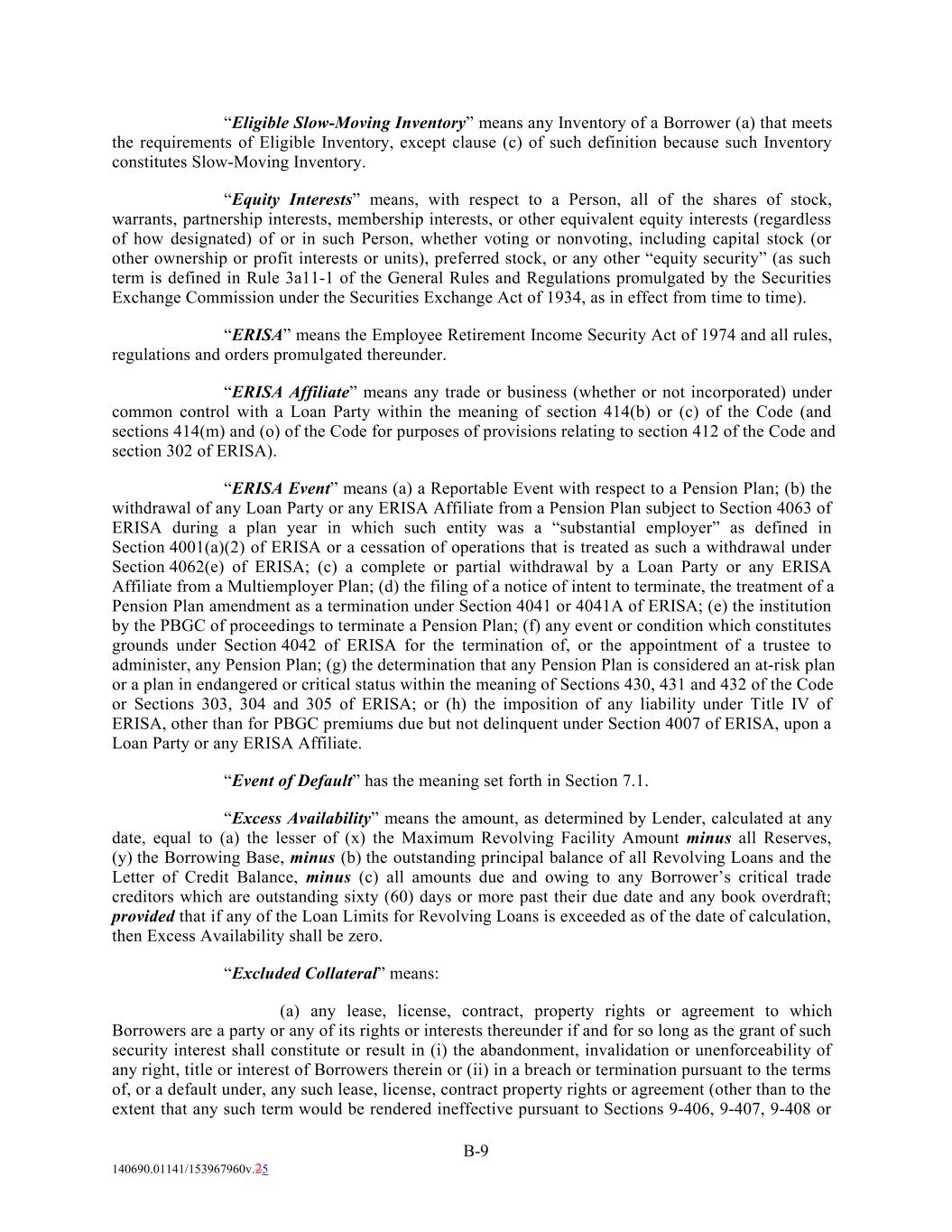 “Eligible Slow-Moving Inventory” means any Inventory of a Borrower (a) that meets the requirements of Eligible Inventory, except clause (c) of such definition because such Inventory constitutes Slow-Moving Inventory. “Equity Interests” means, with respect to a Person, all of the shares of stock, warrants, partnership interests, membership interests, or other equivalent equity interests (regardless of how designated) of or in such Person, whether voting or nonvoting, including capital stock (or other ownership or profit interests or units), preferred stock, or any other “equity security” (as such term is defined in Rule 3a11-1 of the General Rules and Regulations promulgated by the Securities Exchange Commission under the Securities Exchange Act of 1934, as in effect from time to time). “ERISA” means the Employee Retirement Income Security Act of 1974 and all rules, regulations and orders promulgated thereunder. “ERISA Affiliate” means any trade or business (whether or not incorporated) under common control with a Loan Party within the meaning of section 414(b) or (c) of the Code (and sections 414(m) and (o) of the Code for purposes of provisions relating to section 412 of the Code and section 302 of ERISA). “ERISA Event” means (a) a Reportable Event with respect to a Pension Plan; (b) the withdrawal of any Loan Party or any ERISA Affiliate from a Pension Plan subject to Section 4063 of ERISA during a plan year in which such entity was a “substantial employer” as defined in Section 4001(a)(2) of ERISA or a cessation of operations that is treated as such a withdrawal under Section 4062(e) of ERISA; (c) a complete or partial withdrawal by a Loan Party or any ERISA Affiliate from a Multiemployer Plan; (d) the filing of a notice of intent to terminate, the treatment of a Pension Plan amendment as a termination under Section 4041 or 4041A of ERISA; (e) the institution by the PBGC of proceedings to terminate a Pension Plan; (f) any event or condition which constitutes grounds under Section 4042 of ERISA for the termination of, or the appointment of a trustee to administer, any Pension Plan; (g) the determination that any Pension Plan is considered an at-risk plan or a plan in endangered or critical status within the meaning of Sections 430, 431 and 432 of the Code or Sections 303, 304 and 305 of ERISA; or (h) the imposition of any liability under Title IV of ERISA, other than for PBGC premiums due but not delinquent under Section 4007 of ERISA, upon a Loan Party or any ERISA Affiliate. “Event of Default” has the meaning set forth in Section 7.1. “Excess Availability” means the amount, as determined by Lender, calculated at any date, equal to (a) the lesser of (x) the Maximum Revolving Facility Amount minus all Reserves, (y) the Borrowing Base, minus (b) the outstanding principal balance of all Revolving Loans and the Letter of Credit Balance, minus (c) all amounts due and owing to any Borrower’s critical trade creditors which are outstanding sixty (60) days or more past their due date and any book overdraft; provided that if any of the Loan Limits for Revolving Loans is exceeded as of the date of calculation, then Excess Availability shall be zero. “Excluded Collateral” means: (a) any lease, license, contract, property rights or agreement to which Borrowers are a party or any of its rights or interests thereunder if and for so long as the grant of such security interest shall constitute or result in (i) the abandonment, invalidation or unenforceability of any right, title or interest of Borrowers therein or (ii) in a breach or termination pursuant to the terms of, or a default under, any such lease, license, contract property rights or agreement (other than to the extent that any such term would be rendered ineffective pursuant to Sections 9-406, 9-407, 9-408 or B-9 140690.01141/153967960v.25