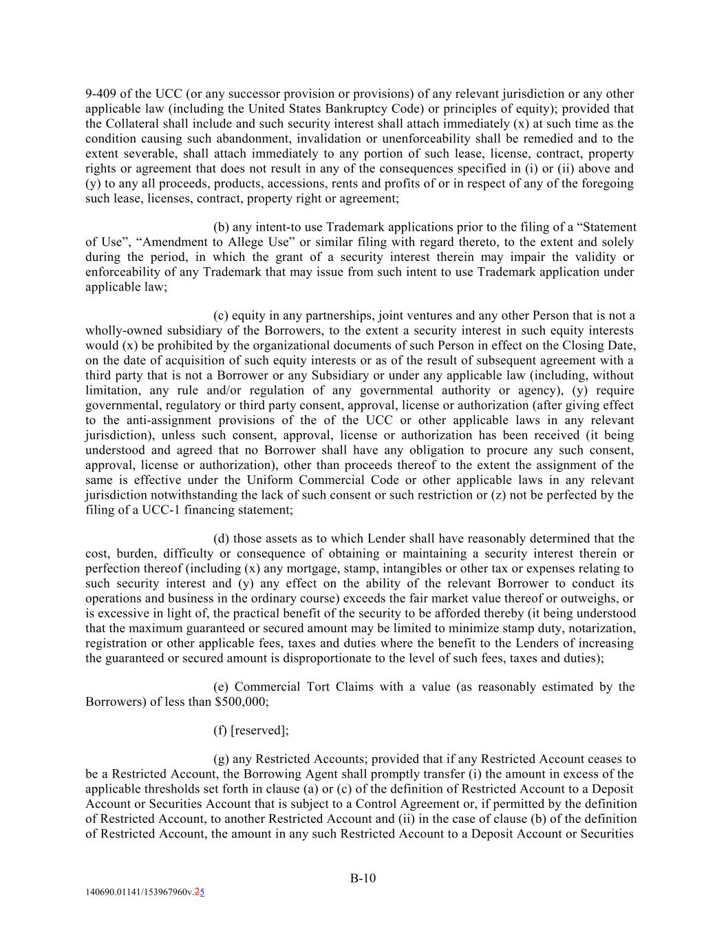 9-409 of the UCC (or any successor provision or provisions) of any relevant jurisdiction or any other applicable law (including the United States Bankruptcy Code) or principles of equity); provided that the Collateral shall include and such security interest shall attach immediately (x) at such time as the condition causing such abandonment, invalidation or unenforceability shall be remedied and to the extent severable, shall attach immediately to any portion of such lease, license, contract, property rights or agreement that does not result in any of the consequences specified in (i) or (ii) above and (y) to any all proceeds, products, accessions, rents and profits of or in respect of any of the foregoing such lease, licenses, contract, property right or agreement; (b) any intent-to use Trademark applications prior to the filing of a “Statement of Use”, “Amendment to Allege Use” or similar filing with regard thereto, to the extent and solely during the period, in which the grant of a security interest therein may impair the validity or enforceability of any Trademark that may issue from such intent to use Trademark application under applicable law; (c) equity in any partnerships, joint ventures and any other Person that is not a wholly-owned subsidiary of the Borrowers, to the extent a security interest in such equity interests would (x) be prohibited by the organizational documents of such Person in effect on the Closing Date, on the date of acquisition of such equity interests or as of the result of subsequent agreement with a third party that is not a Borrower or any Subsidiary or under any applicable law (including, without limitation, any rule and/or regulation of any governmental authority or agency), (y) require governmental, regulatory or third party consent, approval, license or authorization (after giving effect to the anti-assignment provisions of the of the UCC or other applicable laws in any relevant jurisdiction), unless such consent, approval, license or authorization has been received (it being understood and agreed that no Borrower shall have any obligation to procure any such consent, approval, license or authorization), other than proceeds thereof to the extent the assignment of the same is effective under the Uniform Commercial Code or other applicable laws in any relevant jurisdiction notwithstanding the lack of such consent or such restriction or (z) not be perfected by the filing of a UCC-1 financing statement; (d) those assets as to which Lender shall have reasonably determined that the cost, burden, difficulty or consequence of obtaining or maintaining a security interest therein or perfection thereof (including (x) any mortgage, stamp, intangibles or other tax or expenses relating to such security interest and (y) any effect on the ability of the relevant Borrower to conduct its operations and business in the ordinary course) exceeds the fair market value thereof or outweighs, or is excessive in light of, the practical benefit of the security to be afforded thereby (it being understood that the maximum guaranteed or secured amount may be limited to minimize stamp duty, notarization, registration or other applicable fees, taxes and duties where the benefit to the Lenders of increasing the guaranteed or secured amount is disproportionate to the level of such fees, taxes and duties); (e) Commercial Tort Claims with a value (as reasonably estimated by the Borrowers) of less than $500,000; (f) [reserved]; (g) any Restricted Accounts; provided that if any Restricted Account ceases to be a Restricted Account, the Borrowing Agent shall promptly transfer (i) the amount in excess of the applicable thresholds set forth in clause (a) or (c) of the definition of Restricted Account to a Deposit Account or Securities Account that is subject to a Control Agreement or, if permitted by the definition of Restricted Account, to another Restricted Account and (ii) in the case of clause (b) of the definition of Restricted Account, the amount in any such Restricted Account to a Deposit Account or Securities B-10 140690.01141/153967960v.25