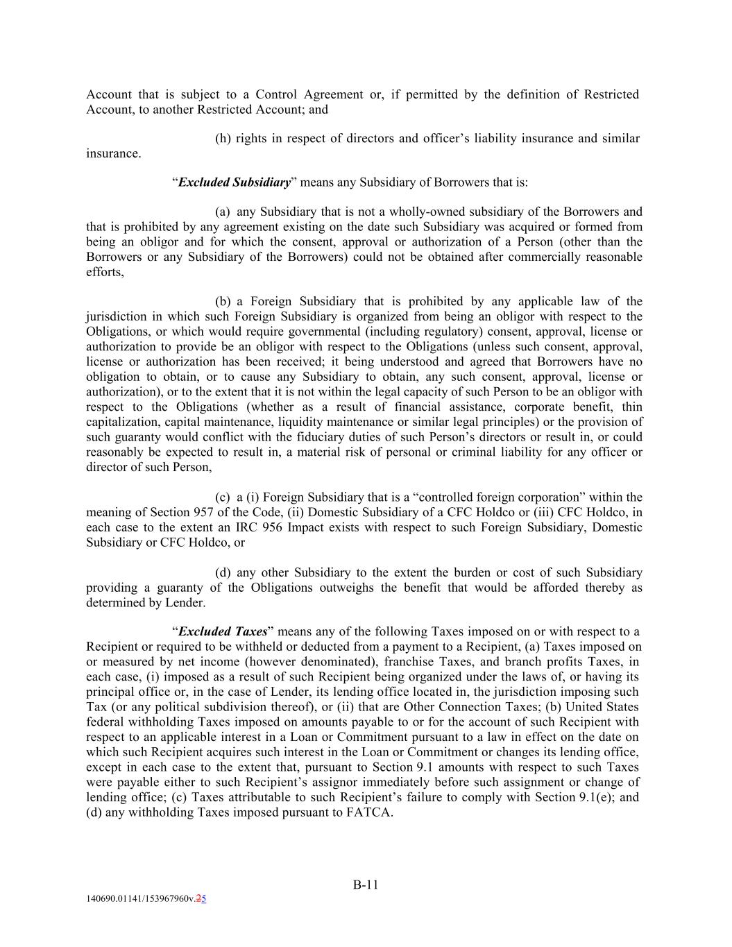 Account that is subject to a Control Agreement or, if permitted by the definition of Restricted Account, to another Restricted Account; and (h) rights in respect of directors and officer’s liability insurance and similar insurance. “Excluded Subsidiary” means any Subsidiary of Borrowers that is: (a) any Subsidiary that is not a wholly-owned subsidiary of the Borrowers and that is prohibited by any agreement existing on the date such Subsidiary was acquired or formed from being an obligor and for which the consent, approval or authorization of a Person (other than the Borrowers or any Subsidiary of the Borrowers) could not be obtained after commercially reasonable efforts, (b) a Foreign Subsidiary that is prohibited by any applicable law of the jurisdiction in which such Foreign Subsidiary is organized from being an obligor with respect to the Obligations, or which would require governmental (including regulatory) consent, approval, license or authorization to provide be an obligor with respect to the Obligations (unless such consent, approval, license or authorization has been received; it being understood and agreed that Borrowers have no obligation to obtain, or to cause any Subsidiary to obtain, any such consent, approval, license or authorization), or to the extent that it is not within the legal capacity of such Person to be an obligor with respect to the Obligations (whether as a result of financial assistance, corporate benefit, thin capitalization, capital maintenance, liquidity maintenance or similar legal principles) or the provision of such guaranty would conflict with the fiduciary duties of such Person’s directors or result in, or could reasonably be expected to result in, a material risk of personal or criminal liability for any officer or director of such Person, (c) a (i) Foreign Subsidiary that is a “controlled foreign corporation” within the meaning of Section 957 of the Code, (ii) Domestic Subsidiary of a CFC Holdco or (iii) CFC Holdco, in each case to the extent an IRC 956 Impact exists with respect to such Foreign Subsidiary, Domestic Subsidiary or CFC Holdco, or (d) any other Subsidiary to the extent the burden or cost of such Subsidiary providing a guaranty of the Obligations outweighs the benefit that would be afforded thereby as determined by Lender. “Excluded Taxes” means any of the following Taxes imposed on or with respect to a Recipient or required to be withheld or deducted from a payment to a Recipient, (a) Taxes imposed on or measured by net income (however denominated), franchise Taxes, and branch profits Taxes, in each case, (i) imposed as a result of such Recipient being organized under the laws of, or having its principal office or, in the case of Lender, its lending office located in, the jurisdiction imposing such Tax (or any political subdivision thereof), or (ii) that are Other Connection Taxes; (b) United States federal withholding Taxes imposed on amounts payable to or for the account of such Recipient with respect to an applicable interest in a Loan or Commitment pursuant to a law in effect on the date on which such Recipient acquires such interest in the Loan or Commitment or changes its lending office, except in each case to the extent that, pursuant to Section 9.1 amounts with respect to such Taxes were payable either to such Recipient’s assignor immediately before such assignment or change of lending office; (c) Taxes attributable to such Recipient’s failure to comply with Section 9.1(e); and (d) any withholding Taxes imposed pursuant to FATCA. B-11 140690.01141/153967960v.25