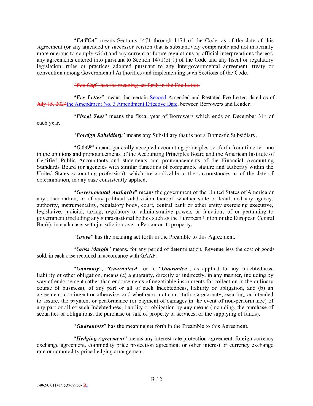 “FATCA” means Sections 1471 through 1474 of the Code, as of the date of this Agreement (or any amended or successor version that is substantively comparable and not materially more onerous to comply with) and any current or future regulations or official interpretations thereof, any agreements entered into pursuant to Section 1471(b)(1) of the Code and any fiscal or regulatory legislation, rules or practices adopted pursuant to any intergovernmental agreement, treaty or convention among Governmental Authorities and implementing such Sections of the Code. “Fee Cap” has the meaning set forth in the Fee Letter. “Fee Letter” means that certain Second Amended and Restated Fee Letter, dated as of July 15, 2024the Amendment No. 3 Amendment Effective Date, between Borrowers and Lender. “Fiscal Year” means the fiscal year of Borrowers which ends on December 31st of each year. “Foreign Subsidiary” means any Subsidiary that is not a Domestic Subsidiary. “GAAP” means generally accepted accounting principles set forth from time to time in the opinions and pronouncements of the Accounting Principles Board and the American Institute of Certified Public Accountants and statements and pronouncements of the Financial Accounting Standards Board (or agencies with similar functions of comparable stature and authority within the United States accounting profession), which are applicable to the circumstances as of the date of determination, in any case consistently applied. “Governmental Authority” means the government of the United States of America or any other nation, or of any political subdivision thereof, whether state or local, and any agency, authority, instrumentality, regulatory body, court, central bank or other entity exercising executive, legislative, judicial, taxing, regulatory or administrative powers or functions of or pertaining to government (including any supra-national bodies such as the European Union or the European Central Bank), in each case, with jurisdiction over a Person or its property. “Grove” has the meaning set forth in the Preamble to this Agreement. “Gross Margin” means, for any period of determination, Revenue less the cost of goods sold, in each case recorded in accordance with GAAP. “Guaranty”, “Guaranteed” or to “Guarantee”, as applied to any Indebtedness, liability or other obligation, means (a) a guaranty, directly or indirectly, in any manner, including by way of endorsement (other than endorsements of negotiable instruments for collection in the ordinary course of business), of any part or all of such Indebtedness, liability or obligation, and (b) an agreement, contingent or otherwise, and whether or not constituting a guaranty, assuring, or intended to assure, the payment or performance (or payment of damages in the event of non-performance) of any part or all of such Indebtedness, liability or obligation by any means (including, the purchase of securities or obligations, the purchase or sale of property or services, or the supplying of funds). “Guarantors” has the meaning set forth in the Preamble to this Agreement. “Hedging Agreement” means any interest rate protection agreement, foreign currency exchange agreement, commodity price protection agreement or other interest or currency exchange rate or commodity price hedging arrangement. B-12 140690.01141/153967960v.25