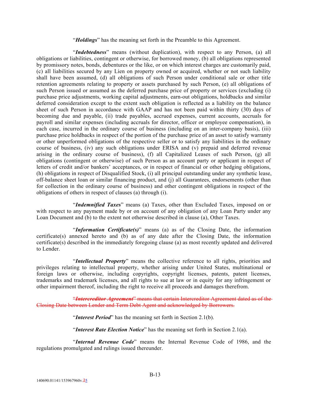 “Holdings” has the meaning set forth in the Preamble to this Agreement. “Indebtedness” means (without duplication), with respect to any Person, (a) all obligations or liabilities, contingent or otherwise, for borrowed money, (b) all obligations represented by promissory notes, bonds, debentures or the like, or on which interest charges are customarily paid, (c) all liabilities secured by any Lien on property owned or acquired, whether or not such liability shall have been assumed, (d) all obligations of such Person under conditional sale or other title retention agreements relating to property or assets purchased by such Person, (e) all obligations of such Person issued or assumed as the deferred purchase price of property or services (excluding (i) purchase price adjustments, working capital adjustments, earn-out obligations, holdbacks and similar deferred consideration except to the extent such obligation is reflected as a liability on the balance sheet of such Person in accordance with GAAP and has not been paid within thirty (30) days of becoming due and payable, (ii) trade payables, accrued expenses, current accounts, accruals for payroll and similar expenses (including accruals for director, officer or employee compensation), in each case, incurred in the ordinary course of business (including on an inter-company basis), (iii) purchase price holdbacks in respect of the portion of the purchase price of an asset to satisfy warranty or other unperformed obligations of the respective seller or to satisfy any liabilities in the ordinary course of business, (iv) any such obligations under ERISA and (v) prepaid and deferred revenue arising in the ordinary course of business), (f) all Capitalized Leases of such Person, (g) all obligations (contingent or otherwise) of such Person as an account party or applicant in respect of letters of credit and/or bankers’ acceptances, or in respect of financial or other hedging obligations, (h) obligations in respect of Disqualified Stock, (i) all principal outstanding under any synthetic lease, off-balance sheet loan or similar financing product, and (j) all Guarantees, endorsements (other than for collection in the ordinary course of business) and other contingent obligations in respect of the obligations of others in respect of clauses (a) through (i). “Indemnified Taxes” means (a) Taxes, other than Excluded Taxes, imposed on or with respect to any payment made by or on account of any obligation of any Loan Party under any Loan Document and (b) to the extent not otherwise described in clause (a), Other Taxes. “Information Certificate(s)” means (a) as of the Closing Date, the information certificate(s) annexed hereto and (b) as of any date after the Closing Date, the information certificate(s) described in the immediately foregoing clause (a) as most recently updated and delivered to Lender. “Intellectual Property” means the collective reference to all rights, priorities and privileges relating to intellectual property, whether arising under United States, multinational or foreign laws or otherwise, including copyrights, copyright licenses, patents, patent licenses, trademarks and trademark licenses, and all rights to sue at law or in equity for any infringement or other impairment thereof, including the right to receive all proceeds and damages therefrom. “Intercreditor Agreement” means that certain Intercreditor Agreement dated as of the Closing Date between Lender and Term Debt Agent and acknowledged by Borrowers. “Interest Period” has the meaning set forth in Section 2.1(b). “Interest Rate Election Notice” has the meaning set forth in Section 2.1(a). “Internal Revenue Code” means the Internal Revenue Code of 1986, and the regulations promulgated and rulings issued thereunder. B-13 140690.01141/153967960v.25