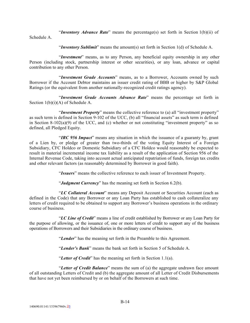 “Inventory Advance Rate” means the percentage(s) set forth in Section 1(b)(ii) of Schedule A. “Inventory Sublimit” means the amount(s) set forth in Section 1(d) of Schedule A. “Investment” means, as to any Person, any beneficial equity ownership in any other Person (including stock, partnership interest or other securities), or any loan, advance or capital contribution to any other Person. “Investment Grade Accounts” means, as to a Borrower, Accounts owned by such Borrower if the Account Debtor maintains an issuer credit rating of BBB or higher by S&P Global Ratings (or the equivalent from another nationally-recognized credit ratings agency). “Investment Grade Accounts Advance Rate” means the percentage set forth in Section 1(b)(i)(A) of Schedule A. “Investment Property” means the collective reference to (a) all “investment property” as such term is defined in Section 9-102 of the UCC, (b) all “financial assets” as such term is defined in Section 8-102(a)(9) of the UCC, and (c) whether or not constituting “investment property” as so defined, all Pledged Equity. “IRC 956 Impact” means any situation in which the issuance of a guaranty by, grant of a Lien by, or pledge of greater than two-thirds of the voting Equity Interest of a Foreign Subsidiary, CFC Holdco or Domestic Subsidiary of a CFC Holdco would reasonably be expected to result in material incremental income tax liability as a result of the application of Section 956 of the Internal Revenue Code, taking into account actual anticipated repatriation of funds, foreign tax credits and other relevant factors (as reasonably determined by Borrower in good faith). “Issuers” means the collective reference to each issuer of Investment Property. “Judgment Currency” has the meaning set forth in Section 6.2(b). “LC Collateral Account” means any Deposit Account or Securities Account (each as defined in the Code) that any Borrower or any Loan Party has established to cash collateralize any letters of credit required to be obtained to support any Borrower’s business operations in the ordinary course of business. “LC Line of Credit” means a line of credit established by Borrower or any Loan Party for the purpose of allowing, or the issuance of, one or more letters of credit to support any of the business operations of Borrowers and their Subsidiaries in the ordinary course of business. “Lender” has the meaning set forth in the Preamble to this Agreement. “Lender’s Bank” means the bank set forth in Section 5 of Schedule A. “Letter of Credit” has the meaning set forth in Section 1.1(a). “Letter of Credit Balance” means the sum of (a) the aggregate undrawn face amount of all outstanding Letters of Credit and (b) the aggregate amount of all Letter of Credit Disbursements that have not yet been reimbursed by or on behalf of the Borrowers at such time. B-14 140690.01141/153967960v.25