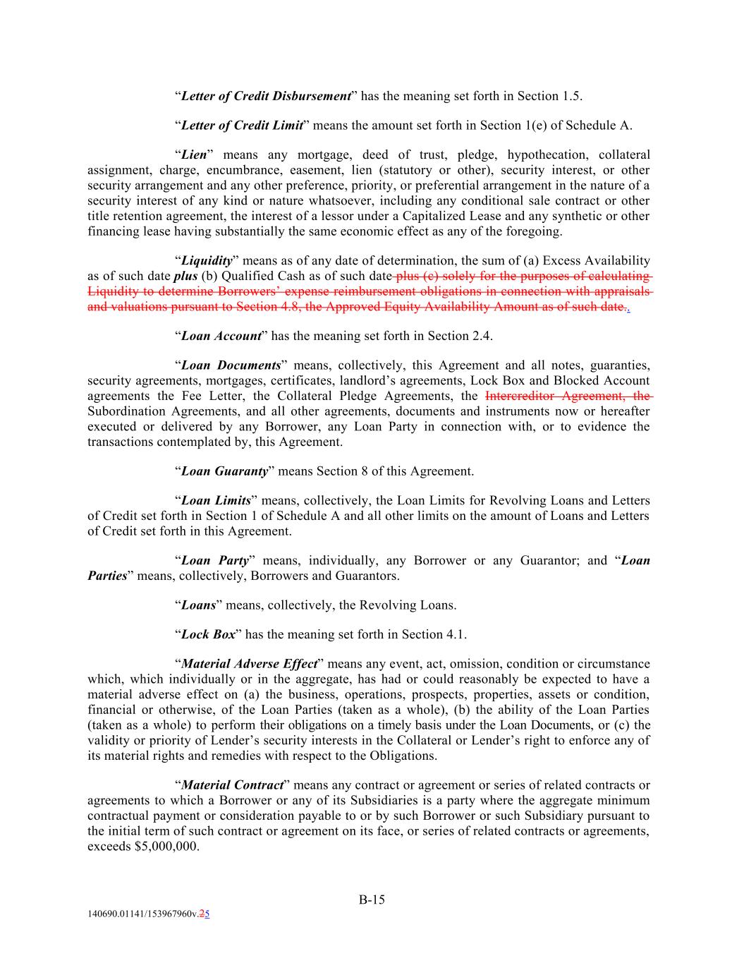 “Letter of Credit Disbursement” has the meaning set forth in Section 1.5. “Letter of Credit Limit” means the amount set forth in Section 1(e) of Schedule A. “Lien” means any mortgage, deed of trust, pledge, hypothecation, collateral assignment, charge, encumbrance, easement, lien (statutory or other), security interest, or other security arrangement and any other preference, priority, or preferential arrangement in the nature of a security interest of any kind or nature whatsoever, including any conditional sale contract or other title retention agreement, the interest of a lessor under a Capitalized Lease and any synthetic or other financing lease having substantially the same economic effect as any of the foregoing. “Liquidity” means as of any date of determination, the sum of (a) Excess Availability as of such date plus (b) Qualified Cash as of such date plus (c) solely for the purposes of calculating Liquidity to determine Borrowers’ expense reimbursement obligations in connection with appraisals and valuations pursuant to Section 4.8, the Approved Equity Availability Amount as of such date.. “Loan Account” has the meaning set forth in Section 2.4. “Loan Documents” means, collectively, this Agreement and all notes, guaranties, security agreements, mortgages, certificates, landlord’s agreements, Lock Box and Blocked Account agreements the Fee Letter, the Collateral Pledge Agreements, the Intercreditor Agreement, the Subordination Agreements, and all other agreements, documents and instruments now or hereafter executed or delivered by any Borrower, any Loan Party in connection with, or to evidence the transactions contemplated by, this Agreement. “Loan Guaranty” means Section 8 of this Agreement. “Loan Limits” means, collectively, the Loan Limits for Revolving Loans and Letters of Credit set forth in Section 1 of Schedule A and all other limits on the amount of Loans and Letters of Credit set forth in this Agreement. “Loan Party” means, individually, any Borrower or any Guarantor; and “Loan Parties” means, collectively, Borrowers and Guarantors. “Loans” means, collectively, the Revolving Loans. “Lock Box” has the meaning set forth in Section 4.1. “Material Adverse Effect” means any event, act, omission, condition or circumstance which, which individually or in the aggregate, has had or could reasonably be expected to have a material adverse effect on (a) the business, operations, prospects, properties, assets or condition, financial or otherwise, of the Loan Parties (taken as a whole), (b) the ability of the Loan Parties (taken as a whole) to perform their obligations on a timely basis under the Loan Documents, or (c) the validity or priority of Lender’s security interests in the Collateral or Lender’s right to enforce any of its material rights and remedies with respect to the Obligations. “Material Contract” means any contract or agreement or series of related contracts or agreements to which a Borrower or any of its Subsidiaries is a party where the aggregate minimum contractual payment or consideration payable to or by such Borrower or such Subsidiary pursuant to the initial term of such contract or agreement on its face, or series of related contracts or agreements, exceeds $5,000,000. B-15 140690.01141/153967960v.25