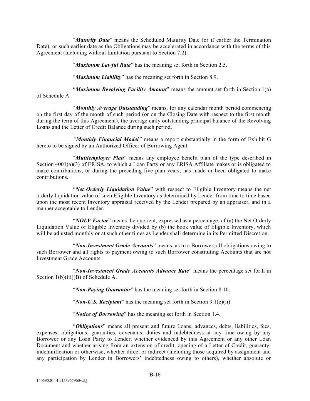 “Maturity Date” means the Scheduled Maturity Date (or if earlier the Termination Date), or such earlier date as the Obligations may be accelerated in accordance with the terms of this Agreement (including without limitation pursuant to Section 7.2). “Maximum Lawful Rate” has the meaning set forth in Section 2.5. “Maximum Liability” has the meaning set forth in Section 8.9. “Maximum Revolving Facility Amount” means the amount set forth in Section 1(a) of Schedule A. “Monthly Average Outstanding” means, for any calendar month period commencing on the first day of the month of such period (or on the Closing Date with respect to the first month during the term of this Agreement), the average daily outstanding principal balance of the Revolving Loans and the Letter of Credit Balance during such period. “Monthly Financial Model” means a report substantially in the form of Exhibit G hereto to be signed by an Authorized Officer of Borrowing Agent. “Multiemployer Plan” means any employee benefit plan of the type described in Section 4001(a)(3) of ERISA, to which a Loan Party or any ERISA Affiliate makes or is obligated to make contributions, or during the preceding five plan years, has made or been obligated to make contributions. “Net Orderly Liquidation Value” with respect to Eligible Inventory means the net orderly liquidation value of such Eligible Inventory as determined by Lender from time to time based upon the most recent Inventory appraisal received by the Lender prepared by an appraiser, and in a manner acceptable to Lender. “NOLV Factor” means the quotient, expressed as a percentage, of (a) the Net Orderly Liquidation Value of Eligible Inventory divided by (b) the book value of Eligible Inventory, which will be adjusted monthly or at such other times as Lender shall determine in its Permitted Discretion. “Non-Investment Grade Accounts” means, as to a Borrower, all obligations owing to such Borrower and all rights to payment owing to such Borrower constituting Accounts that are not Investment Grade Accounts. “Non-Investment Grade Accounts Advance Rate” means the percentage set forth in Section 1(b)(iii)(B) of Schedule A. “Non-Paying Guarantor” has the meaning set forth in Section 8.10. “Non-U.S. Recipient” has the meaning set forth in Section 9.1(e)(ii). “Notice of Borrowing” has the meaning set forth in Section 1.4. “Obligations” means all present and future Loans, advances, debts, liabilities, fees, expenses, obligations, guaranties, covenants, duties and indebtedness at any time owing by any Borrower or any Loan Party to Lender, whether evidenced by this Agreement or any other Loan Document and whether arising from an extension of credit, opening of a Letter of Credit, guaranty, indemnification or otherwise, whether direct or indirect (including those acquired by assignment and any participation by Lender in Borrowers’ indebtedness owing to others), whether absolute or B-16 140690.01141/153967960v.25