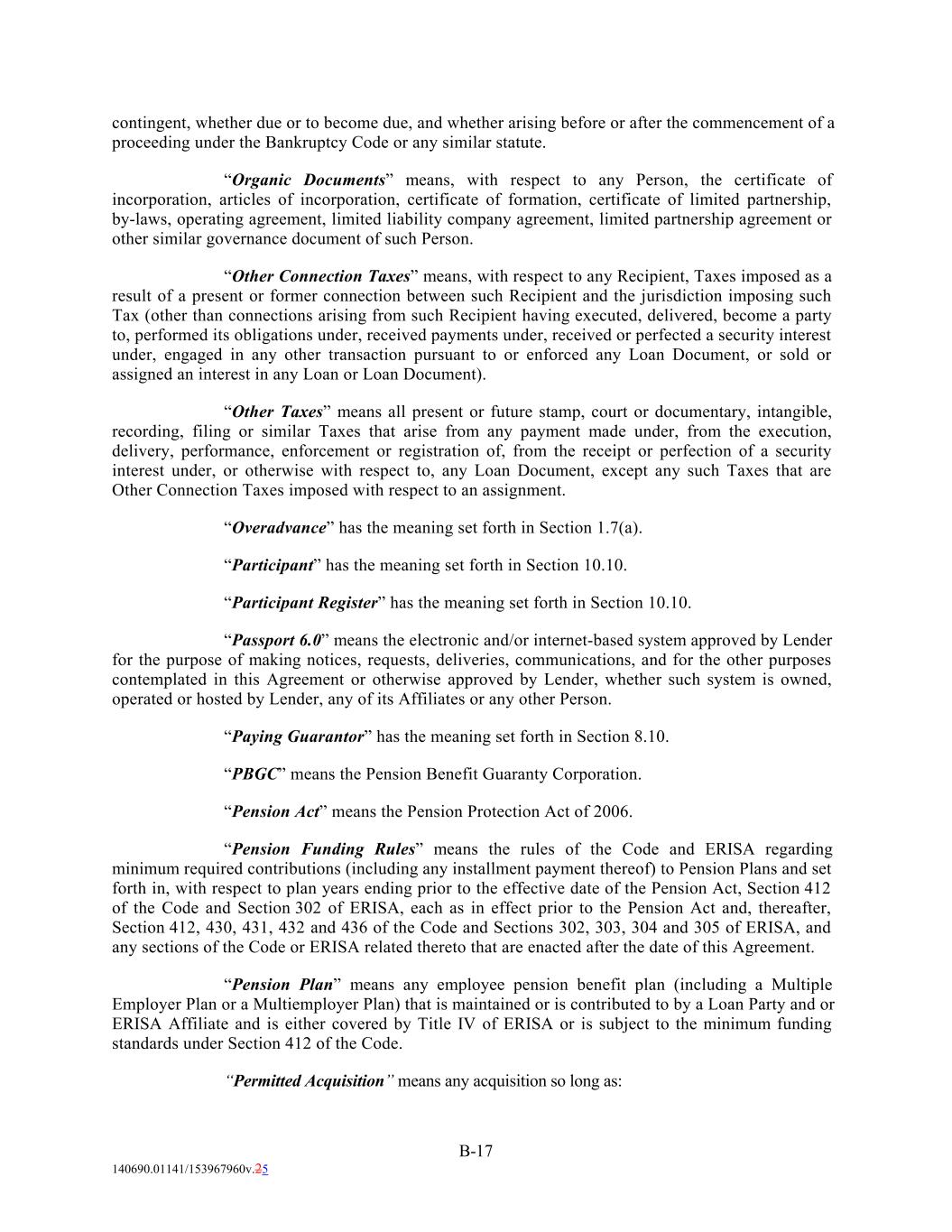 contingent, whether due or to become due, and whether arising before or after the commencement of a proceeding under the Bankruptcy Code or any similar statute. “Organic Documents” means, with respect to any Person, the certificate of incorporation, articles of incorporation, certificate of formation, certificate of limited partnership, by-laws, operating agreement, limited liability company agreement, limited partnership agreement or other similar governance document of such Person. “Other Connection Taxes” means, with respect to any Recipient, Taxes imposed as a result of a present or former connection between such Recipient and the jurisdiction imposing such Tax (other than connections arising from such Recipient having executed, delivered, become a party to, performed its obligations under, received payments under, received or perfected a security interest under, engaged in any other transaction pursuant to or enforced any Loan Document, or sold or assigned an interest in any Loan or Loan Document). “Other Taxes” means all present or future stamp, court or documentary, intangible, recording, filing or similar Taxes that arise from any payment made under, from the execution, delivery, performance, enforcement or registration of, from the receipt or perfection of a security interest under, or otherwise with respect to, any Loan Document, except any such Taxes that are Other Connection Taxes imposed with respect to an assignment. “Overadvance” has the meaning set forth in Section 1.7(a). “Participant” has the meaning set forth in Section 10.10. “Participant Register” has the meaning set forth in Section 10.10. “Passport 6.0” means the electronic and/or internet-based system approved by Lender for the purpose of making notices, requests, deliveries, communications, and for the other purposes contemplated in this Agreement or otherwise approved by Lender, whether such system is owned, operated or hosted by Lender, any of its Affiliates or any other Person. “Paying Guarantor” has the meaning set forth in Section 8.10. “PBGC” means the Pension Benefit Guaranty Corporation. “Pension Act” means the Pension Protection Act of 2006. “Pension Funding Rules” means the rules of the Code and ERISA regarding minimum required contributions (including any installment payment thereof) to Pension Plans and set forth in, with respect to plan years ending prior to the effective date of the Pension Act, Section 412 of the Code and Section 302 of ERISA, each as in effect prior to the Pension Act and, thereafter, Section 412, 430, 431, 432 and 436 of the Code and Sections 302, 303, 304 and 305 of ERISA, and any sections of the Code or ERISA related thereto that are enacted after the date of this Agreement. “Pension Plan” means any employee pension benefit plan (including a Multiple Employer Plan or a Multiemployer Plan) that is maintained or is contributed to by a Loan Party and or ERISA Affiliate and is either covered by Title IV of ERISA or is subject to the minimum funding standards under Section 412 of the Code. “Permitted Acquisition” means any acquisition so long as: B-17 140690.01141/153967960v.25