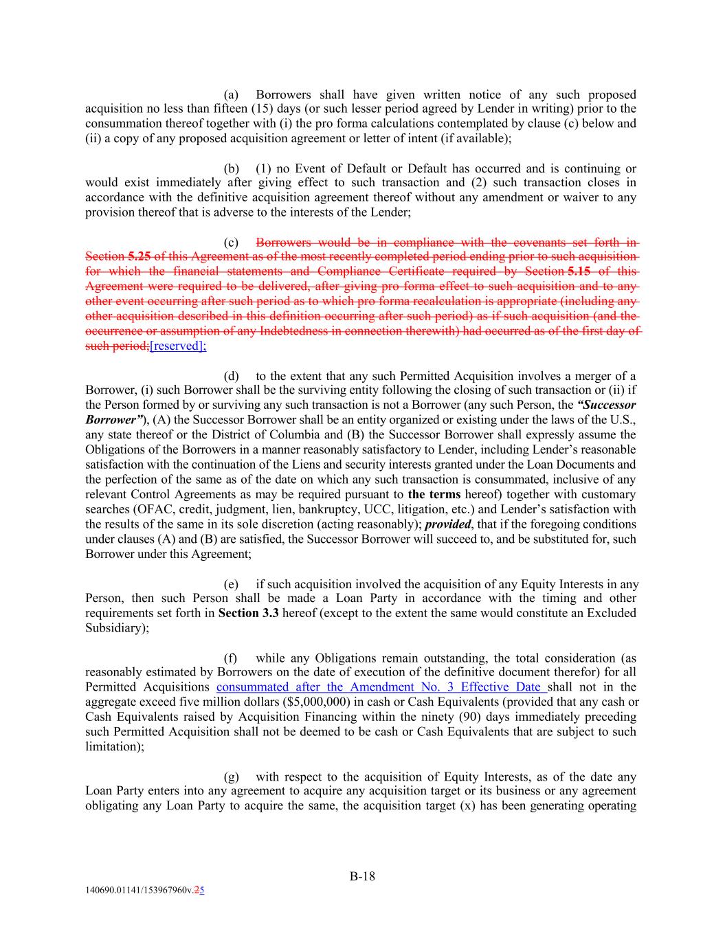 (a) Borrowers shall have given written notice of any such proposed acquisition no less than fifteen (15) days (or such lesser period agreed by Lender in writing) prior to the consummation thereof together with (i) the pro forma calculations contemplated by clause (c) below and (ii) a copy of any proposed acquisition agreement or letter of intent (if available); (b) (1) no Event of Default or Default has occurred and is continuing or would exist immediately after giving effect to such transaction and (2) such transaction closes in accordance with the definitive acquisition agreement thereof without any amendment or waiver to any provision thereof that is adverse to the interests of the Lender; (c) Borrowers would be in compliance with the covenants set forth in Section 5.25 of this Agreement as of the most recently completed period ending prior to such acquisition for which the financial statements and Compliance Certificate required by Section 5.15 of this Agreement were required to be delivered, after giving pro forma effect to such acquisition and to any other event occurring after such period as to which pro forma recalculation is appropriate (including any other acquisition described in this definition occurring after such period) as if such acquisition (and the occurrence or assumption of any Indebtedness in connection therewith) had occurred as of the first day of such period;[reserved]; (d) to the extent that any such Permitted Acquisition involves a merger of a Borrower, (i) such Borrower shall be the surviving entity following the closing of such transaction or (ii) if the Person formed by or surviving any such transaction is not a Borrower (any such Person, the “Successor Borrower”), (A) the Successor Borrower shall be an entity organized or existing under the laws of the U.S., any state thereof or the District of Columbia and (B) the Successor Borrower shall expressly assume the Obligations of the Borrowers in a manner reasonably satisfactory to Lender, including Lender’s reasonable satisfaction with the continuation of the Liens and security interests granted under the Loan Documents and the perfection of the same as of the date on which any such transaction is consummated, inclusive of any relevant Control Agreements as may be required pursuant to the terms hereof) together with customary searches (OFAC, credit, judgment, lien, bankruptcy, UCC, litigation, etc.) and Lender’s satisfaction with the results of the same in its sole discretion (acting reasonably); provided, that if the foregoing conditions under clauses (A) and (B) are satisfied, the Successor Borrower will succeed to, and be substituted for, such Borrower under this Agreement; (e) if such acquisition involved the acquisition of any Equity Interests in any Person, then such Person shall be made a Loan Party in accordance with the timing and other requirements set forth in Section 3.3 hereof (except to the extent the same would constitute an Excluded Subsidiary); (f) while any Obligations remain outstanding, the total consideration (as reasonably estimated by Borrowers on the date of execution of the definitive document therefor) for all Permitted Acquisitions consummated after the Amendment No. 3 Effective Date shall not in the aggregate exceed five million dollars ($5,000,000) in cash or Cash Equivalents (provided that any cash or Cash Equivalents raised by Acquisition Financing within the ninety (90) days immediately preceding such Permitted Acquisition shall not be deemed to be cash or Cash Equivalents that are subject to such limitation); (g) with respect to the acquisition of Equity Interests, as of the date any Loan Party enters into any agreement to acquire any acquisition target or its business or any agreement obligating any Loan Party to acquire the same, the acquisition target (x) has been generating operating B-18 140690.01141/153967960v.25