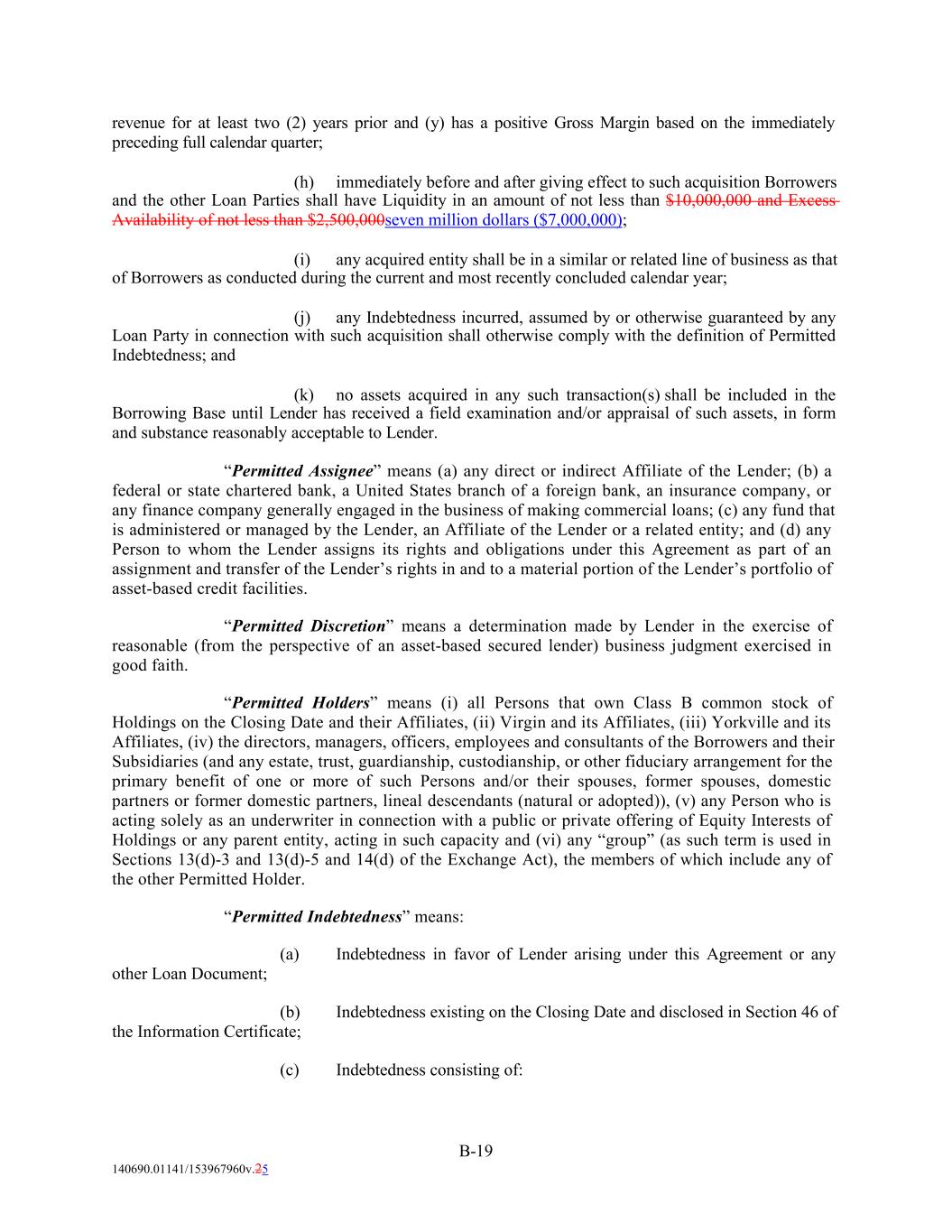 revenue for at least two (2) years prior and (y) has a positive Gross Margin based on the immediately preceding full calendar quarter; (h) immediately before and after giving effect to such acquisition Borrowers and the other Loan Parties shall have Liquidity in an amount of not less than $10,000,000 and Excess Availability of not less than $2,500,000seven million dollars ($7,000,000); (i) any acquired entity shall be in a similar or related line of business as that of Borrowers as conducted during the current and most recently concluded calendar year; (j) any Indebtedness incurred, assumed by or otherwise guaranteed by any Loan Party in connection with such acquisition shall otherwise comply with the definition of Permitted Indebtedness; and (k) no assets acquired in any such transaction(s) shall be included in the Borrowing Base until Lender has received a field examination and/or appraisal of such assets, in form and substance reasonably acceptable to Lender. “Permitted Assignee” means (a) any direct or indirect Affiliate of the Lender; (b) a federal or state chartered bank, a United States branch of a foreign bank, an insurance company, or any finance company generally engaged in the business of making commercial loans; (c) any fund that is administered or managed by the Lender, an Affiliate of the Lender or a related entity; and (d) any Person to whom the Lender assigns its rights and obligations under this Agreement as part of an assignment and transfer of the Lender’s rights in and to a material portion of the Lender’s portfolio of asset-based credit facilities. “Permitted Discretion” means a determination made by Lender in the exercise of reasonable (from the perspective of an asset-based secured lender) business judgment exercised in good faith. “Permitted Holders” means (i) all Persons that own Class B common stock of Holdings on the Closing Date and their Affiliates, (ii) Virgin and its Affiliates, (iii) Yorkville and its Affiliates, (iv) the directors, managers, officers, employees and consultants of the Borrowers and their Subsidiaries (and any estate, trust, guardianship, custodianship, or other fiduciary arrangement for the primary benefit of one or more of such Persons and/or their spouses, former spouses, domestic partners or former domestic partners, lineal descendants (natural or adopted)), (v) any Person who is acting solely as an underwriter in connection with a public or private offering of Equity Interests of Holdings or any parent entity, acting in such capacity and (vi) any “group” (as such term is used in Sections 13(d)-3 and 13(d)-5 and 14(d) of the Exchange Act), the members of which include any of the other Permitted Holder. “Permitted Indebtedness” means: (a) Indebtedness in favor of Lender arising under this Agreement or any other Loan Document; (b) Indebtedness existing on the Closing Date and disclosed in Section 46 of the Information Certificate; (c) Indebtedness consisting of: B-19 140690.01141/153967960v.25