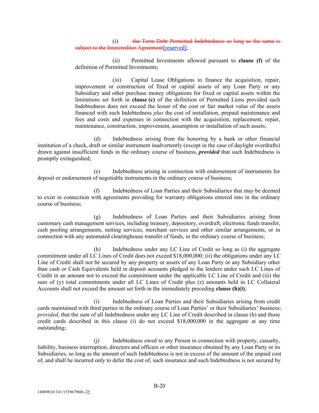(i) the Term Debt Permitted Indebtedness so long as the same is subject to the Intercreditor Agreement[reserved]; (ii) Permitted Investments allowed pursuant to clause (f) of the definition of Permitted Investments; (iii) Capital Lease Obligations to finance the acquisition, repair, improvement or construction of fixed or capital assets of any Loan Party or any Subsidiary and other purchase money obligations for fixed or capital assets within the limitations set forth in clause (c) of the definition of Permitted Liens provided such Indebtedness does not exceed the lesser of the cost or fair market value of the assets financed with such Indebtedness plus the cost of installation, prepaid maintenance and fees and costs and expenses in connection with the acquisition, replacement, repair, maintenance, construction, improvement, assumption or installation of such assets; (d) Indebtedness arising from the honoring by a bank or other financial institution of a check, draft or similar instrument inadvertently (except in the case of daylight overdrafts) drawn against insufficient funds in the ordinary course of business, provided that such Indebtedness is promptly extinguished; (e) Indebtedness arising in connection with endorsement of instruments for deposit or endorsement of negotiable instruments in the ordinary course of business; (f) Indebtedness of Loan Parties and their Subsidiaries that may be deemed to exist in connection with agreements providing for warranty obligations entered into in the ordinary course of business; (g) Indebtedness of Loan Parties and their Subsidiaries arising from customary cash management services, including treasury, depository, overdraft, electronic funds transfer, cash pooling arrangements, netting services, merchant services and other similar arrangements, or in connection with any automated clearinghouse transfer of funds, in the ordinary course of business; (h) Indebtedness under any LC Line of Credit so long as (i) the aggregate commitment under all LC Lines of Credit does not exceed $18,000,000; (ii) the obligations under any LC Line of Credit shall not be secured by any property or assets of any Loan Party or any Subsidiary other than cash or Cash Equivalents held in deposit accounts pledged to the lenders under such LC Lines of Credit in an amount not to exceed the commitment under the applicable LC Line of Credit and (iii) the sum of (y) total commitments under all LC Lines of Credit plus (z) amounts held in LC Collateral Accounts shall not exceed the amount set forth in the immediately preceding clause (h)(i); (i) Indebtedness of Loan Parties and their Subsidiaries arising from credit cards maintained with third parties in the ordinary course of Loan Parties’ or their Subsidiaries’ business; provided, that the sum of all Indebtedness under any LC Line of Credit described in clause (h) and those credit cards described in this clause (i) do not exceed $18,000,000 in the aggregate at any time outstanding; (j) Indebtedness owed to any Person in connection with property, casualty, liability, business interruption, directors and officers or other insurance obtained by any Loan Party or its Subsidiaries, so long as the amount of such Indebtedness is not in excess of the amount of the unpaid cost of, and shall be incurred only to defer the cost of, such insurance and such Indebtedness is not secured by B-20 140690.01141/153967960v.25