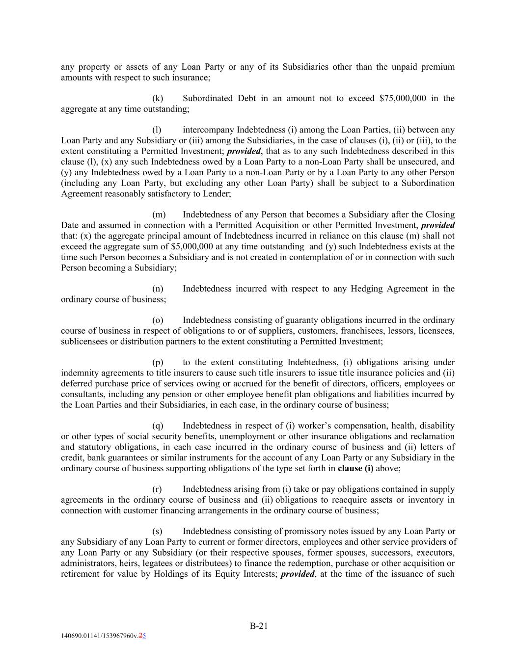 any property or assets of any Loan Party or any of its Subsidiaries other than the unpaid premium amounts with respect to such insurance; (k) Subordinated Debt in an amount not to exceed $75,000,000 in the aggregate at any time outstanding; (l) intercompany Indebtedness (i) among the Loan Parties, (ii) between any Loan Party and any Subsidiary or (iii) among the Subsidiaries, in the case of clauses (i), (ii) or (iii), to the extent constituting a Permitted Investment; provided, that as to any such Indebtedness described in this clause (l), (x) any such Indebtedness owed by a Loan Party to a non-Loan Party shall be unsecured, and (y) any Indebtedness owed by a Loan Party to a non-Loan Party or by a Loan Party to any other Person (including any Loan Party, but excluding any other Loan Party) shall be subject to a Subordination Agreement reasonably satisfactory to Lender; (m) Indebtedness of any Person that becomes a Subsidiary after the Closing Date and assumed in connection with a Permitted Acquisition or other Permitted Investment, provided that: (x) the aggregate principal amount of Indebtedness incurred in reliance on this clause (m) shall not exceed the aggregate sum of $5,000,000 at any time outstanding and (y) such Indebtedness exists at the time such Person becomes a Subsidiary and is not created in contemplation of or in connection with such Person becoming a Subsidiary; (n) Indebtedness incurred with respect to any Hedging Agreement in the ordinary course of business; (o) Indebtedness consisting of guaranty obligations incurred in the ordinary course of business in respect of obligations to or of suppliers, customers, franchisees, lessors, licensees, sublicensees or distribution partners to the extent constituting a Permitted Investment; (p) to the extent constituting Indebtedness, (i) obligations arising under indemnity agreements to title insurers to cause such title insurers to issue title insurance policies and (ii) deferred purchase price of services owing or accrued for the benefit of directors, officers, employees or consultants, including any pension or other employee benefit plan obligations and liabilities incurred by the Loan Parties and their Subsidiaries, in each case, in the ordinary course of business; (q) Indebtedness in respect of (i) worker’s compensation, health, disability or other types of social security benefits, unemployment or other insurance obligations and reclamation and statutory obligations, in each case incurred in the ordinary course of business and (ii) letters of credit, bank guarantees or similar instruments for the account of any Loan Party or any Subsidiary in the ordinary course of business supporting obligations of the type set forth in clause (i) above; (r) Indebtedness arising from (i) take or pay obligations contained in supply agreements in the ordinary course of business and (ii) obligations to reacquire assets or inventory in connection with customer financing arrangements in the ordinary course of business; (s) Indebtedness consisting of promissory notes issued by any Loan Party or any Subsidiary of any Loan Party to current or former directors, employees and other service providers of any Loan Party or any Subsidiary (or their respective spouses, former spouses, successors, executors, administrators, heirs, legatees or distributees) to finance the redemption, purchase or other acquisition or retirement for value by Holdings of its Equity Interests; provided, at the time of the issuance of such B-21 140690.01141/153967960v.25