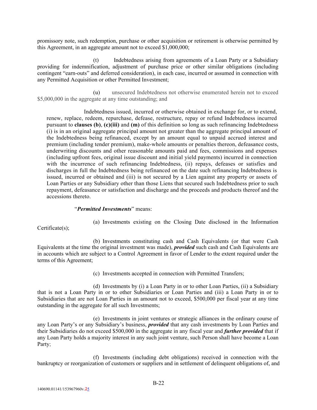 promissory note, such redemption, purchase or other acquisition or retirement is otherwise permitted by this Agreement, in an aggregate amount not to exceed $1,000,000; (t) Indebtedness arising from agreements of a Loan Party or a Subsidiary providing for indemnification, adjustment of purchase price or other similar obligations (including contingent “earn-outs” and deferred consideration), in each case, incurred or assumed in connection with any Permitted Acquisition or other Permitted Investment; (u) unsecured Indebtedness not otherwise enumerated herein not to exceed $5,000,000 in the aggregate at any time outstanding; and Indebtedness issued, incurred or otherwise obtained in exchange for, or to extend, renew, replace, redeem, repurchase, defease, restructure, repay or refund Indebtedness incurred pursuant to clauses (b), (c)(iii) and (m) of this definition so long as such refinancing Indebtedness (i) is in an original aggregate principal amount not greater than the aggregate principal amount of the Indebtedness being refinanced, except by an amount equal to unpaid accrued interest and premium (including tender premium), make-whole amounts or penalties thereon, defeasance costs, underwriting discounts and other reasonable amounts paid and fees, commissions and expenses (including upfront fees, original issue discount and initial yield payments) incurred in connection with the incurrence of such refinancing Indebtedness, (ii) repays, defeases or satisfies and discharges in full the Indebtedness being refinanced on the date such refinancing Indebtedness is issued, incurred or obtained and (iii) is not secured by a Lien against any property or assets of Loan Parties or any Subsidiary other than those Liens that secured such Indebtedness prior to such repayment, defeasance or satisfaction and discharge and the proceeds and products thereof and the accessions thereto. “Permitted Investments” means: (a) Investments existing on the Closing Date disclosed in the Information Certificate(s); (b) Investments constituting cash and Cash Equivalents (or that were Cash Equivalents at the time the original investment was made), provided such cash and Cash Equivalents are in accounts which are subject to a Control Agreement in favor of Lender to the extent required under the terms of this Agreement; (c) Investments accepted in connection with Permitted Transfers; (d) Investments by (i) a Loan Party in or to other Loan Parties, (ii) a Subsidiary that is not a Loan Party in or to other Subsidiaries or Loan Parties and (iii) a Loan Party in or to Subsidiaries that are not Loan Parties in an amount not to exceed, $500,000 per fiscal year at any time outstanding in the aggregate for all such Investments; (e) Investments in joint ventures or strategic alliances in the ordinary course of any Loan Party’s or any Subsidiary’s business, provided that any cash investments by Loan Parties and their Subsidiaries do not exceed $500,000 in the aggregate in any fiscal year and further provided that if any Loan Party holds a majority interest in any such joint venture, such Person shall have become a Loan Party; (f) Investments (including debt obligations) received in connection with the bankruptcy or reorganization of customers or suppliers and in settlement of delinquent obligations of, and B-22 140690.01141/153967960v.25