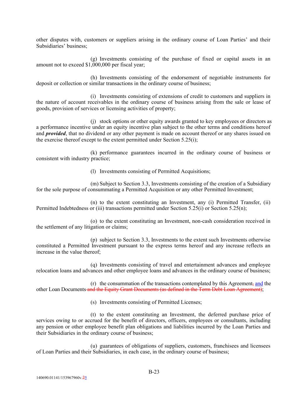 other disputes with, customers or suppliers arising in the ordinary course of Loan Parties’ and their Subsidiaries’ business; (g) Investments consisting of the purchase of fixed or capital assets in an amount not to exceed $1,000,000 per fiscal year; (h) Investments consisting of the endorsement of negotiable instruments for deposit or collection or similar transactions in the ordinary course of business; (i) Investments consisting of extensions of credit to customers and suppliers in the nature of account receivables in the ordinary course of business arising from the sale or lease of goods, provision of services or licensing activities of property; (j) stock options or other equity awards granted to key employees or directors as a performance incentive under an equity incentive plan subject to the other terms and conditions hereof and provided, that no dividend or any other payment is made on account thereof or any shares issued on the exercise thereof except to the extent permitted under Section 5.25(i); (k) performance guarantees incurred in the ordinary course of business or consistent with industry practice; (l) Investments consisting of Permitted Acquisitions; (m) Subject to Section 3.3, Investments consisting of the creation of a Subsidiary for the sole purpose of consummating a Permitted Acquisition or any other Permitted Investment; (n) to the extent constituting an Investment, any (i) Permitted Transfer, (ii) Permitted Indebtedness or (iii) transactions permitted under Section 5.25(i) or Section 5.25(n); (o) to the extent constituting an Investment, non-cash consideration received in the settlement of any litigation or claims; (p) subject to Section 3.3, Investments to the extent such Investments otherwise constituted a Permitted Investment pursuant to the express terms hereof and any increase reflects an increase in the value thereof; (q) Investments consisting of travel and entertainment advances and employee relocation loans and advances and other employee loans and advances in the ordinary course of business; (r) the consummation of the transactions contemplated by this Agreement, and the other Loan Documents and the Equity Grant Documents (as defined in the Term Debt Loan Agreement); (s) Investments consisting of Permitted Licenses; (t) to the extent constituting an Investment, the deferred purchase price of services owing to or accrued for the benefit of directors, officers, employees or consultants, including any pension or other employee benefit plan obligations and liabilities incurred by the Loan Parties and their Subsidiaries in the ordinary course of business; (u) guarantees of obligations of suppliers, customers, franchisees and licensees of Loan Parties and their Subsidiaries, in each case, in the ordinary course of business; B-23 140690.01141/153967960v.25