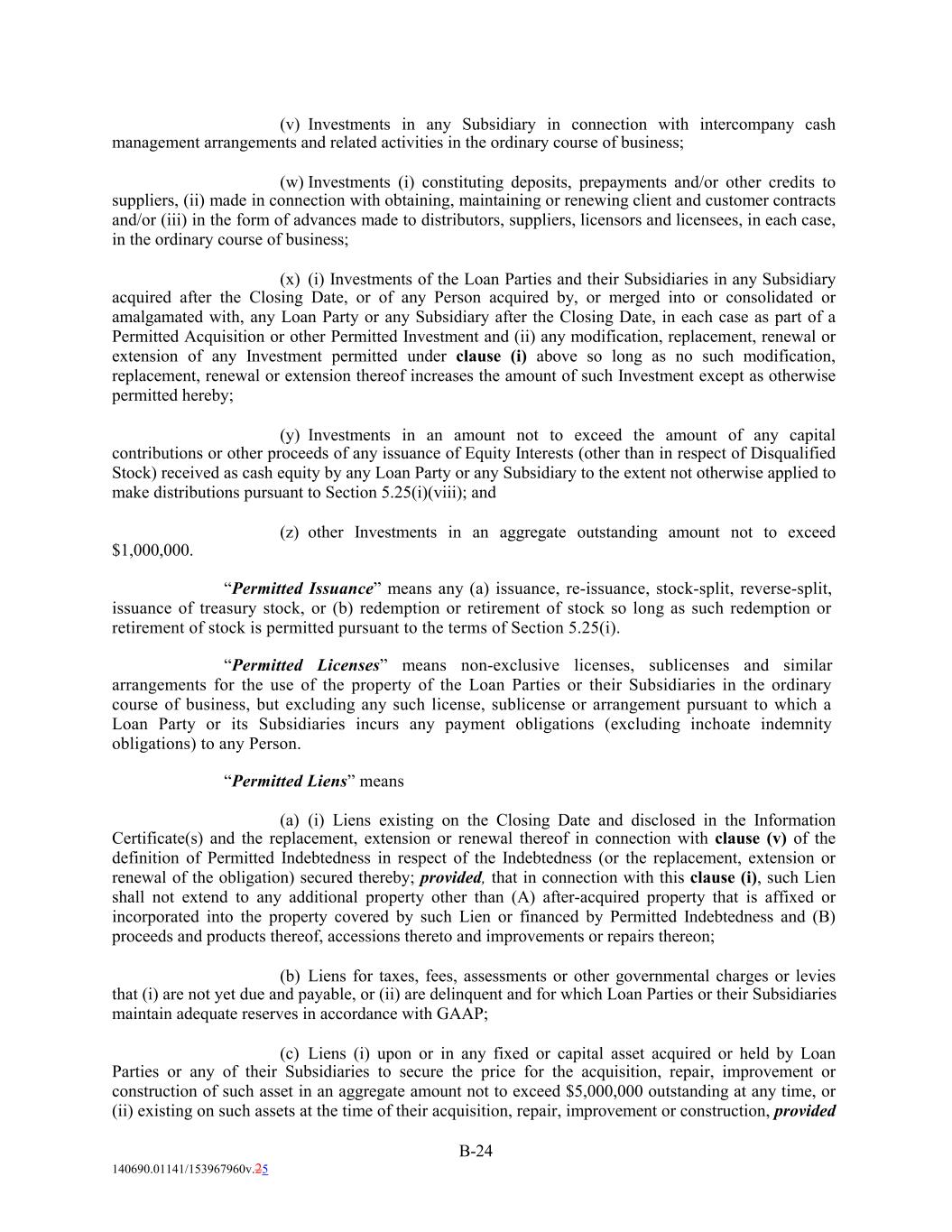 (v) Investments in any Subsidiary in connection with intercompany cash management arrangements and related activities in the ordinary course of business; (w) Investments (i) constituting deposits, prepayments and/or other credits to suppliers, (ii) made in connection with obtaining, maintaining or renewing client and customer contracts and/or (iii) in the form of advances made to distributors, suppliers, licensors and licensees, in each case, in the ordinary course of business; (x) (i) Investments of the Loan Parties and their Subsidiaries in any Subsidiary acquired after the Closing Date, or of any Person acquired by, or merged into or consolidated or amalgamated with, any Loan Party or any Subsidiary after the Closing Date, in each case as part of a Permitted Acquisition or other Permitted Investment and (ii) any modification, replacement, renewal or extension of any Investment permitted under clause (i) above so long as no such modification, replacement, renewal or extension thereof increases the amount of such Investment except as otherwise permitted hereby; (y) Investments in an amount not to exceed the amount of any capital contributions or other proceeds of any issuance of Equity Interests (other than in respect of Disqualified Stock) received as cash equity by any Loan Party or any Subsidiary to the extent not otherwise applied to make distributions pursuant to Section 5.25(i)(viii); and (z) other Investments in an aggregate outstanding amount not to exceed $1,000,000. “Permitted Issuance” means any (a) issuance, re-issuance, stock-split, reverse-split, issuance of treasury stock, or (b) redemption or retirement of stock so long as such redemption or retirement of stock is permitted pursuant to the terms of Section 5.25(i). “Permitted Licenses” means non-exclusive licenses, sublicenses and similar arrangements for the use of the property of the Loan Parties or their Subsidiaries in the ordinary course of business, but excluding any such license, sublicense or arrangement pursuant to which a Loan Party or its Subsidiaries incurs any payment obligations (excluding inchoate indemnity obligations) to any Person. “Permitted Liens” means (a) (i) Liens existing on the Closing Date and disclosed in the Information Certificate(s) and the replacement, extension or renewal thereof in connection with clause (v) of the definition of Permitted Indebtedness in respect of the Indebtedness (or the replacement, extension or renewal of the obligation) secured thereby; provided, that in connection with this clause (i), such Lien shall not extend to any additional property other than (A) after-acquired property that is affixed or incorporated into the property covered by such Lien or financed by Permitted Indebtedness and (B) proceeds and products thereof, accessions thereto and improvements or repairs thereon; (b) Liens for taxes, fees, assessments or other governmental charges or levies that (i) are not yet due and payable, or (ii) are delinquent and for which Loan Parties or their Subsidiaries maintain adequate reserves in accordance with GAAP; (c) Liens (i) upon or in any fixed or capital asset acquired or held by Loan Parties or any of their Subsidiaries to secure the price for the acquisition, repair, improvement or construction of such asset in an aggregate amount not to exceed $5,000,000 outstanding at any time, or (ii) existing on such assets at the time of their acquisition, repair, improvement or construction, provided B-24 140690.01141/153967960v.25