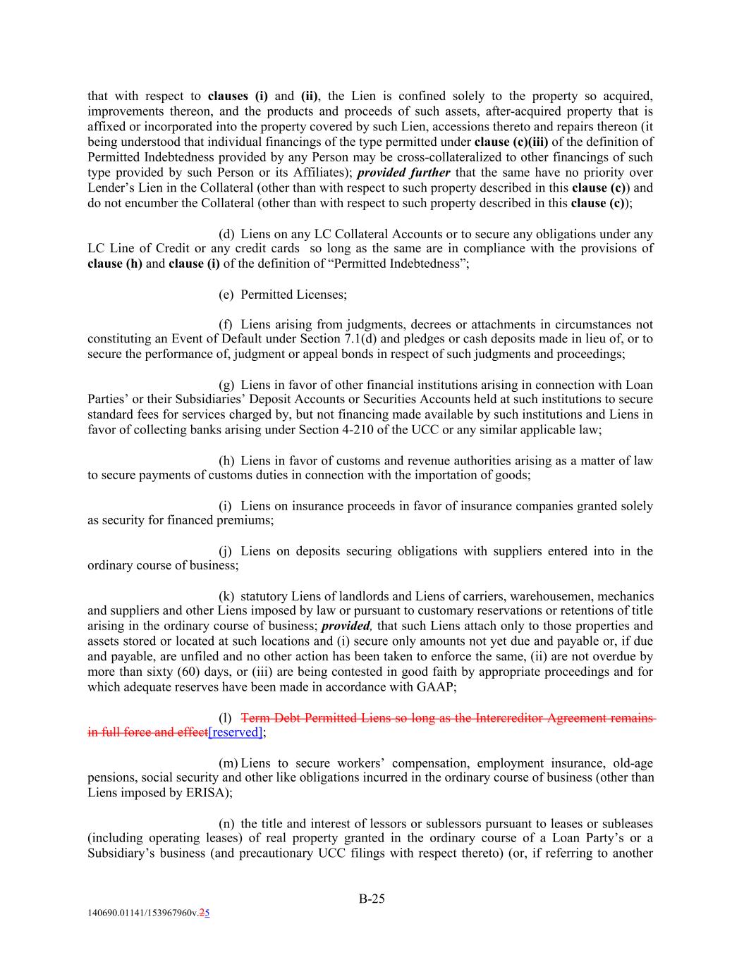 that with respect to clauses (i) and (ii), the Lien is confined solely to the property so acquired, improvements thereon, and the products and proceeds of such assets, after-acquired property that is affixed or incorporated into the property covered by such Lien, accessions thereto and repairs thereon (it being understood that individual financings of the type permitted under clause (c)(iii) of the definition of Permitted Indebtedness provided by any Person may be cross-collateralized to other financings of such type provided by such Person or its Affiliates); provided further that the same have no priority over Lender’s Lien in the Collateral (other than with respect to such property described in this clause (c)) and do not encumber the Collateral (other than with respect to such property described in this clause (c)); (d) Liens on any LC Collateral Accounts or to secure any obligations under any LC Line of Credit or any credit cards so long as the same are in compliance with the provisions of clause (h) and clause (i) of the definition of “Permitted Indebtedness”; (e) Permitted Licenses; (f) Liens arising from judgments, decrees or attachments in circumstances not constituting an Event of Default under Section 7.1(d) and pledges or cash deposits made in lieu of, or to secure the performance of, judgment or appeal bonds in respect of such judgments and proceedings; (g) Liens in favor of other financial institutions arising in connection with Loan Parties’ or their Subsidiaries’ Deposit Accounts or Securities Accounts held at such institutions to secure standard fees for services charged by, but not financing made available by such institutions and Liens in favor of collecting banks arising under Section 4-210 of the UCC or any similar applicable law; (h) Liens in favor of customs and revenue authorities arising as a matter of law to secure payments of customs duties in connection with the importation of goods; (i) Liens on insurance proceeds in favor of insurance companies granted solely as security for financed premiums; (j) Liens on deposits securing obligations with suppliers entered into in the ordinary course of business; (k) statutory Liens of landlords and Liens of carriers, warehousemen, mechanics and suppliers and other Liens imposed by law or pursuant to customary reservations or retentions of title arising in the ordinary course of business; provided, that such Liens attach only to those properties and assets stored or located at such locations and (i) secure only amounts not yet due and payable or, if due and payable, are unfiled and no other action has been taken to enforce the same, (ii) are not overdue by more than sixty (60) days, or (iii) are being contested in good faith by appropriate proceedings and for which adequate reserves have been made in accordance with GAAP; (l) Term Debt Permitted Liens so long as the Intercreditor Agreement remains in full force and effect[reserved]; (m) Liens to secure workers’ compensation, employment insurance, old-age pensions, social security and other like obligations incurred in the ordinary course of business (other than Liens imposed by ERISA); (n) the title and interest of lessors or sublessors pursuant to leases or subleases (including operating leases) of real property granted in the ordinary course of a Loan Party’s or a Subsidiary’s business (and precautionary UCC filings with respect thereto) (or, if referring to another B-25 140690.01141/153967960v.25